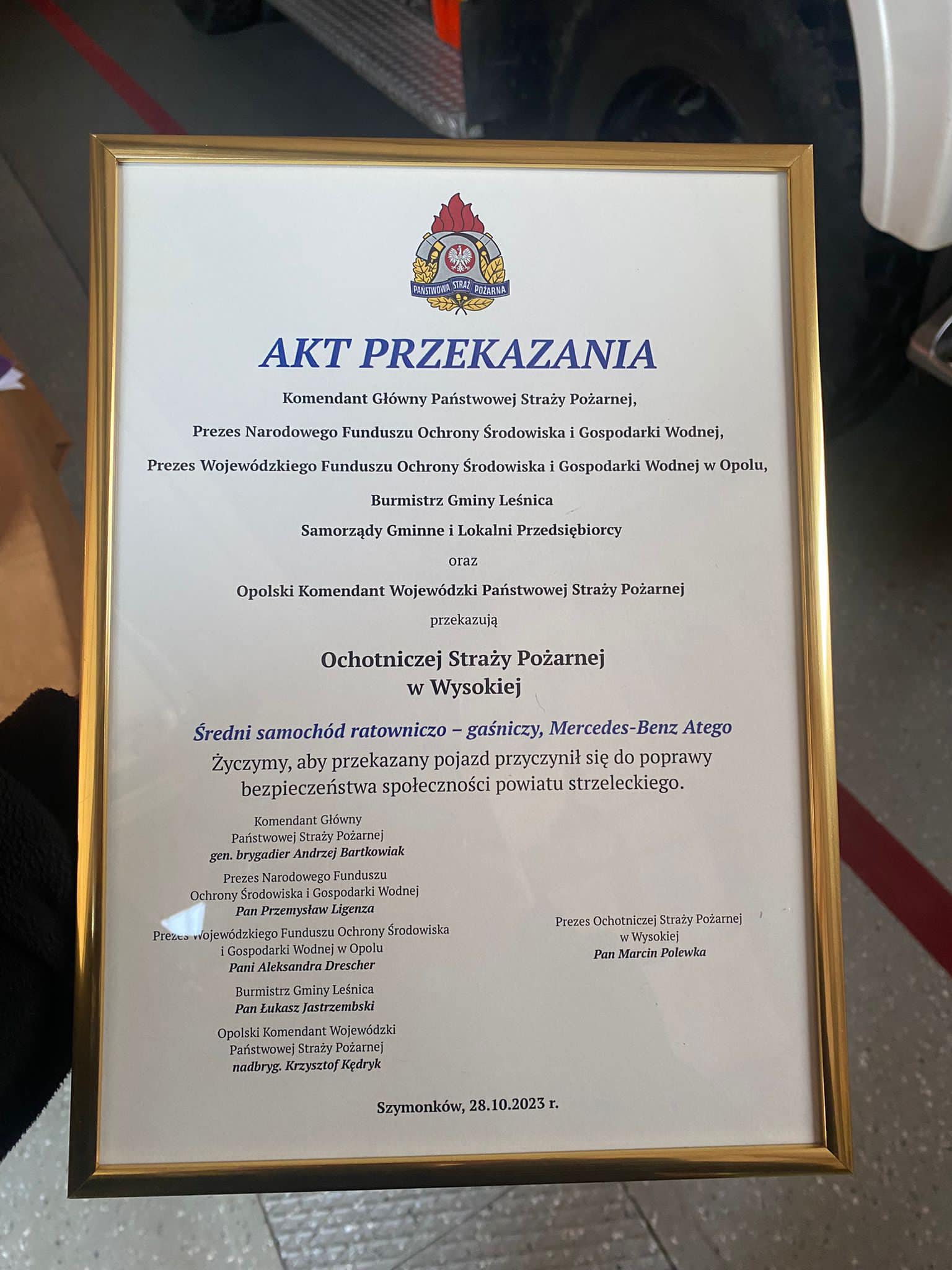 28 października 2023 roku w Wysokiej miało miejsce uroczyste przekazanie samochodu ratowniczo-gaśniczego GBARt 3,5/30 marki Mercedes dla Ochotniczej Straży Pożarnej w Wysokiej. Przekazania dokonali: st. bryg. Dariusz Gieroń zastępca komendanta wojewódzkiego Państwowej Straży Pożarnej w Opolu, Pan Jerzy Naszkiewicz Zastępca Prezesa Zarządu Wojewódzkiego Funduszu Ochrony Środowiska i Gospodarki Wodnej w Opolu oraz Pan Łukasz Jastrzębski Burmistrz Leśnicy.