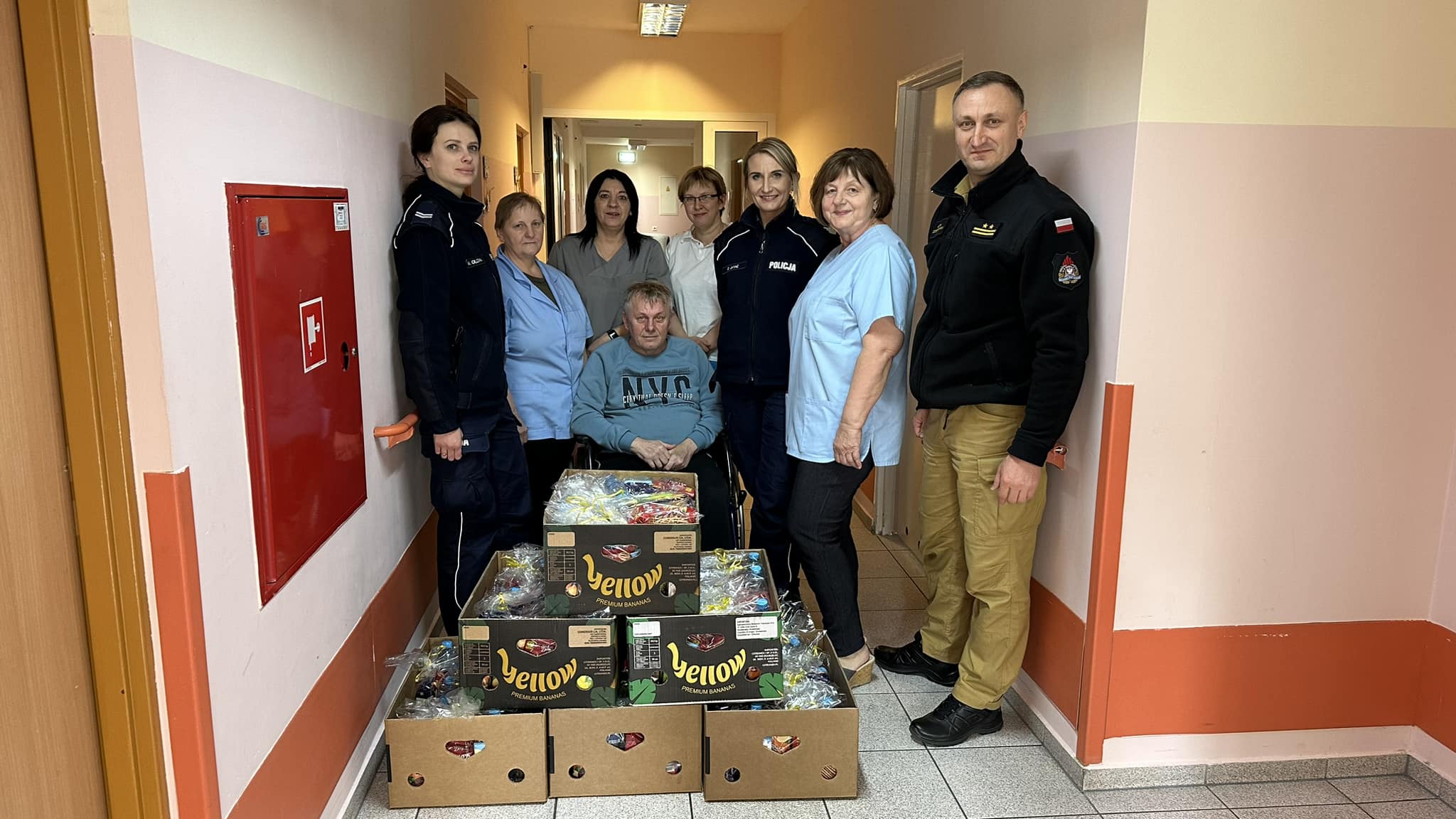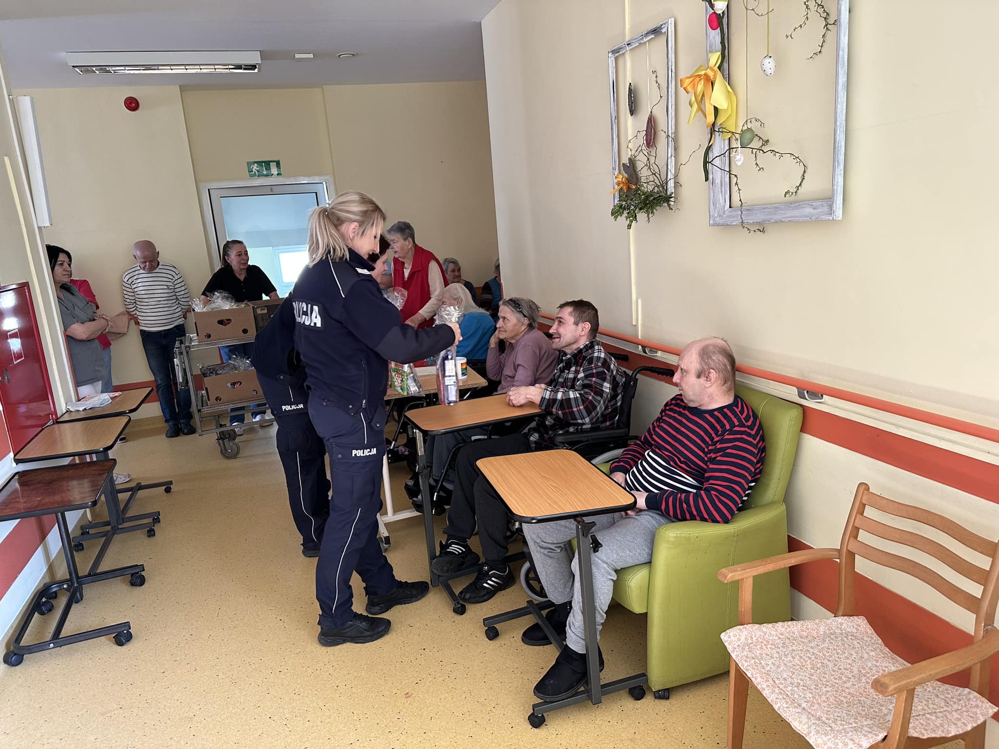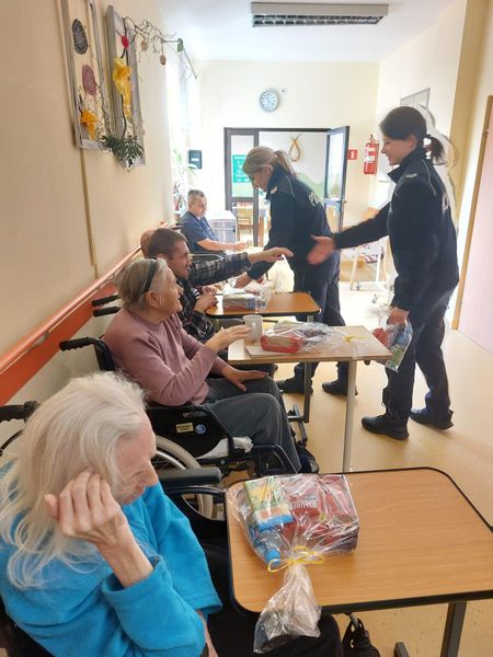 6 kwietnia 2023 r. Policuś, strzeleckie policjantki i nasz strażak odwiedzili podopiecznych, przebywających w Domu Pomocy Społecznej w Strzelcach Opolskich.