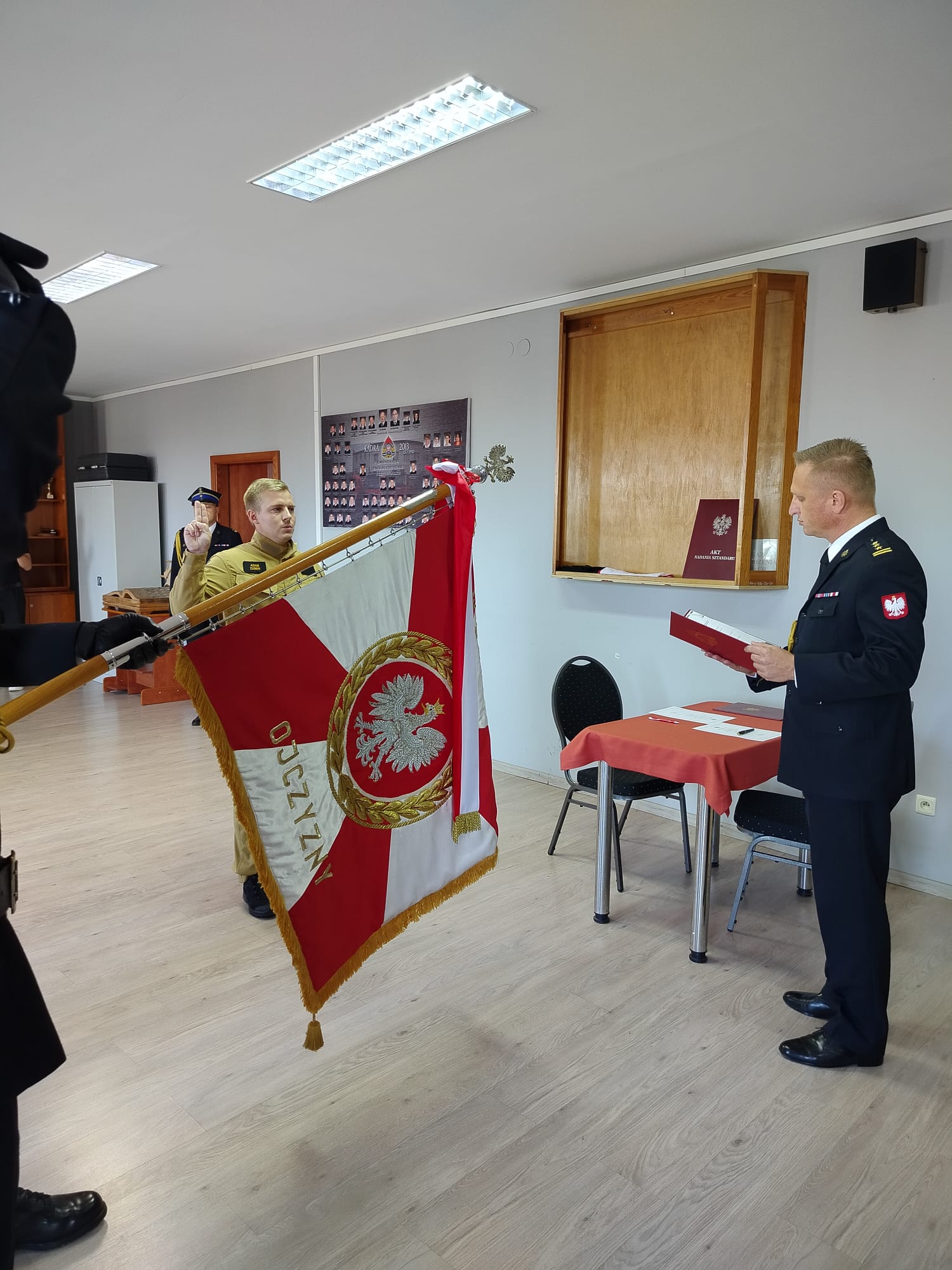 Strażak w obecności funkcjonariuszy, pracowników cywilnych złożył uroczyste ślubowanie, które przyjął Komendant Powiatowy PSP w Strzelcach Opolskich st. bryg. Paweł Poliwoda. W trakcie uroczystości ślubującemu strażakowi towarzyszyli najbliżsi.