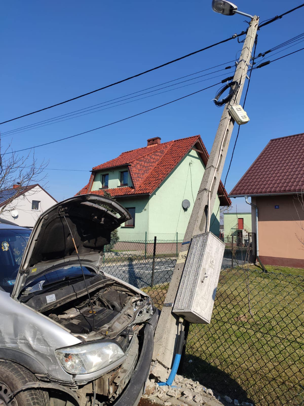 Nieprawidłowy manewr wyprzedzania - zderzenie dwóch pojazdów i uszkodzony słup energetyczny.