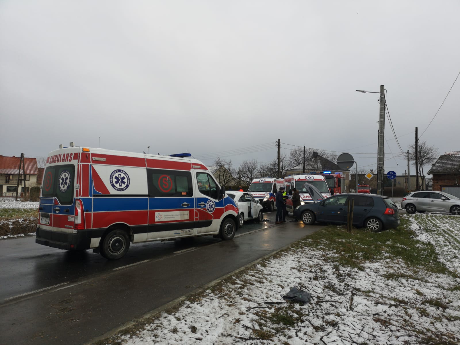 Po przybyciu na miejsce pierwszego zastępu na miejscu zdarzenia działania medyczne prowadził zespół transportu medycznego jadący z pacjentem (karetka specjalistyczna z lekarzem). Kierujący działaniem ratowniczym w wyniku rozpoznania stwierdził zderzenie dwóch samochodów osobowych, w których podróżowało 5 osób w tym dwoje małych dzieci. Poszkodowani znajdowali poza pojazdami.