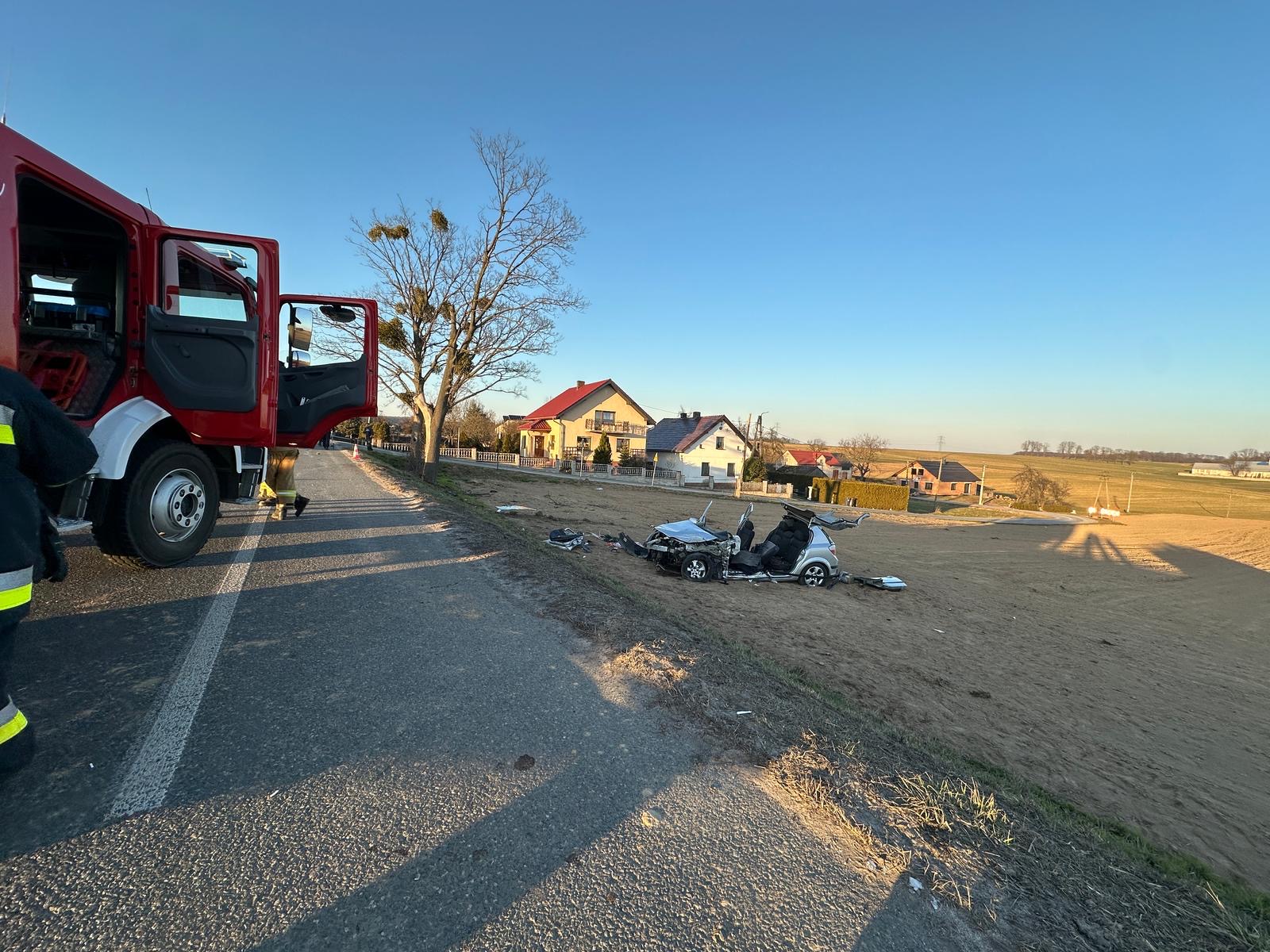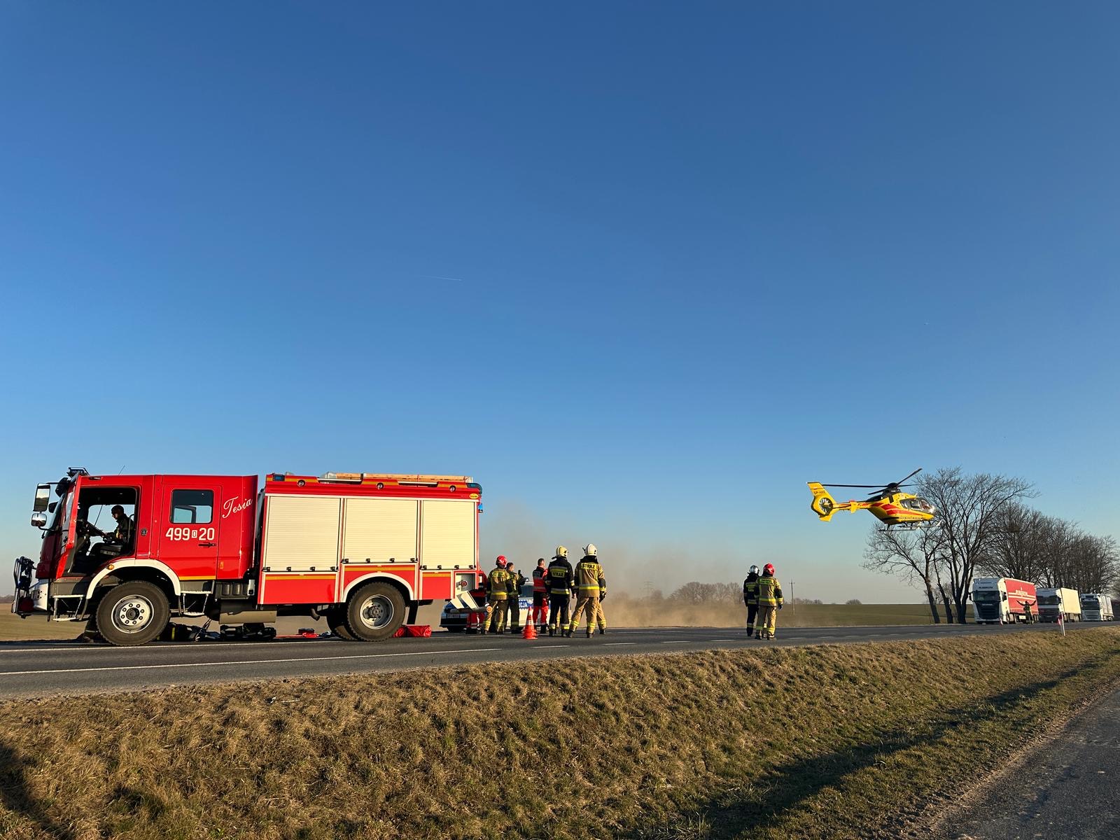 Po przybyciu na miejsce zdarzenia strażacy ustalili, że samochód osobowy zjechał z drogi i dachował. Samochodem podróżował tylko kierowca, który został zakleszczony w pojeździe. Droga na czas prowadzonych działań ratowniczych była całkowicie zablokowana. Na miejscu zdarzenia lądował śmigłowiec Lotniczego Pogotowia Ratunkowego.
