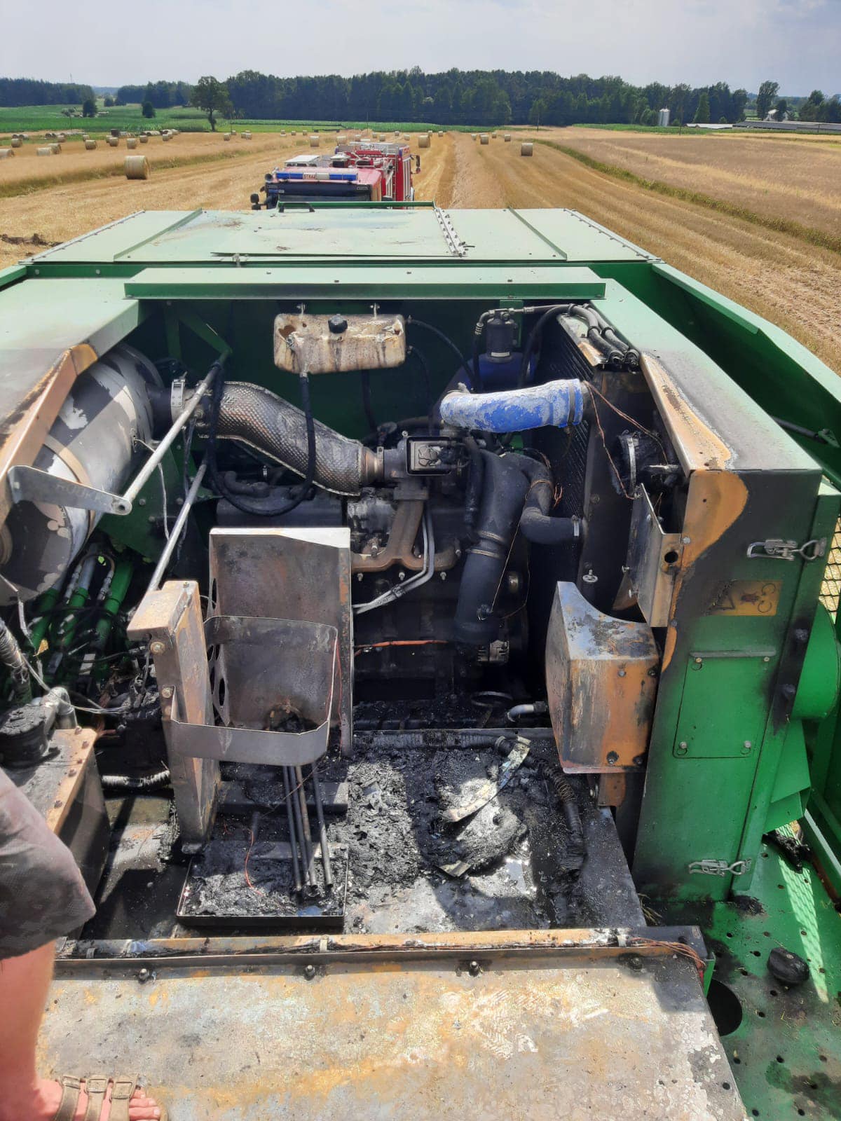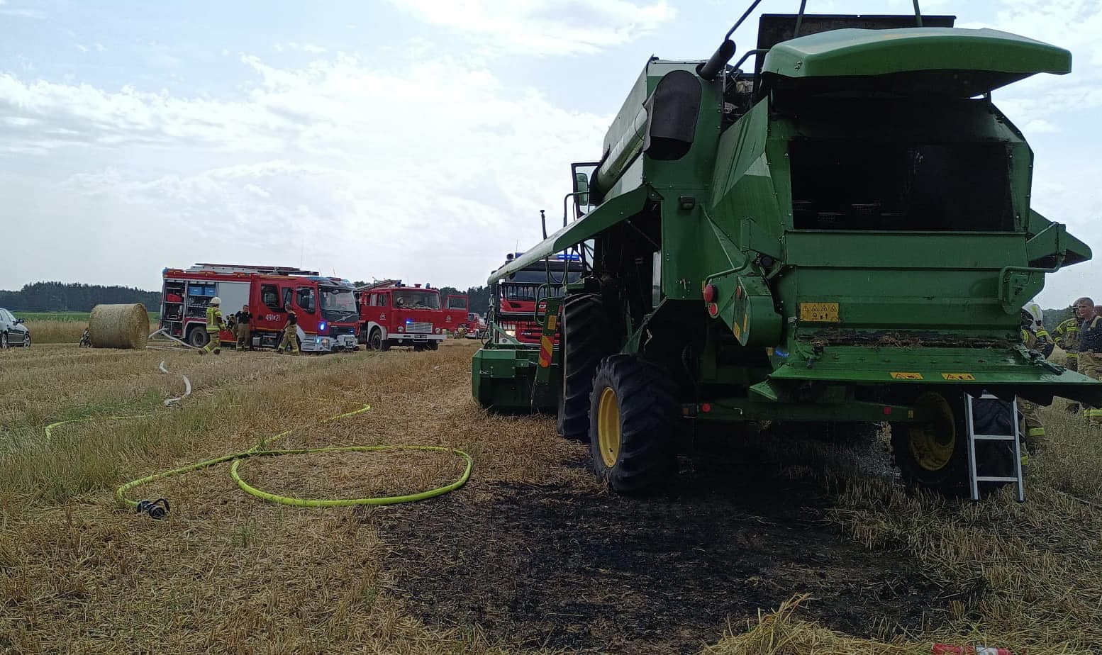 - Godzina 14:02 pożar w przestrzeni silnika kombajnu w trakcie koszenia zboża w miejscowości Jędrynie. Operator przy pomocy podręcznych gaśnic podjął próbę ugaszenia zarzewi ognia.
