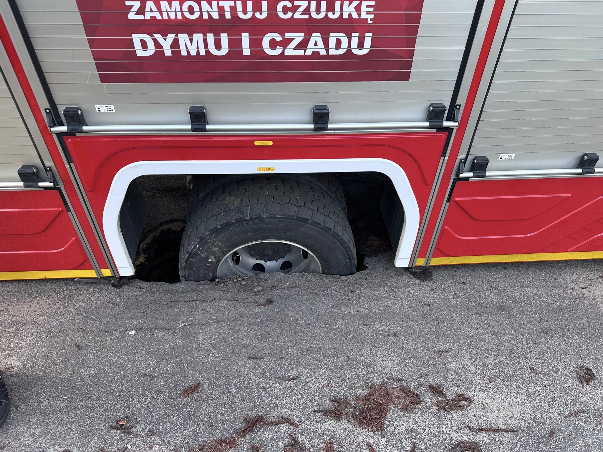 W trakcie dojazdu do miejsca zdarzenia na ul. Ks. Wajdy w Zawadzkiem pod samochodem Jednostki Ratowniczo-Gaśniczej w Strzelcach Opolskich zapadł się przepust drogowy, co uniemożliwiło dalszy przejazd pojazdu.