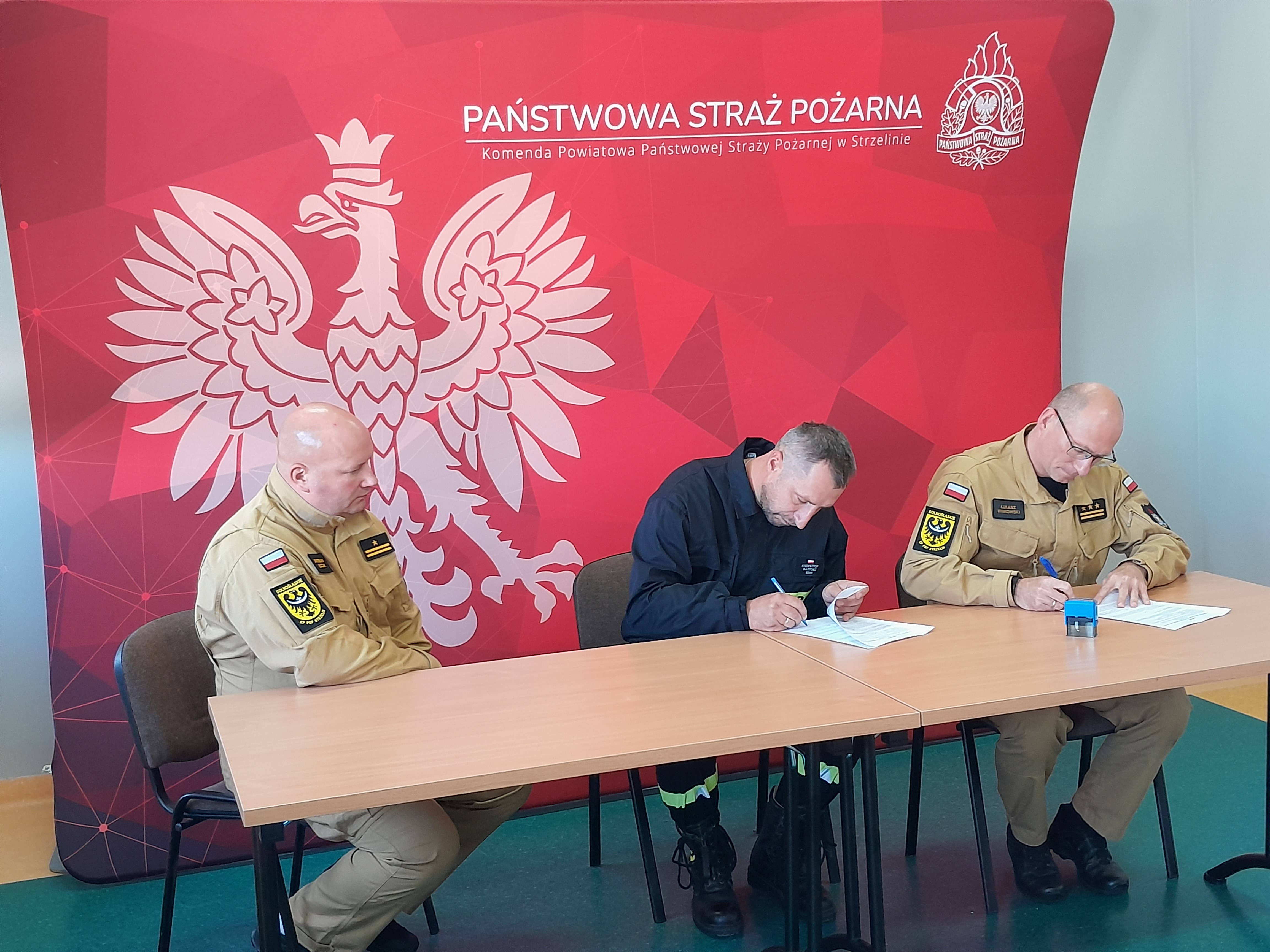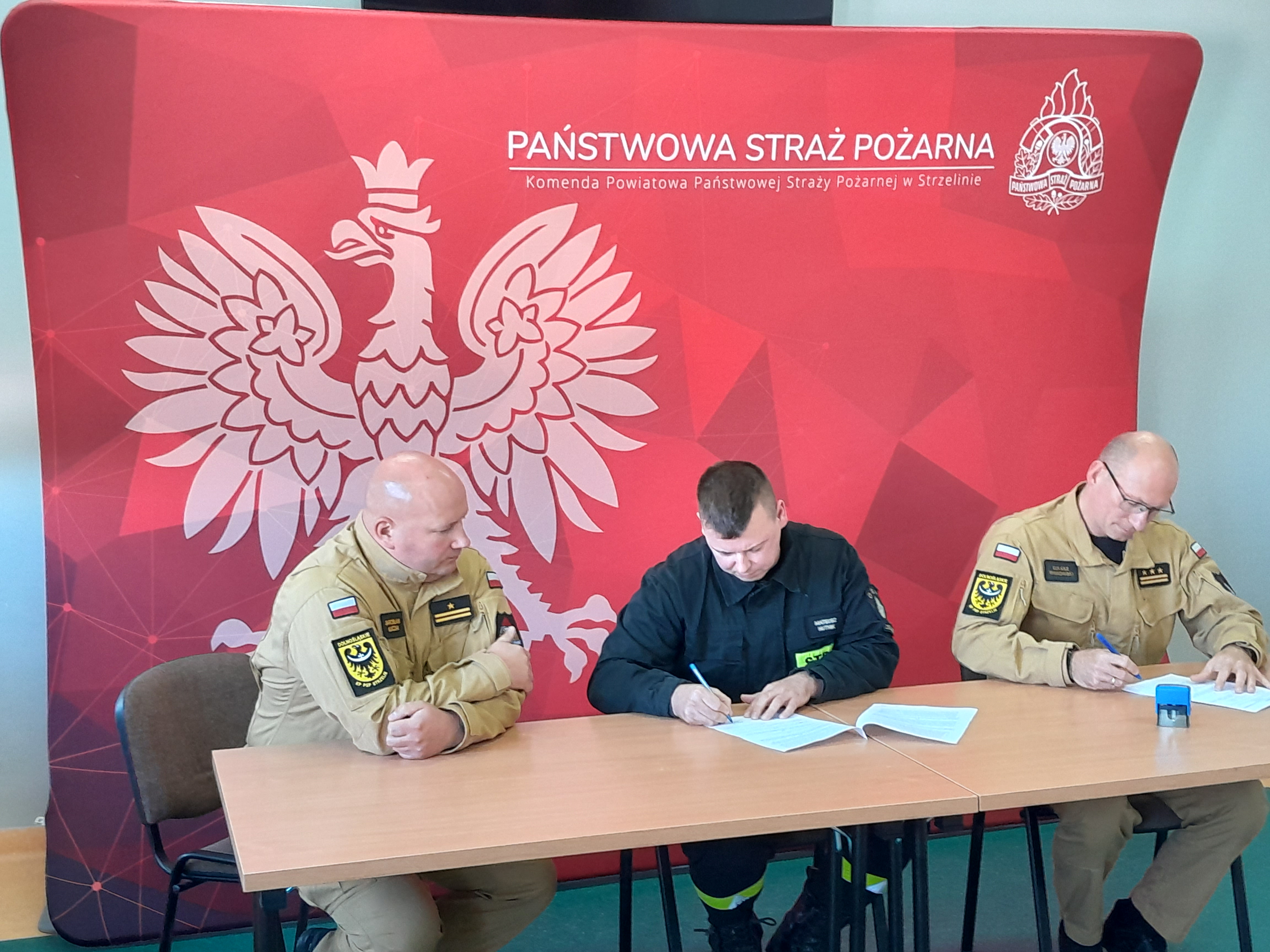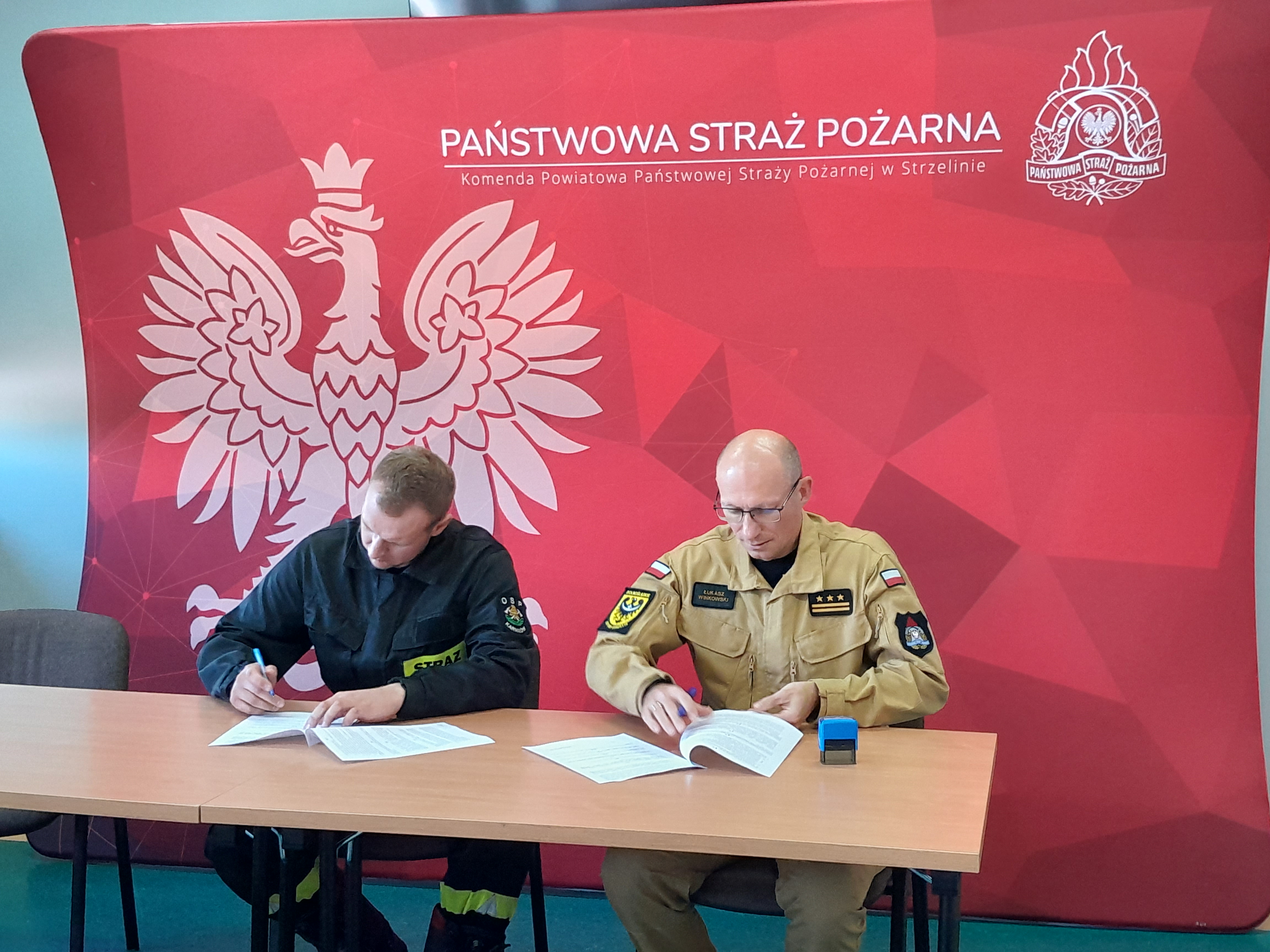 W dniu 23 października 2023 roku w Komendzie Powiatowej Państwowej Straży Pożarnej w Strzelinie, zgodnie z art. 11 ust. 3 ustawy o ochotniczych strażach pożarnych nastąpiło podpisanie umowy pomiędzy Komendantem Powiatowym Państwowej Straży Pożarnej w Strzelinie st.bryg. Łukaszem Winkowskim, a Druhami Ochotniczych Straży Pożarnych z terenu powiatu strzelińskiego, dotyczącej udziału w szkoleniu przygotowującym do przystąpienia do egzaminu uprawniającego do kierowania pojazdem o dopuszczalnej masie całkowitej przekraczającej 3,5 t. Na szkolenie skierowani zostali: