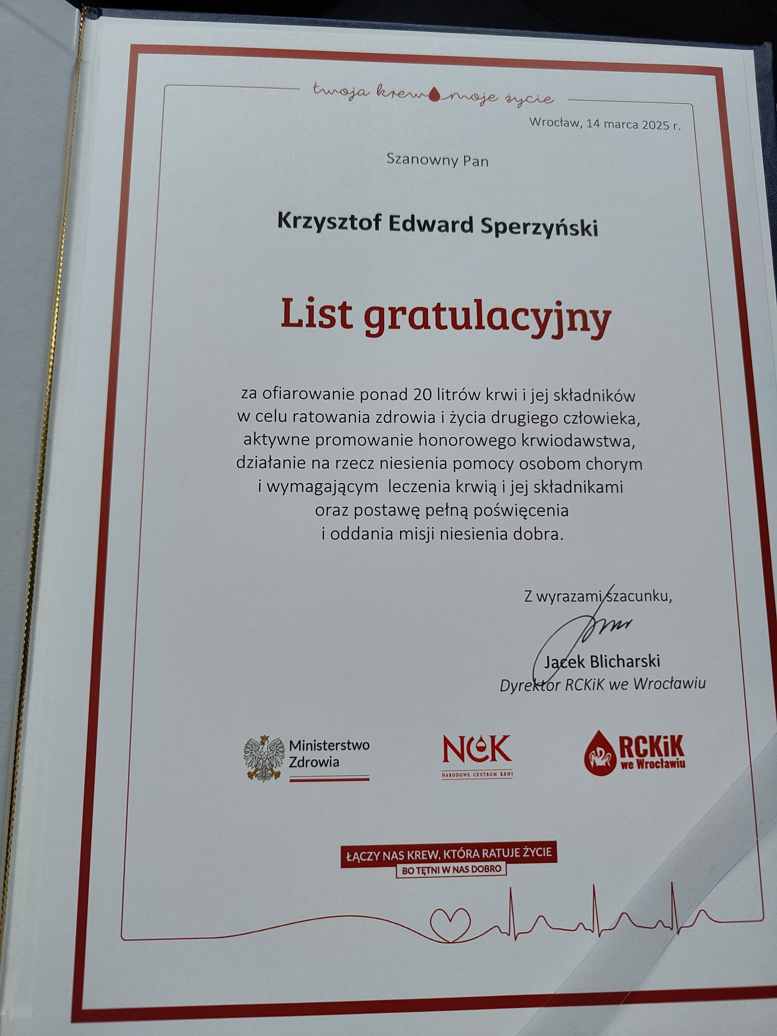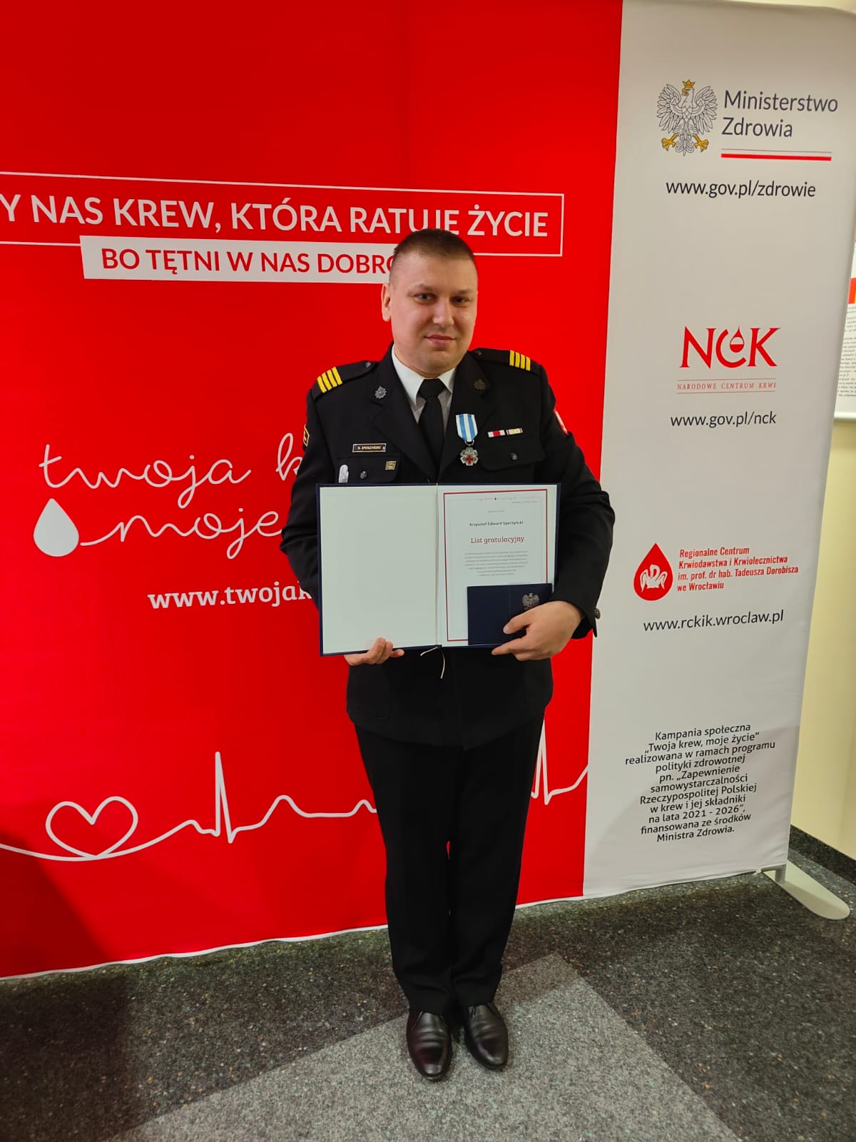 14 marca 2025 roku funkcjonariusz Komendy Powiatowej Państwowej Straży Pożarnej w Strzelinie – mł. ogn. Krzysztof Sperzyński odebrał odznaczenie „Honorowy Dawca Krwi Zasłużony dla Zdrowia Narodu” nadane przez Ministra Zdrowia, a także list gratulacyjny za ofiarowanie ponad 20 litrów krwi i jej składników w celu ratowania zdrowia i życia drugiego człowieka. Uroczystość odbyła się w auli RCKiK we Wrocławiu przy ulicy Czerwonego Krzyża 5/9.
