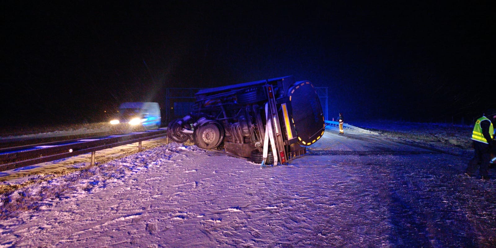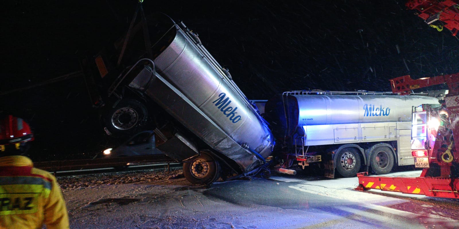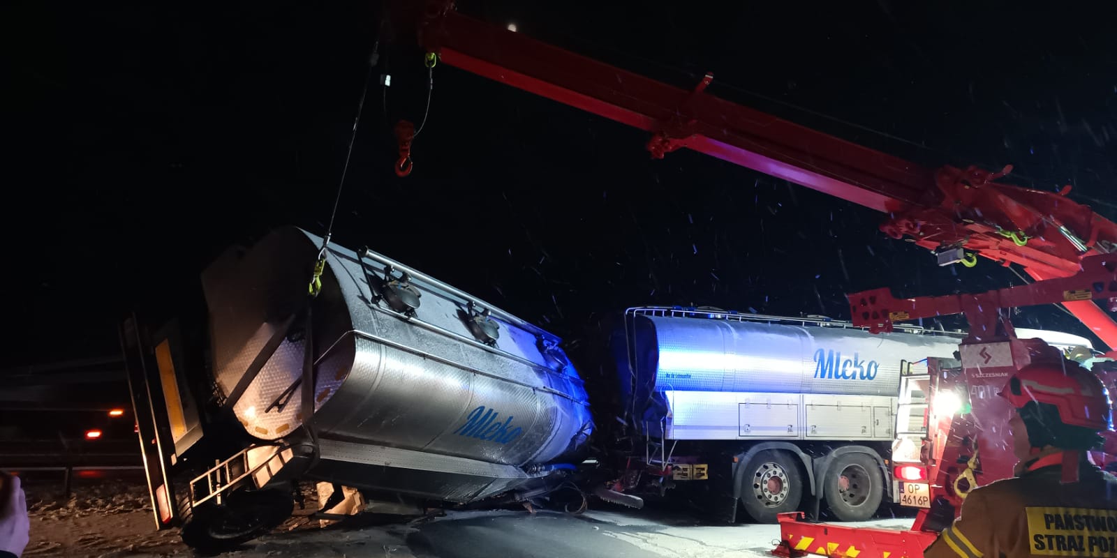We wtorek 28 listopada 2023 roku w godzinach popołudniowych do Stanowiska Kierowania Komendanta Powiatowego Państwowej Straży Pożarnej w Strzelinie wpłynęło zgłoszenie z Centrum Powiadamiania Ratunkowego we Wrocławiu dotyczące kolizji samochodu ciężarowego na autostradzie A4 na wysokości 180,9 km. Po przyjęciu zgłoszenia Dyżurny strzelińskiej straży do akcji skierował dwa zastępy Państwowej Straży Pożarnej w Strzelinie oraz zastęp Ochotniczej Straży Pożarnej w Wiązowie, które już po dwunastu minutach od momentu zadysponowania dotarły na miejsce. Po przeprowadzonym rozpoznaniu przez kierującego działaniem ratowniczym potwierdzono przewrócenie się przyczepy cysterny w poprzek drogi, blokując przejazd autostradą w kierunku Katowic. W zdarzeniu nie było osób poszkodowanych. Ze względu na charakter zdarzenia i utrudnienia atmosferyczne na miejsce zdarzenia zadysponowano Specjalistyczną Grupę Ratownictwa Technicznego, która przy wsparciu zastępów z powiatu strzelińskiego udrożniła drogę. Policja wraz z przedstawicielami zarządcy drogi w godzinach wieczornych przywróciła ruch kołowy na drodze.