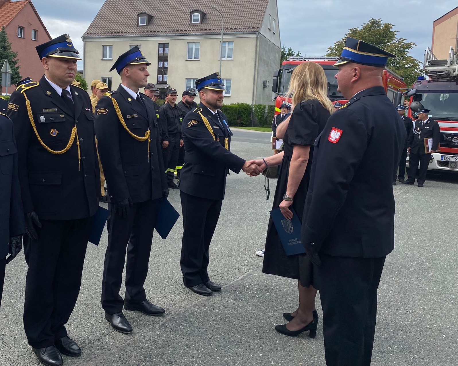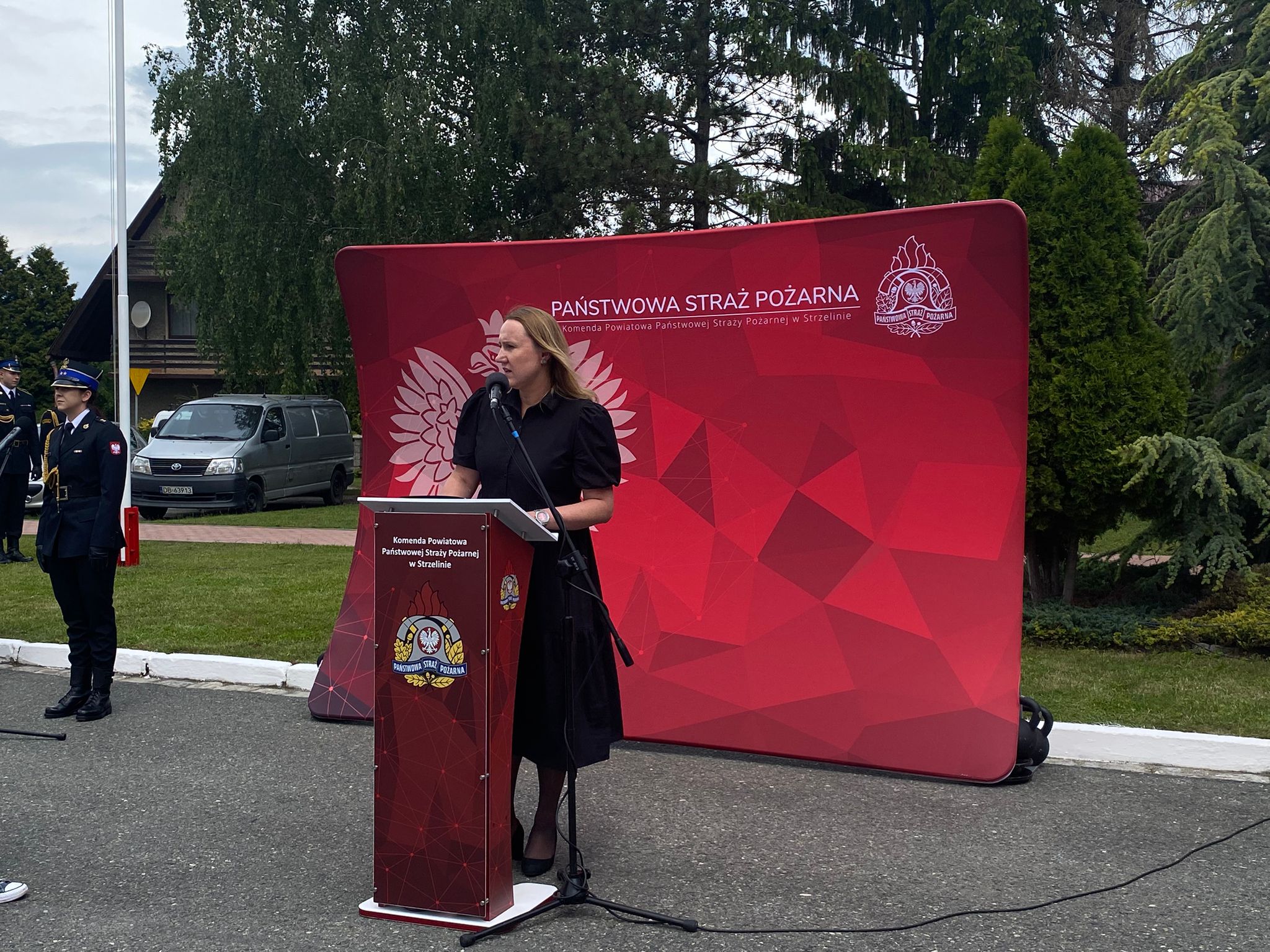 Podczas uroczystości Starosta Powiatu Strzelińskiego Pani Magdalena Krupa wręczyła dyplomy oraz nagrody pieniężne dla dyżurny Stanowiska Komendanta Powiatowego PSP w Strzelinie za wzorowe wykonywanie zadań służbowych, związanych z zarządzaniem kryzysowym.