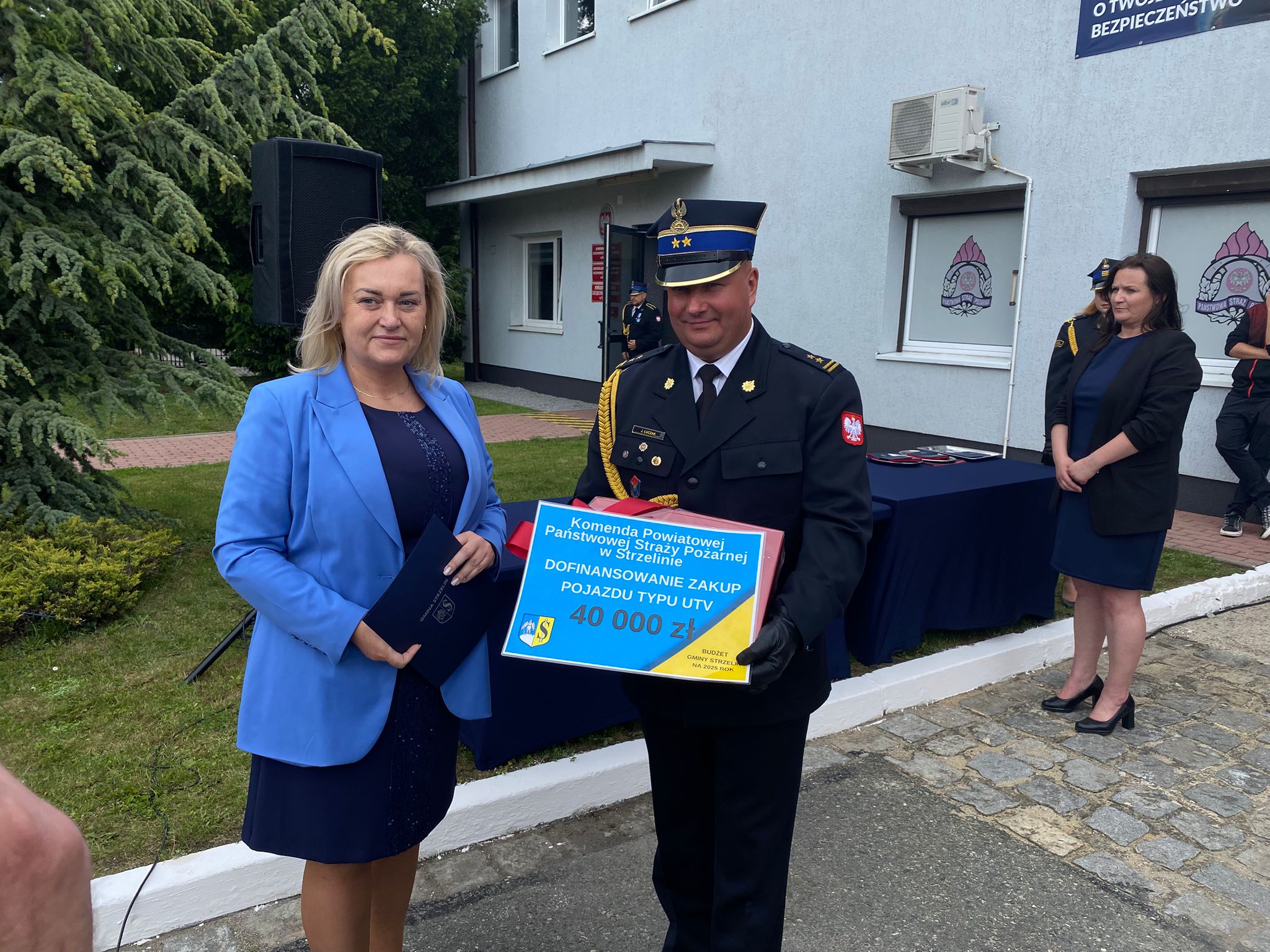 W trakcie swojego przemówienia Burmistrz Miasta i Gminy Strzelin Pani Dorota Pawnuk wręczyła bryg. Jarosławowi Łuczakowi dofinansowanie na zakup pojazdu typu UTV dla Komendy Powiatowej w Strzelinie w kwocie 40 000 zł.