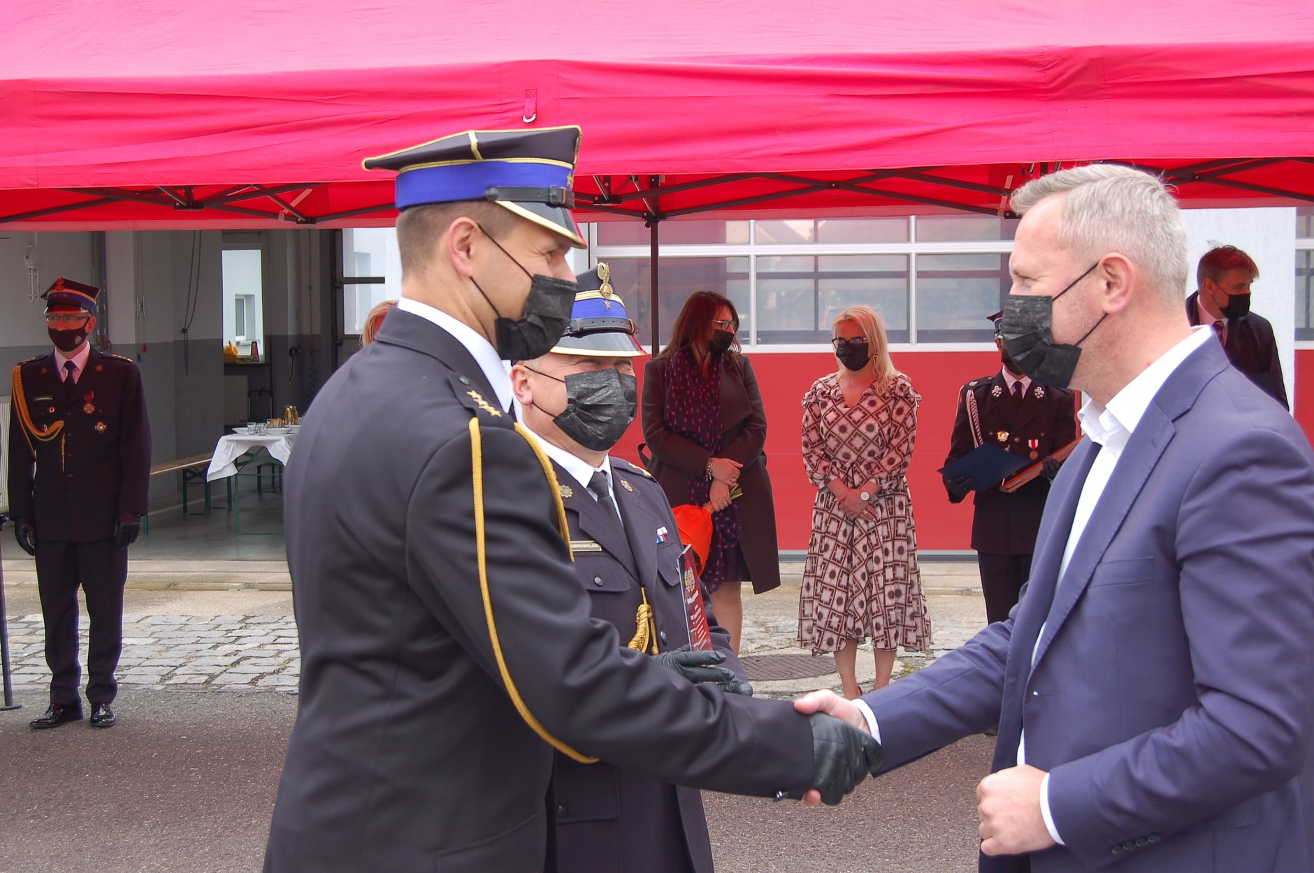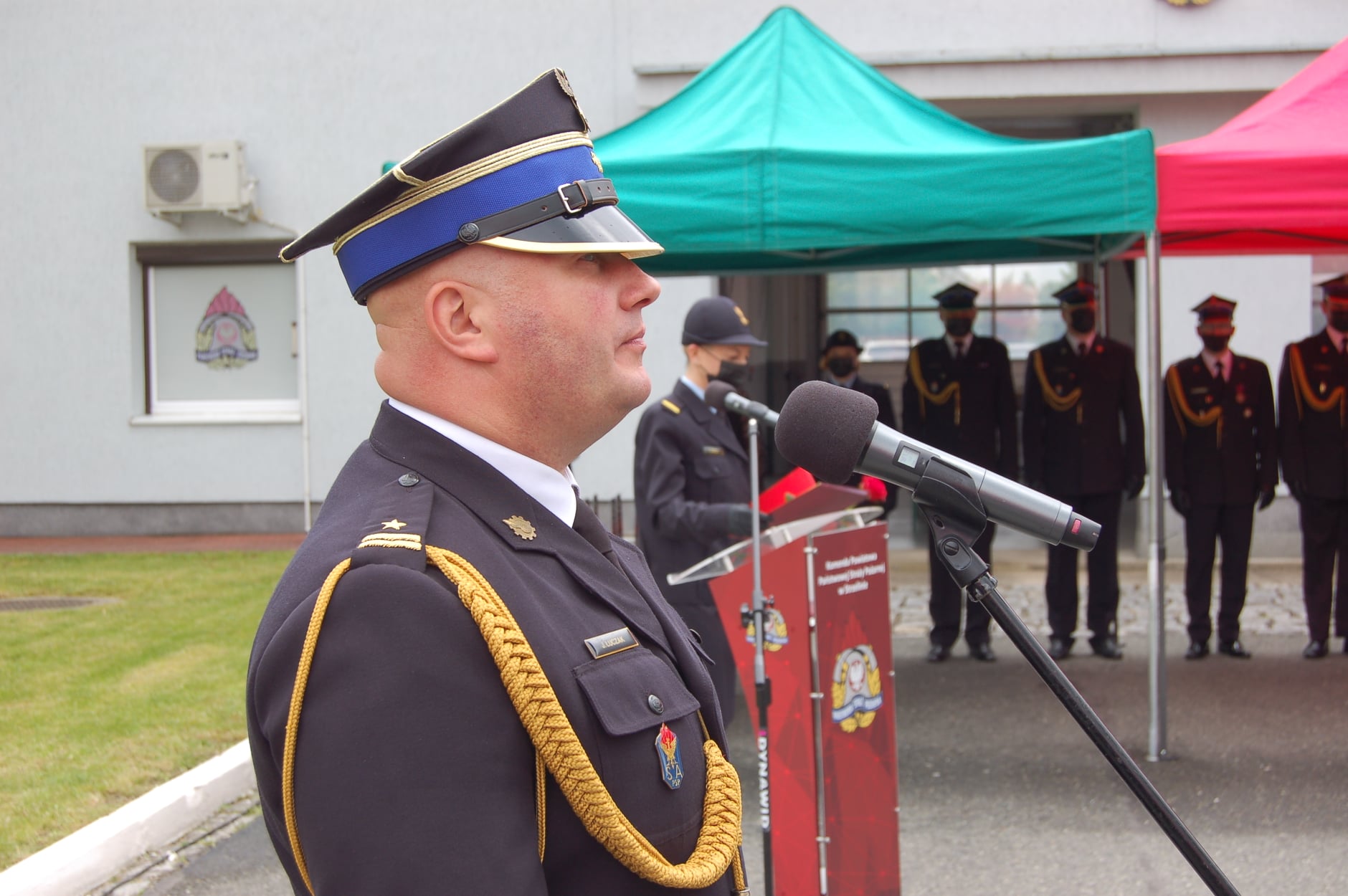 Bardzo uroczyście, lecz z pandemicznymi obostrzeniami i w skromniejszym niż zazwyczaj gronie odbyły się w dniu 28 maja tegoroczne Powiatowe Obchody Dnia Strażaka w Strzelinie. Meldunek o gotowości pododdziałów do apelu złożył st.bryg. Łukaszowi Winkowskiemu Naczelnikowi Wydziału Kadr Komendy Wojewódzkiej Państwowej Straży Pożarnej we Wrocławiu, dowódca uroczystości - mł. bryg. Jarosław Łuczak - zastępca komendanta powiatowego. Następnie głos zabrał Komendant Powiatowy PSP w Strzelinie st.kpt. Michał Pięta, który poprosił wszystkich zebranych o uczczenie minutą ciszy tych strażaków, którzy przegrali walkę z chorobą COVID-19. W szczególności wspomniano zmarłego 28 kwietnia 2021 roku mł. ogn. Marcina Partyczkę,