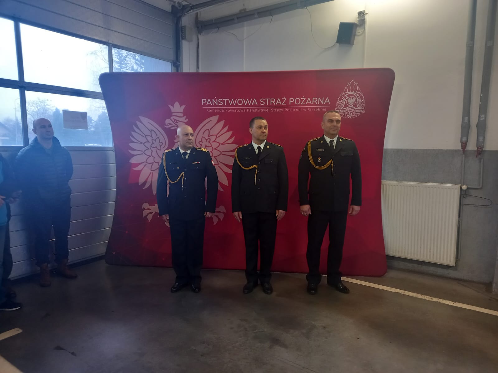 24 lutego 2023 roku w Komendzie Powiatowej Państwowej Straży Pożarnej w Strzelinie, odbyła się uroczystość związana z odejściem na zaopatrzenie emerytalne funkcjonariuszy pełniących służbę w Państwowej Straży Pożarnej w Strzelinie: aspiranta sztabowego Przemysława Rogana, starszego ogniomistrza Damiana Gierczaka, starszego ogniomistrza Radosława Jurka oraz starszego ogniomistrza Pawła Wojdyły. Meldunek o gotowości pododdziałów do zbiórki, złożył starszemu brygadierowi Łukaszowi Winkowskiemu Komendowi Powiatowemu Państwowej Straży Pożarnej w Strzelinie, dowódca uroczystości – młodszy brygadier Jarosław Łuczak. Następnie głos zabrał Komendant Powiatowy PSP w Strzelinie, który w serdecznych słowach przywitał przybyłych na dzisiejszą uroczystość, członków rodzin, strażaków emerytów na czele z młodszym brygadierem w stanie spoczynku Krzysztofem Dobrowolskim, przedstawicieli strzelińskiej Policji, druhów Ochotniczych Straży Pożarnych oraz szerokie grono czynnych funkcjonariuszy Państwowej Straży Pożarnej ze Strzelina. Kolejno przystąpiono do wręczenia brązowej odznaki „Zasłużony Dla Ochrony Przeciwpożawej”, którą otrzymał odchodzący na zaopatrzenie emerytalne starszy ogniomistrz Paweł Wojdyła. Miłym akcentem było wręczenie decyzji mianującej asp. Michała Laszczyńskiego na stanowisko zastępcy dowódcy Jednostki Ratowniczo Gaśniczej w Strzelinie, które zajmował dotychczas, aspirant sztabowy Przemysław Rogan. Po uroczystym pożegnaniu strażaków ze sztandarem Jednostki Ratowniczo- Gaśniczej oraz złożeniem meldunku