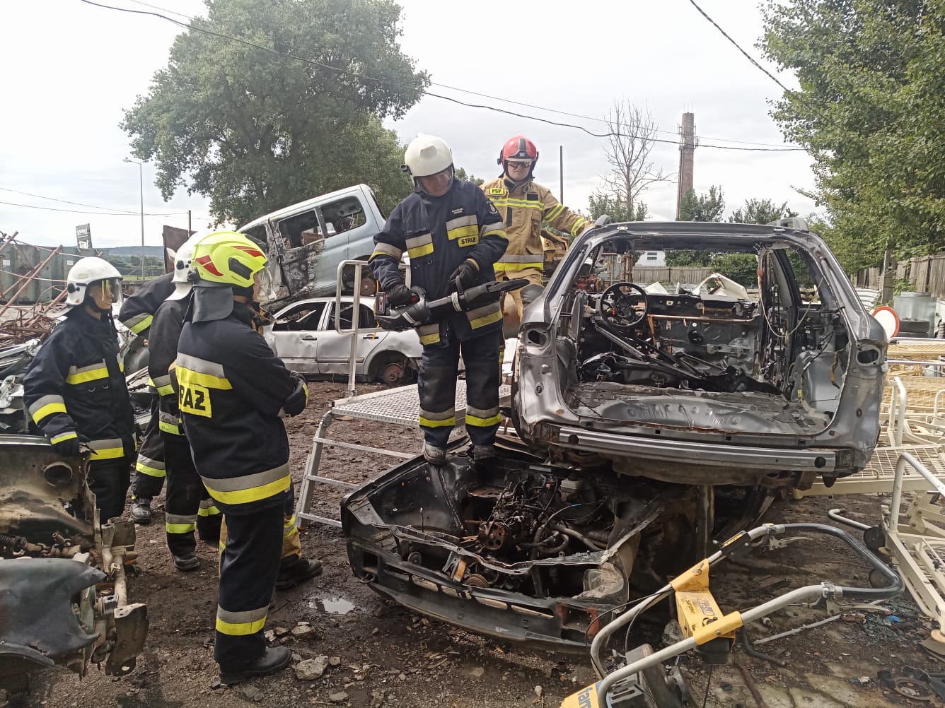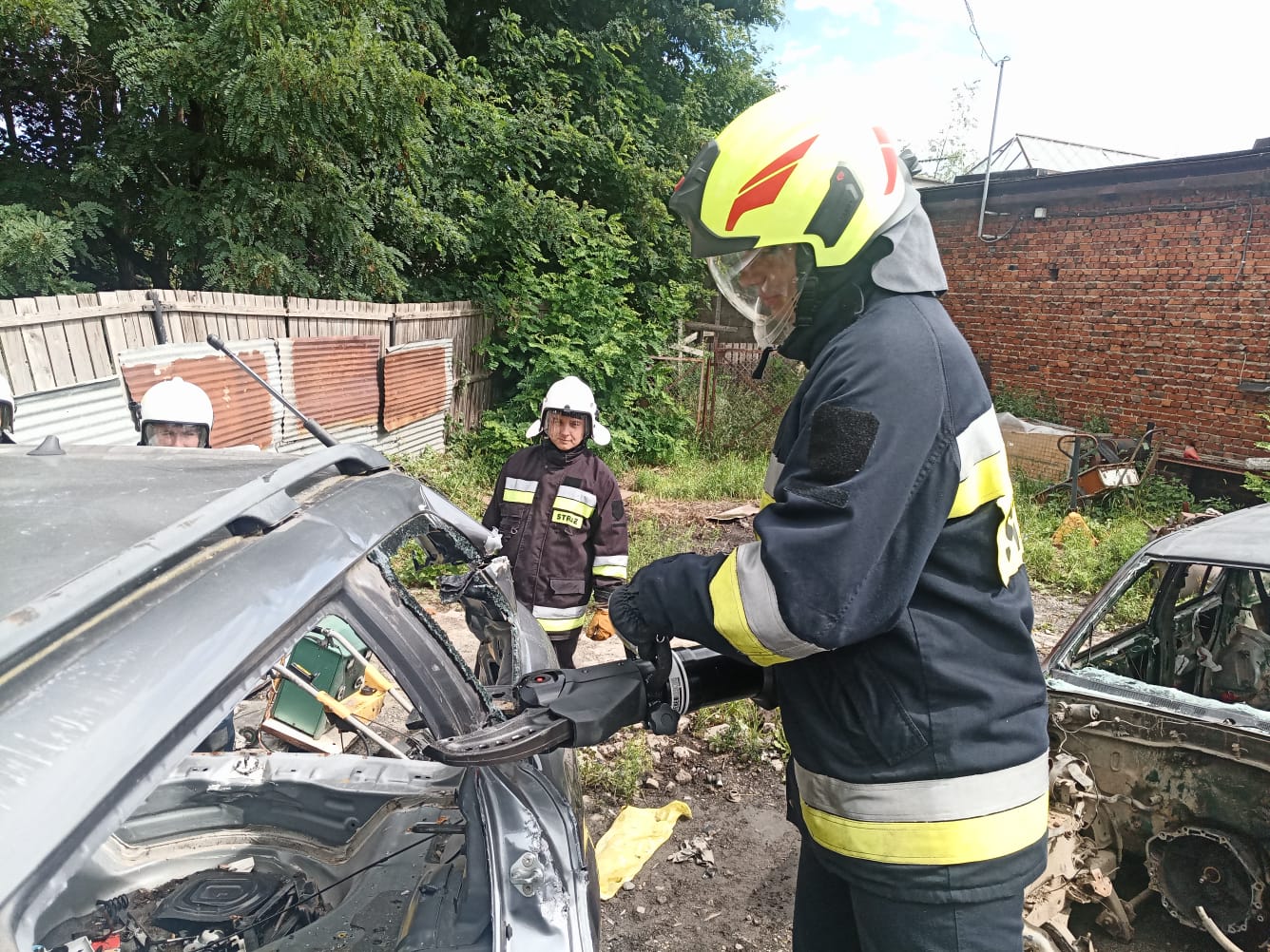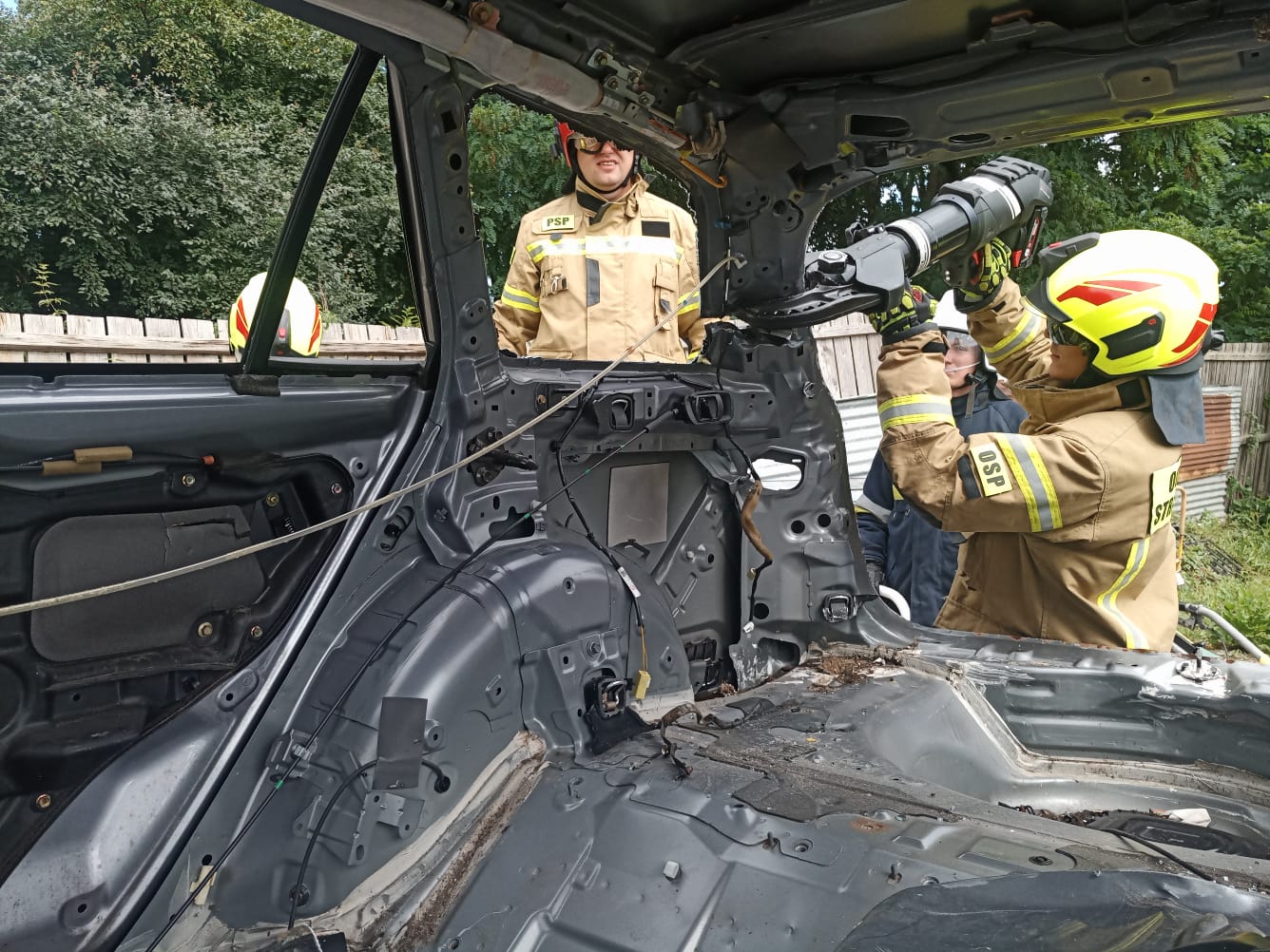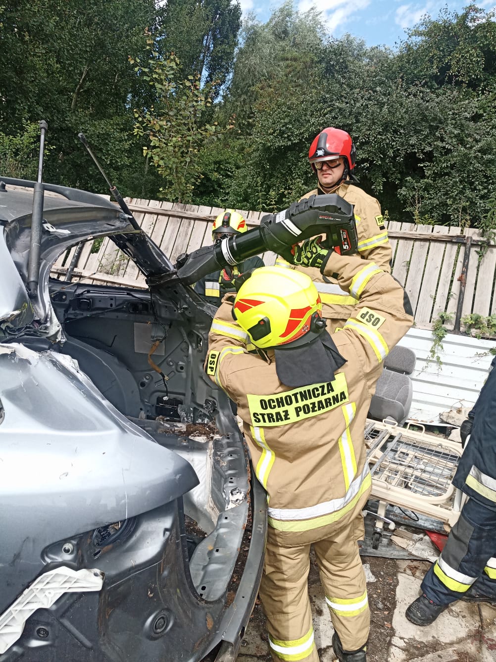 W niedzielę natomiast uczestnicy kursu podstawowego mieli możliwość zdobycia praktycznych umiejętności z zakresu ratownictwa technicznego. Dzięki przychylności właściciela skupu złomu przy ul. Oławskiej w Strzelinie, druhowie mieli do dyspozycji kilka wraków samochodów osobowych, na których przy zastosowaniu sprzętu hydraulicznego mogli ćwiczyć. Zajęcia wspierały dwie jednostki OSP Wiązów oraz Kuropatnik, które udostępniły niezbędny do przeprowadzenia ćwiczeń sprzęt.