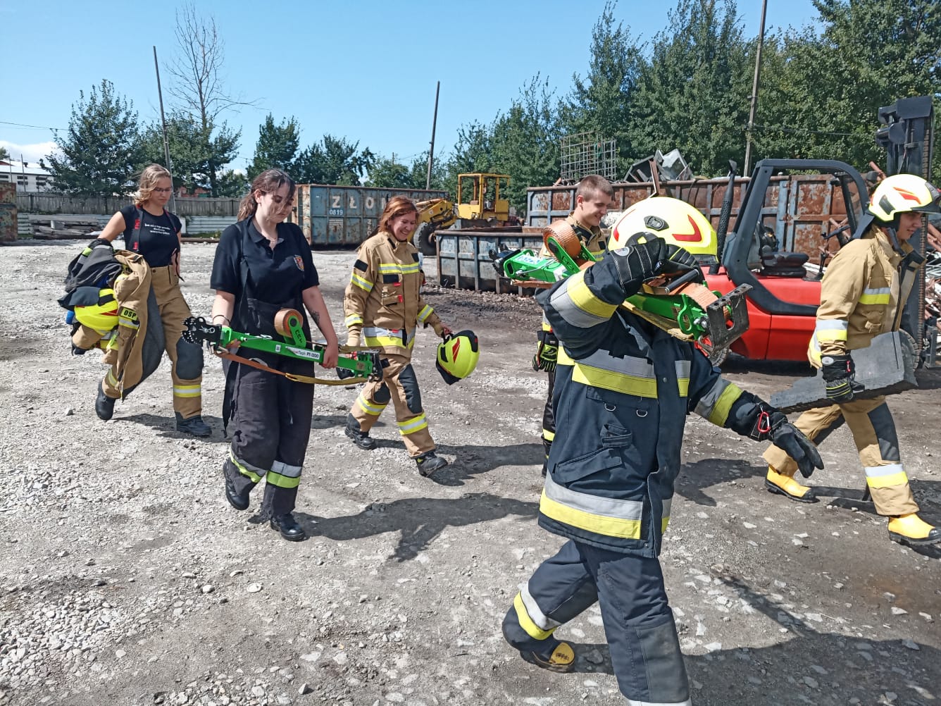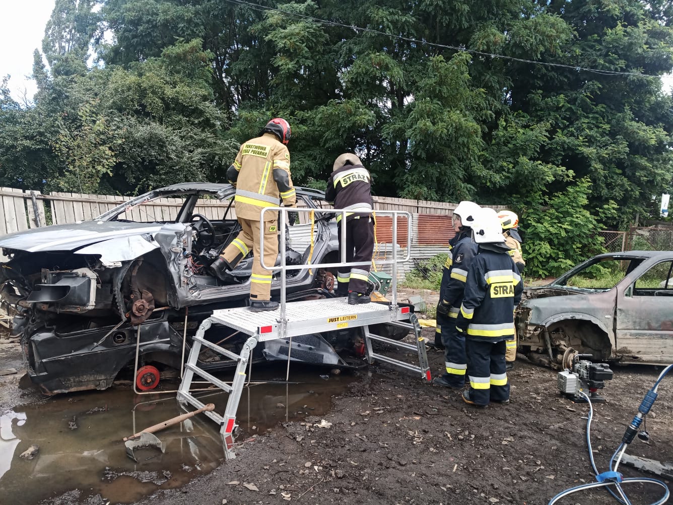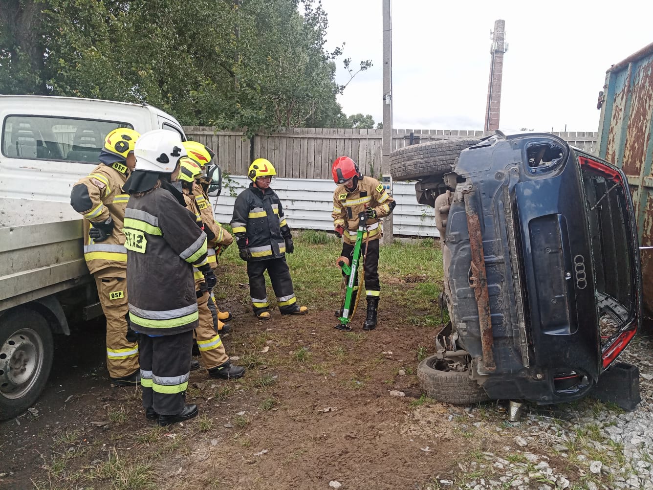 W niedzielę natomiast uczestnicy kursu podstawowego mieli możliwość zdobycia praktycznych umiejętności z zakresu ratownictwa technicznego. Dzięki przychylności właściciela skupu złomu przy ul. Oławskiej w Strzelinie, druhowie mieli do dyspozycji kilka wraków samochodów osobowych, na których przy zastosowaniu sprzętu hydraulicznego mogli ćwiczyć. Zajęcia wspierały dwie jednostki OSP Wiązów oraz Kuropatnik, które udostępniły niezbędny do przeprowadzenia ćwiczeń sprzęt.