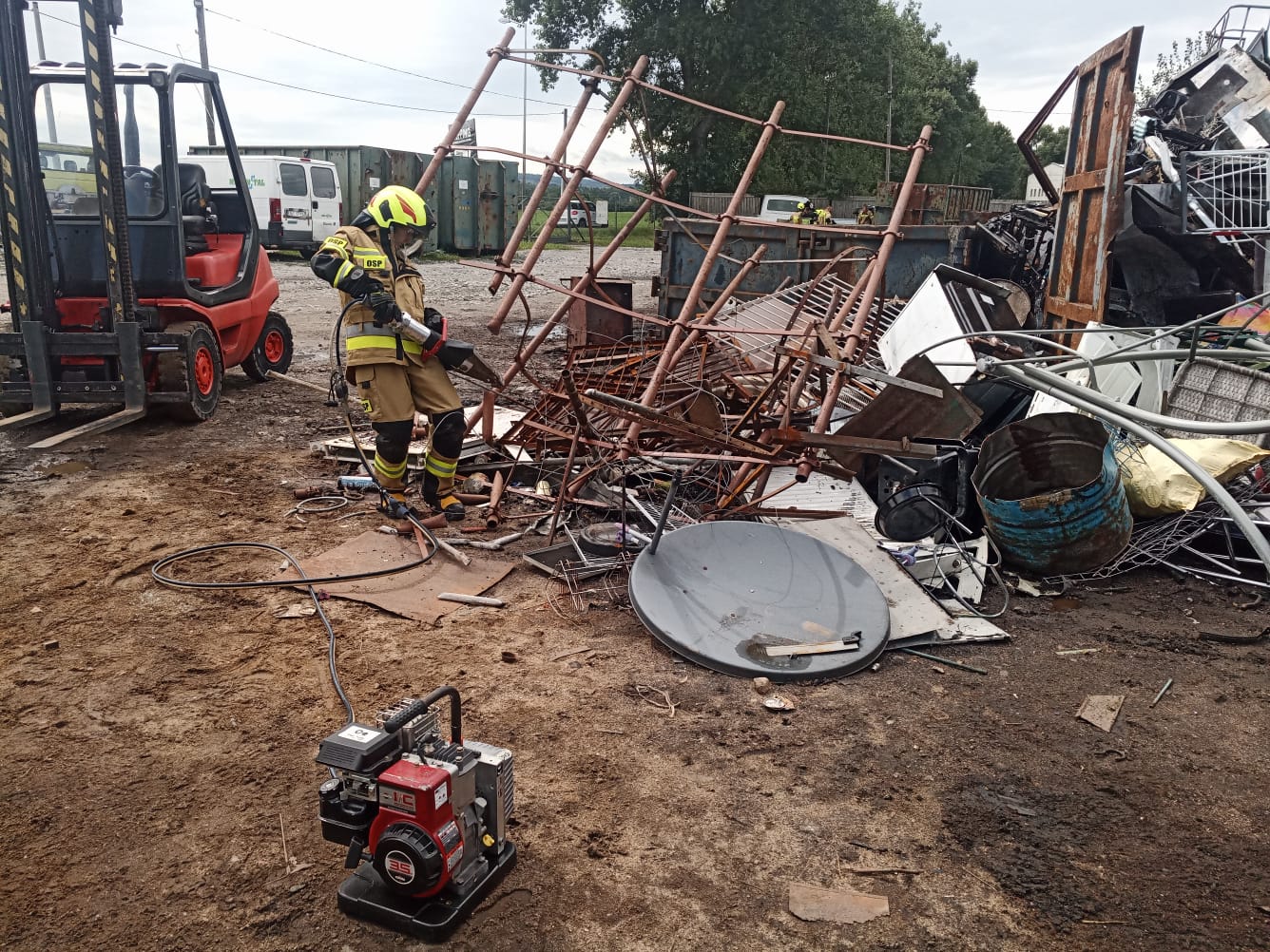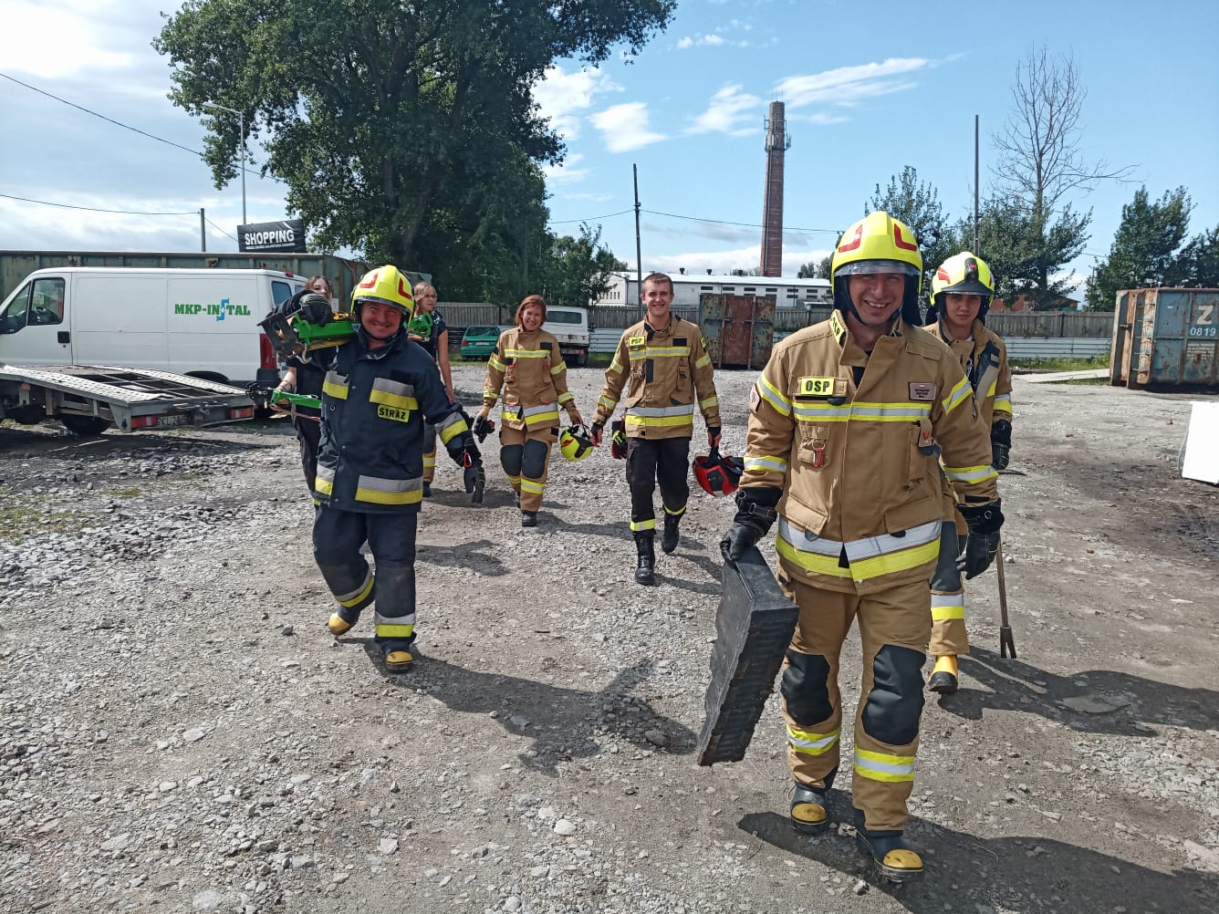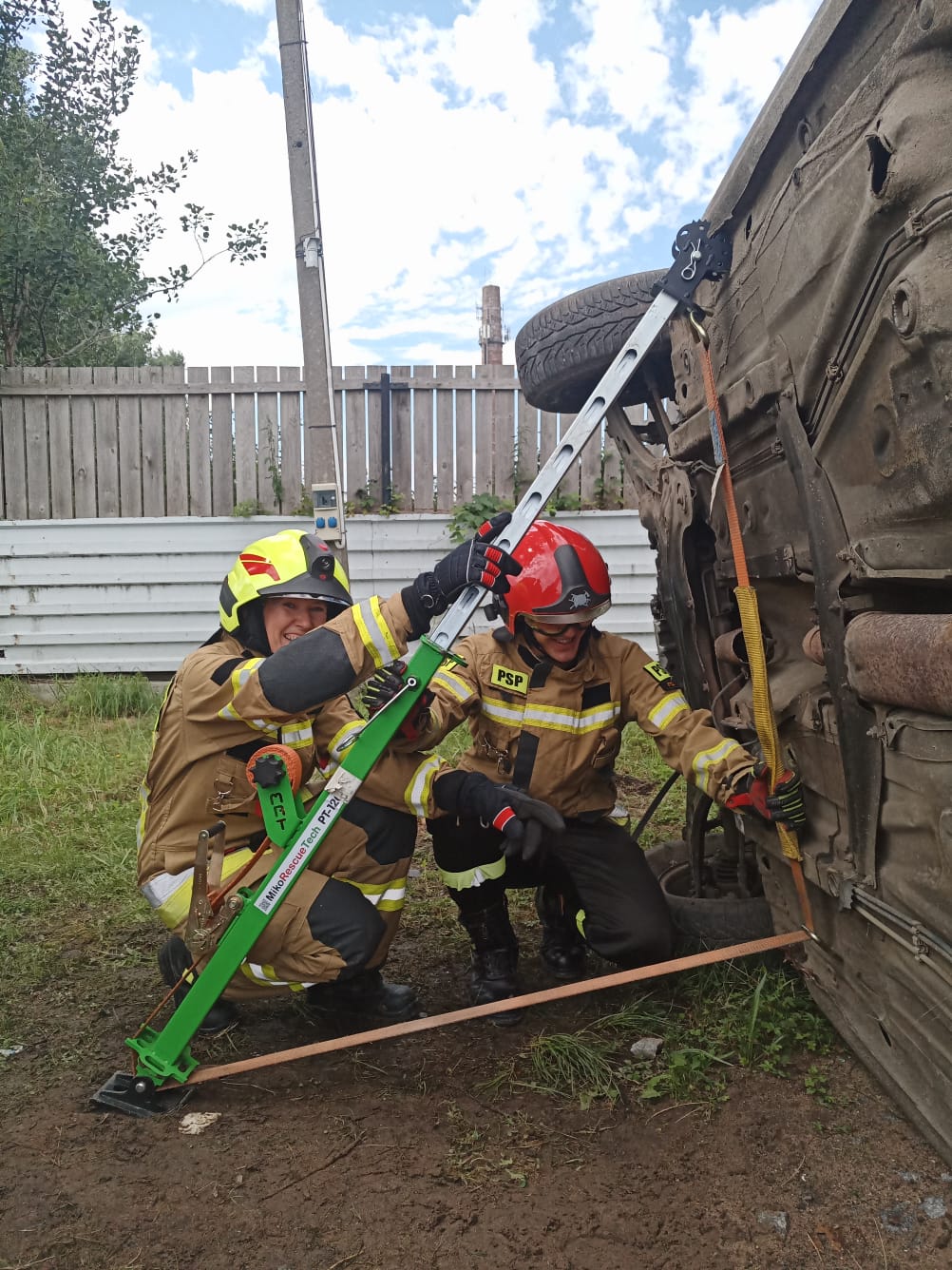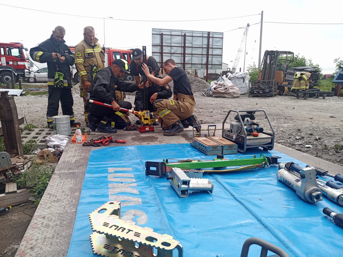 W niedzielę natomiast uczestnicy kursu podstawowego mieli możliwość zdobycia praktycznych umiejętności z zakresu ratownictwa technicznego. Dzięki przychylności właściciela skupu złomu przy ul. Oławskiej w Strzelinie, druhowie mieli do dyspozycji kilka wraków samochodów osobowych, na których przy zastosowaniu sprzętu hydraulicznego mogli ćwiczyć. Zajęcia wspierały dwie jednostki OSP Wiązów oraz Kuropatnik, które udostępniły niezbędny do przeprowadzenia ćwiczeń sprzęt.
