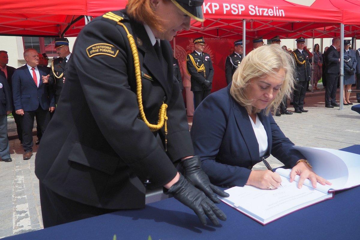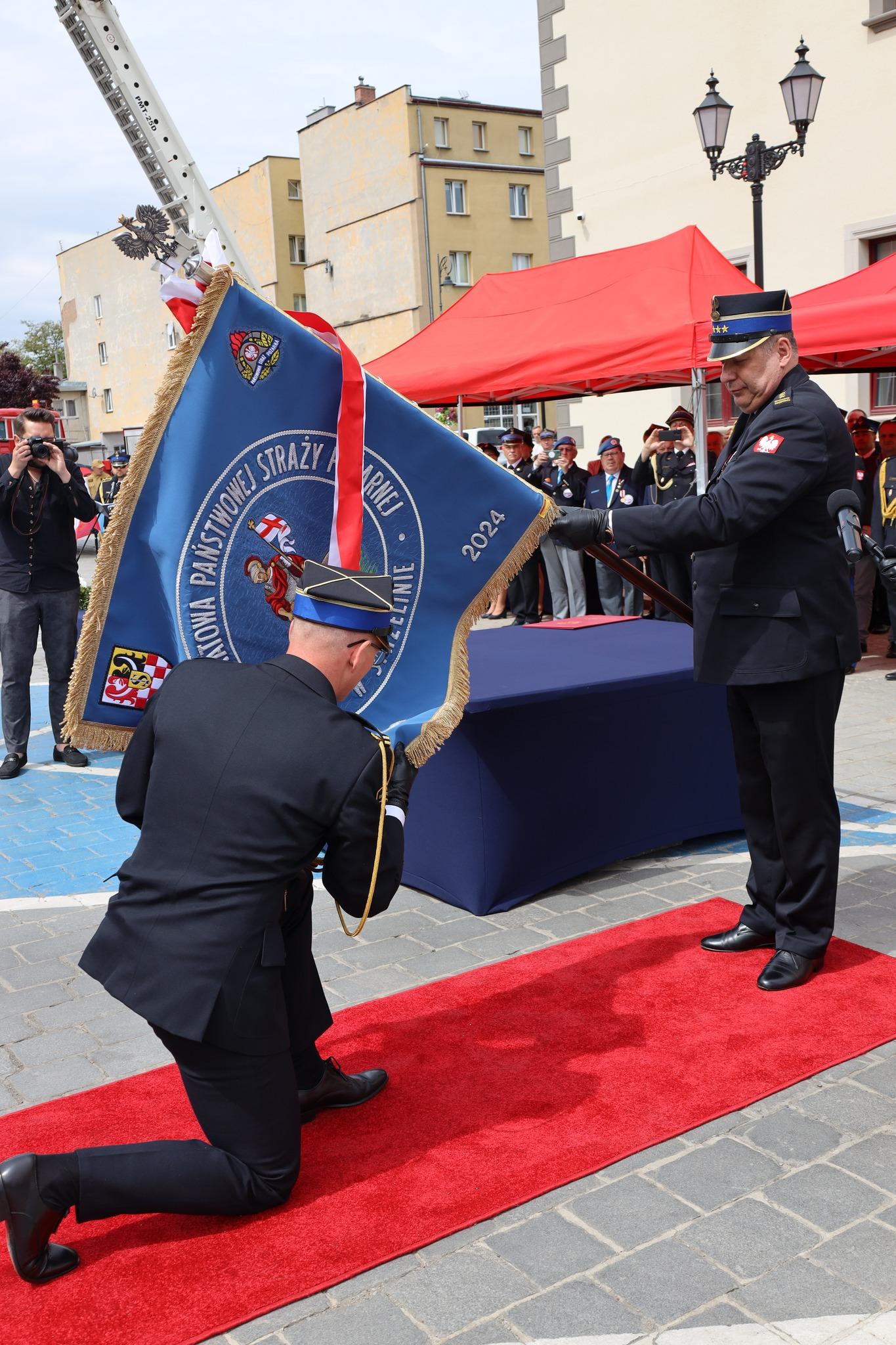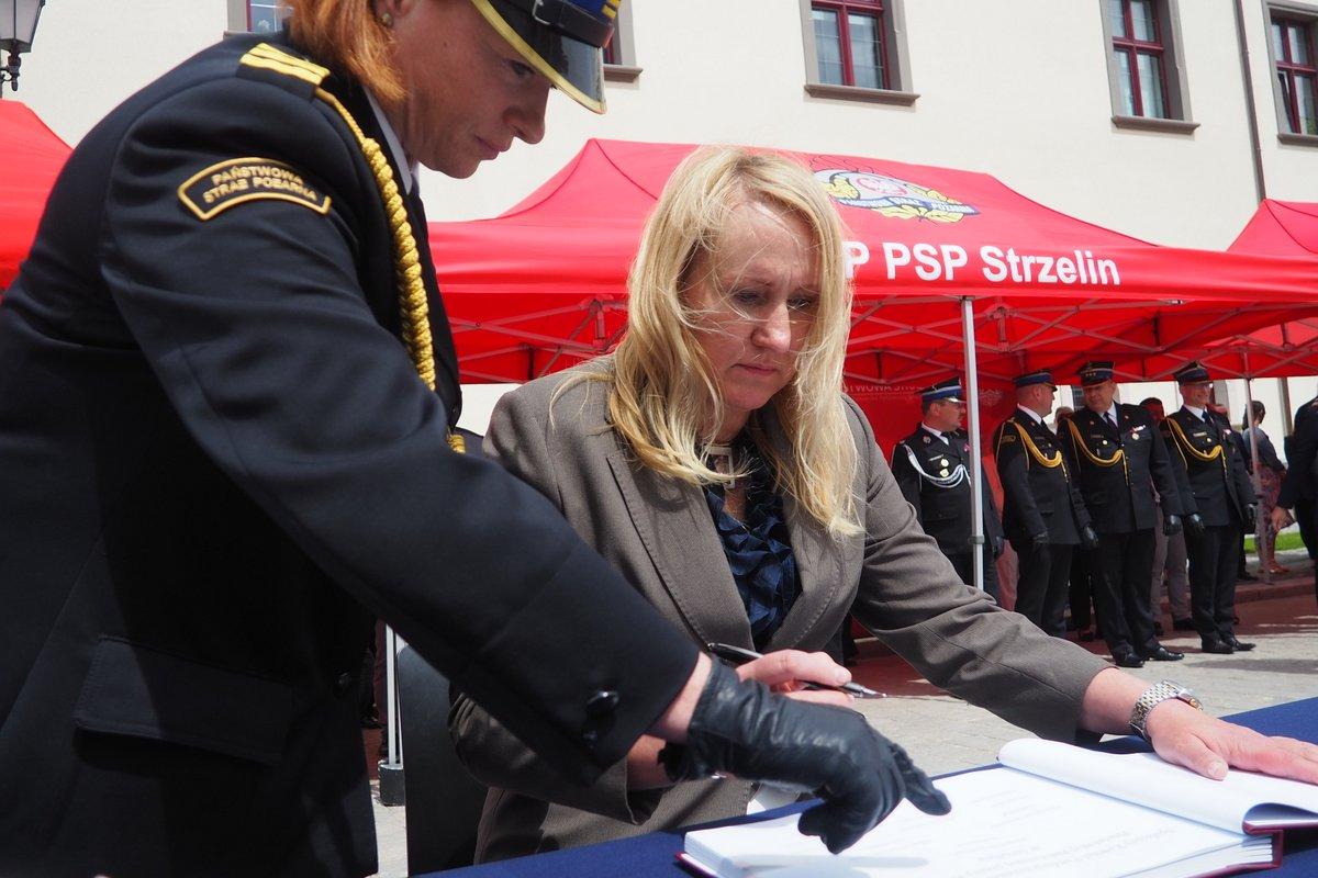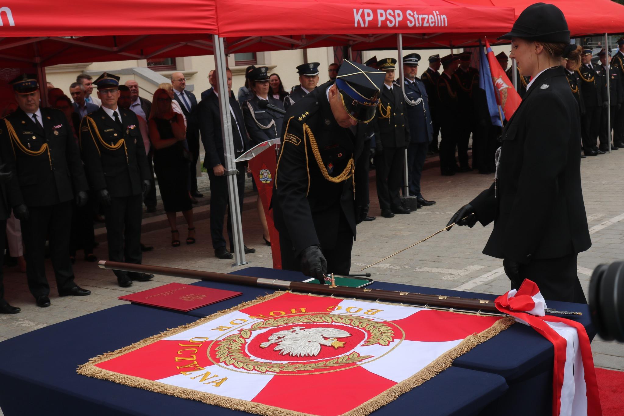 Kulminacyjnym punktem uroczystego apelu było przekazanie sztandaru celem dokonania aktu wręczenia przez Przewodniczącą Społecznego Komitetu Fundacji Sztandaru Panią Annę Horodyską oraz wręczenie sztandaru na ręce Komendanta Powiatowego Państwowej Straży Pożarnej w Strzelinie st. bryg. Łukasza Winkowskiego przez Dolnośląskiego Komendanta Wojewódzkiego Państwowej Straży Pożarnej st. bryg. Marka Hajduka. Dzięki darczyńcom, niezwykle odpowiedzialna strażacka służba została szczególnie wyróżniona.