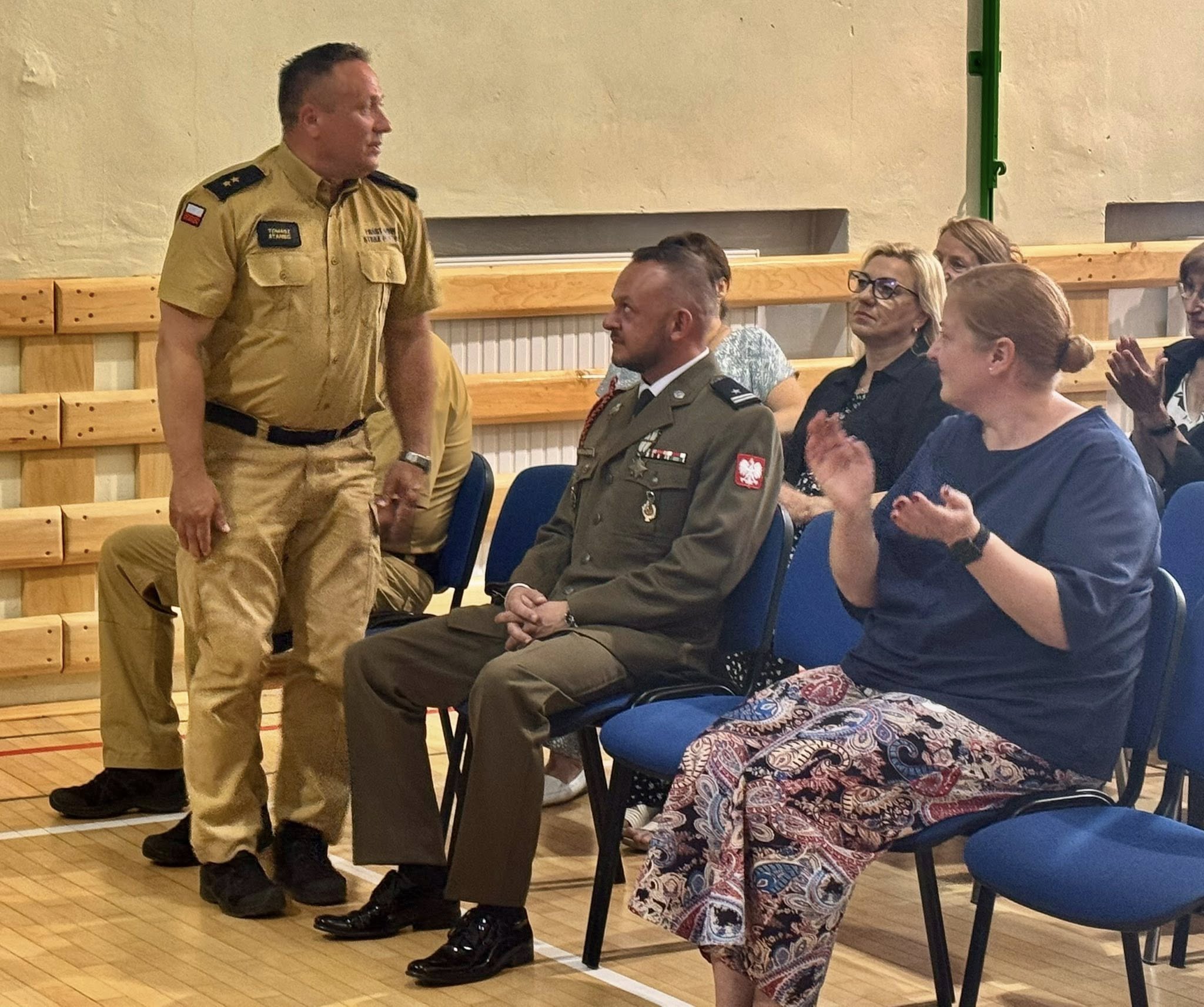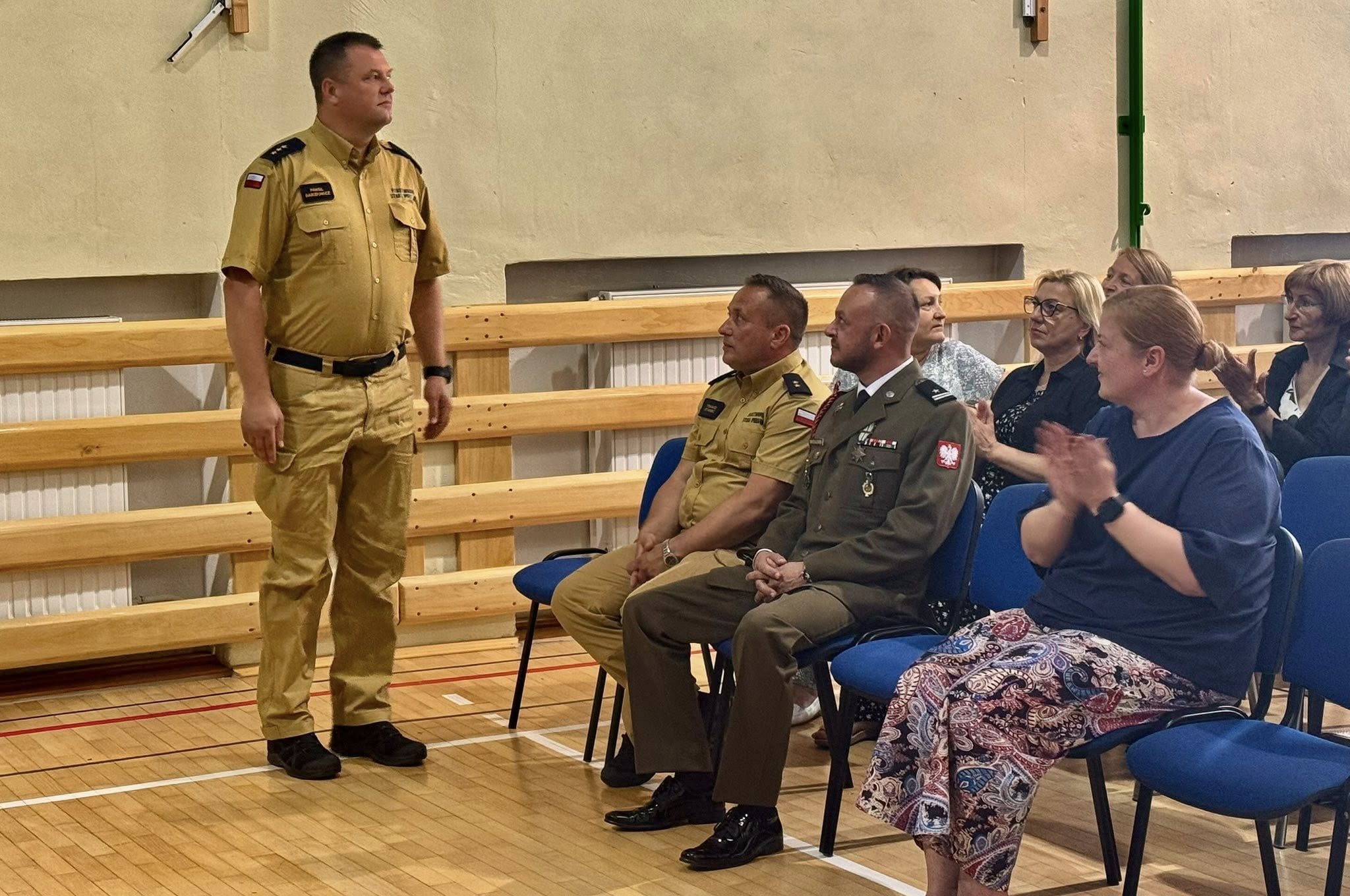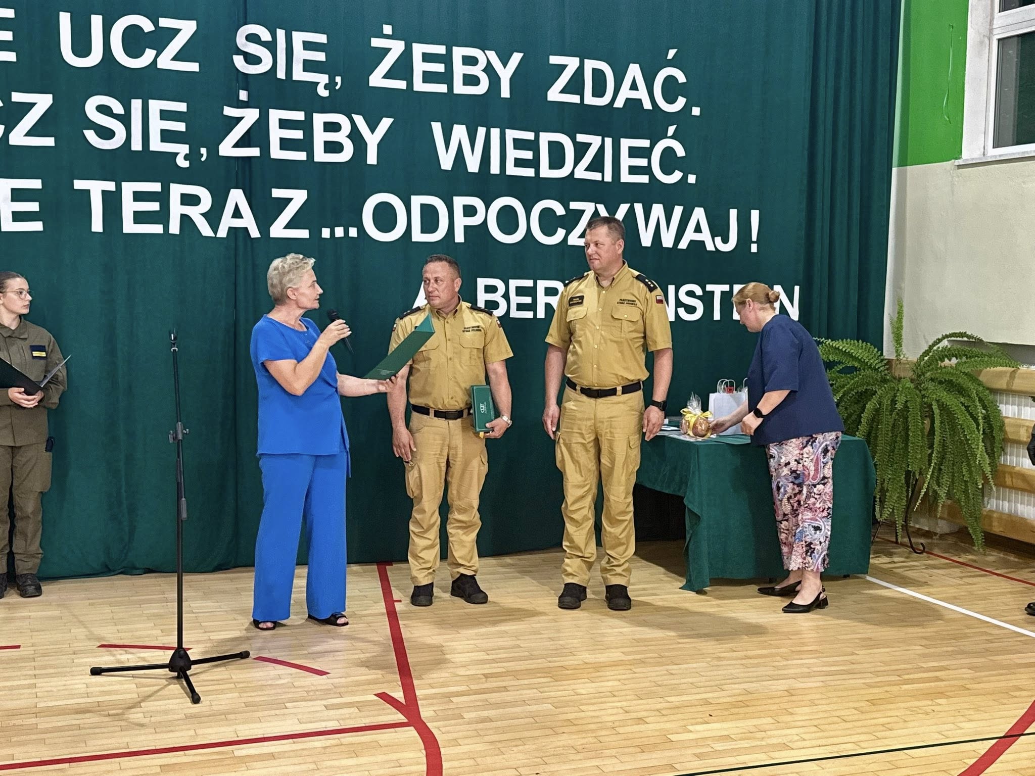 Zastępca Komendanta Państwowej Powiatowej Straży Pożarnej w imieniu Komendanta Państwowej Powiatowej Straży Pożarnej bryg Jarosława Łuczaka odebrał podziękowania za wsparcie i pomoc w działaniach mundurowych i szkoły w ciągu całego roku.