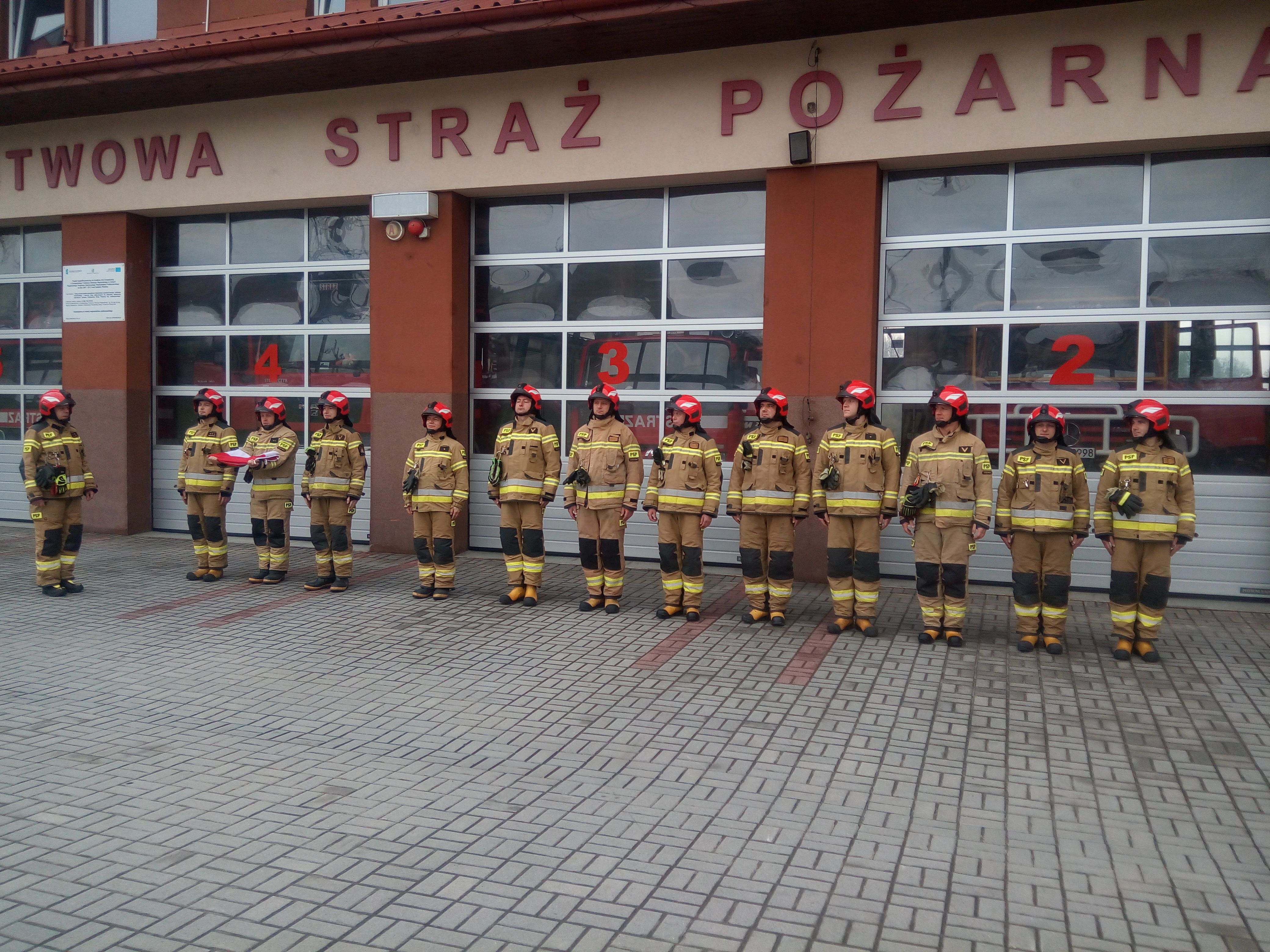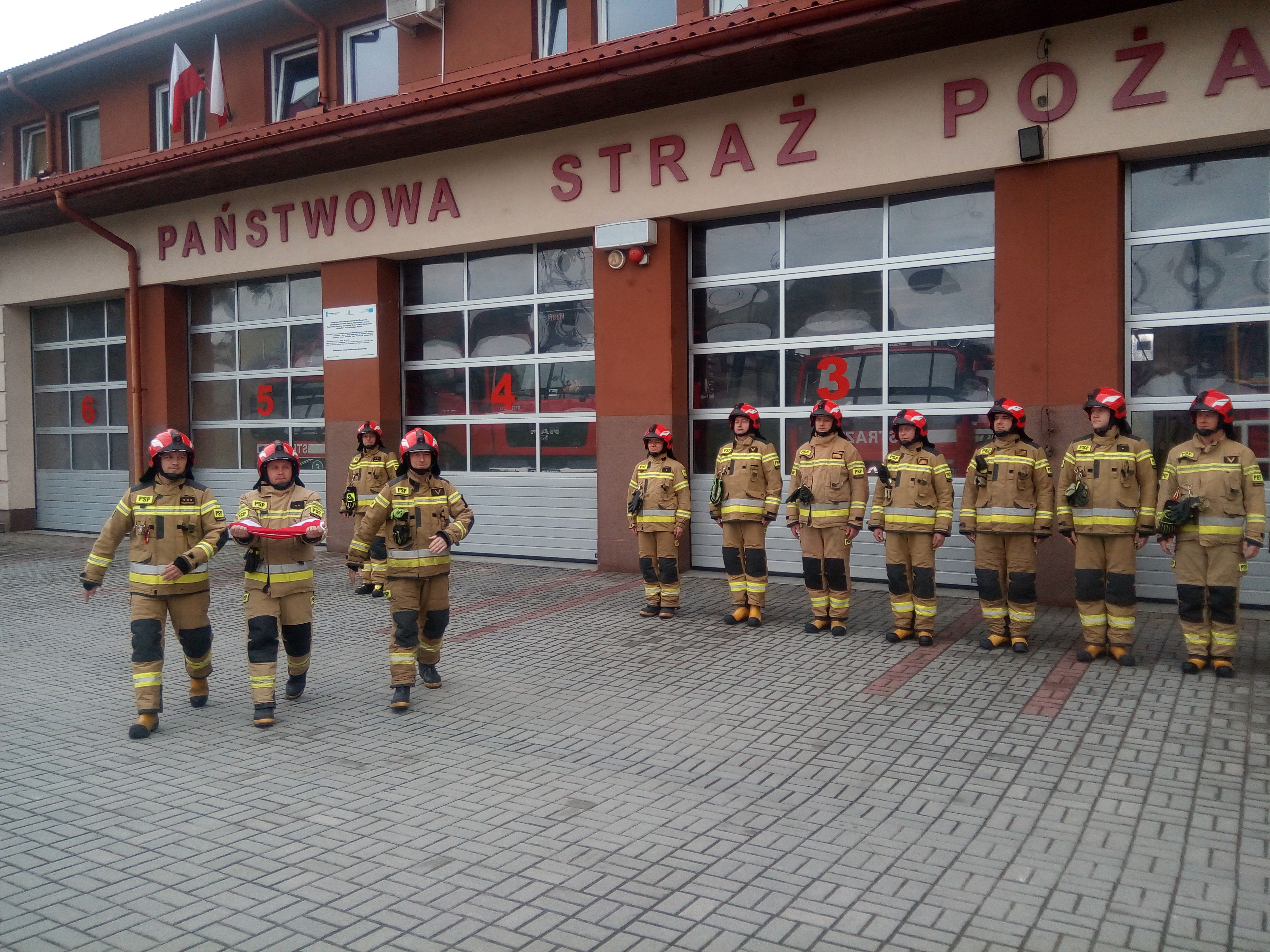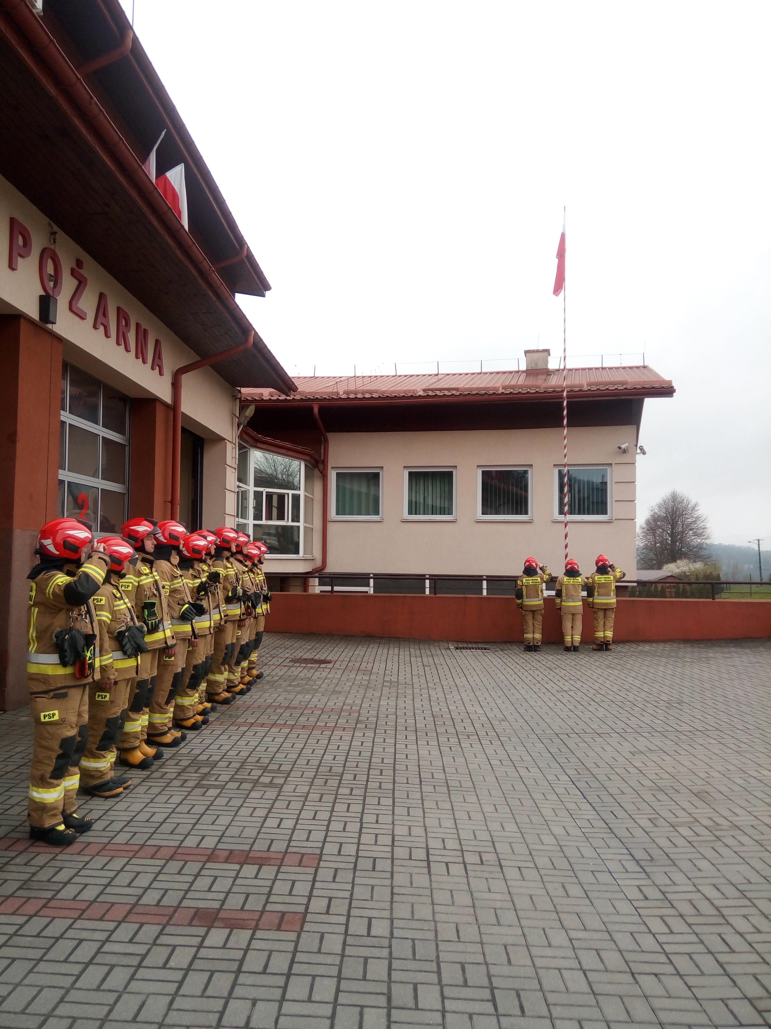 Po podniesieniu flagi oraz odegraniu hymnu Rzeczypospolitej strażacy z jednostki ratowniczo-gaśniczej przeprowadzili zmianę służby.