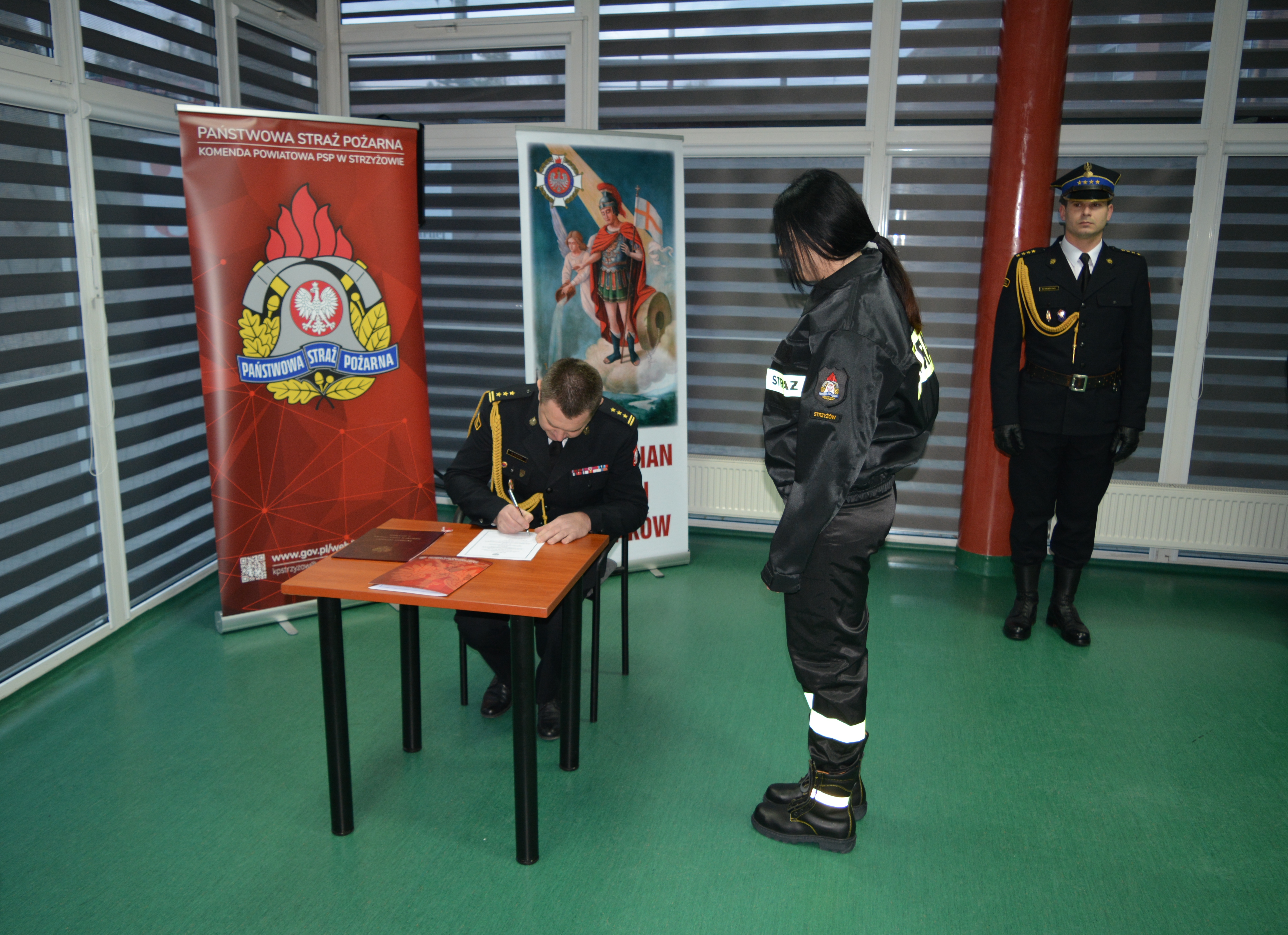 Na zakończenie zbiórki Komendant Powiatowy oraz nowo przyjęty strażak złożyli podpisy pod aktem ślubowania.