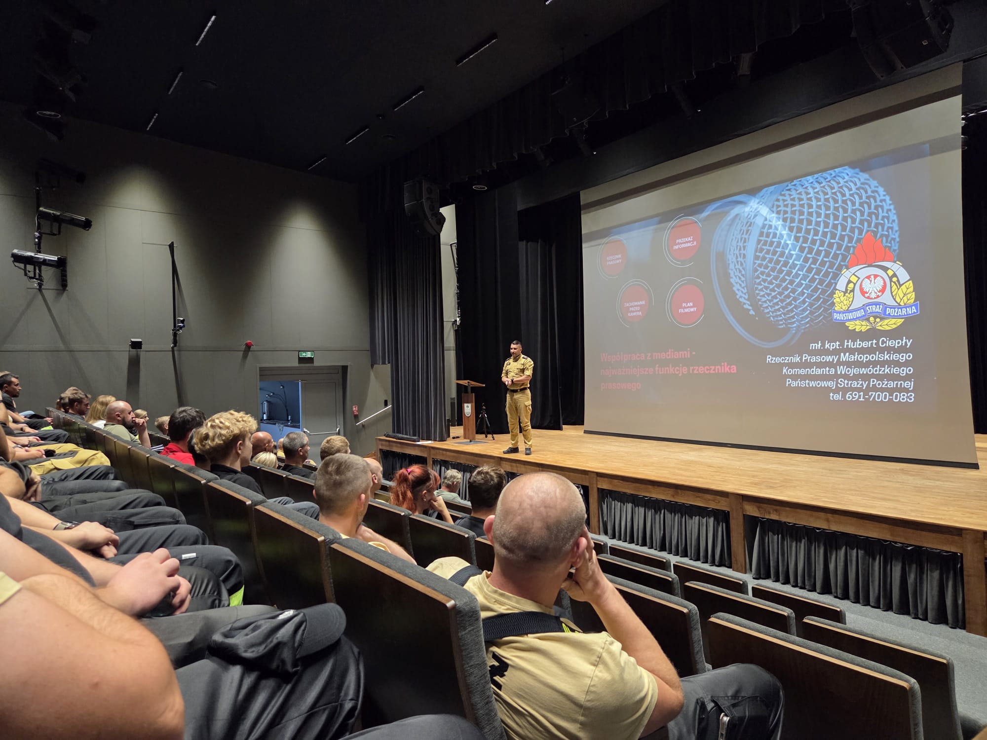 29 sierpnia 2025 r. w Makowskim Centrum Kultury odbyło się szkolenie z komunikacji z mediami przeprowadzone przez mł. kpt. Huberta Ciepłego - Rzecznika Prasowego Małopolskiego Komendanta Wojewódzkiego PSP. Szkolenie skierowane było do strażaków ochotników z jednostek OSP. Zajęcia poświęcone były odpowiedzialnemu i skutecznemu przekazywaniu informacji w trakcie prowadzonych działań ratowniczych.