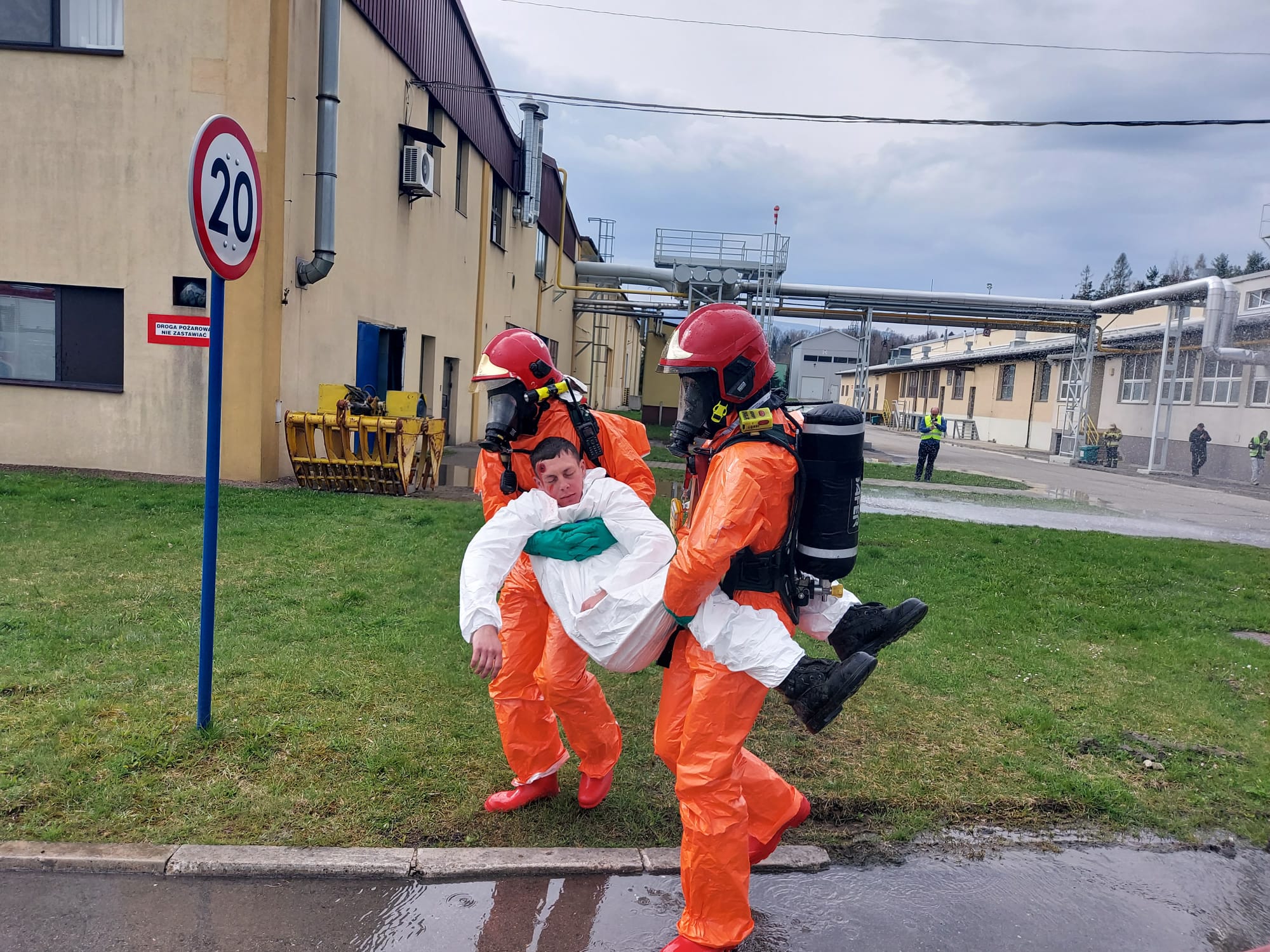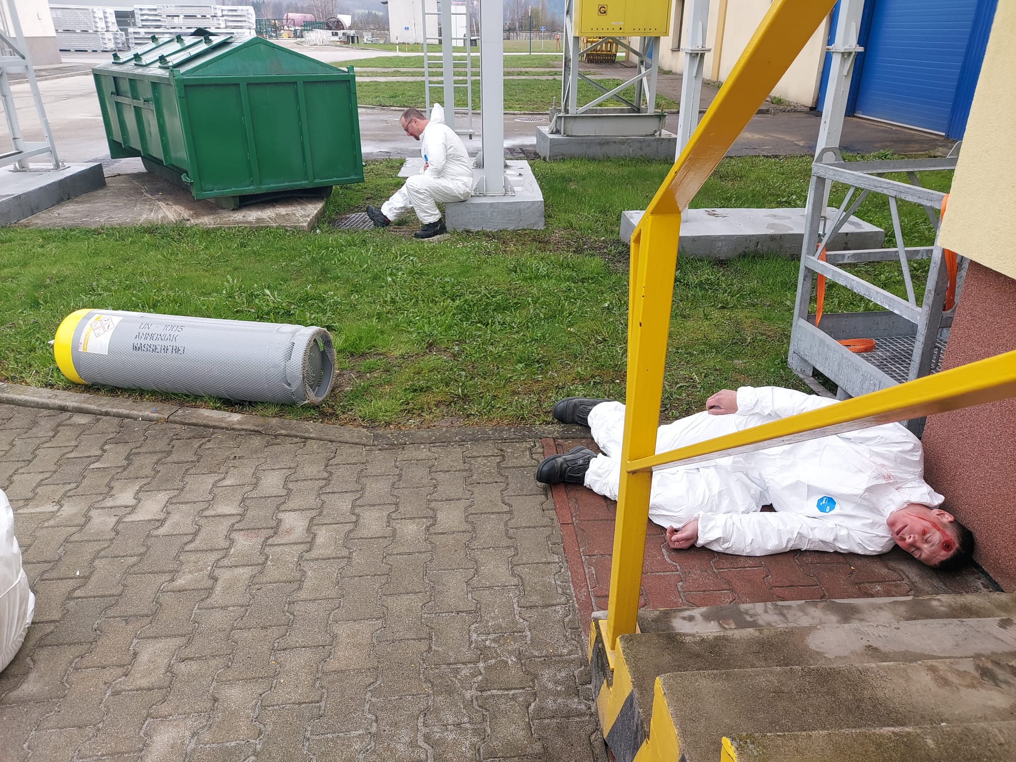 Scenariusz przedstawiał się następująco: W dniu 14 kwietnia 2023r. o godz. 10.00 podczas wymiany butli przez pracowników firmy „FABIOS” w Białce i podłączania jej do instalacji amoniakalnej, nastąpiło uszkodzenie korpusu butli z ciekłym amoniakiem. Butla wytoczyła się na zewnątrz magazynu. Zaistniała sytuacja doprowadziła do niekontrolowanego wycieku substancji toksycznej. Stopień uszkodzenia butli wyklucza możliwość jej zabezpieczenia, a ilość wyciekającego amoniaku doprowadza do powstania chmury gazu toksycznego zagrażającej życiu i zdrowiu ludzi. W wyniku zaistaniłego zdarzenia poszkodowani zostali pracownicy zakładu, którzy wykonywali czynności przyłączenia butli z ciekłym amoniakiem do instalacji technologicznej zakładu.”