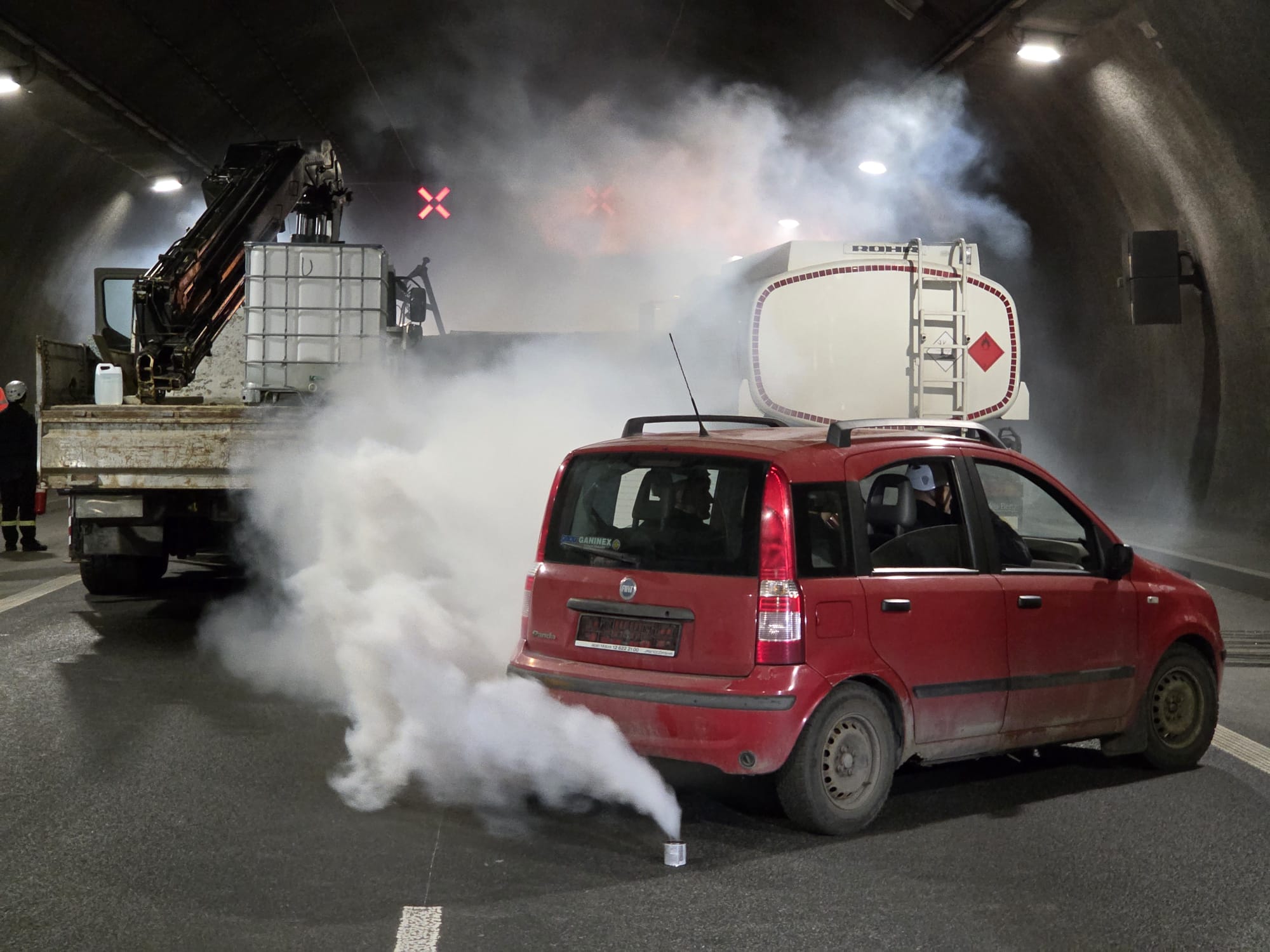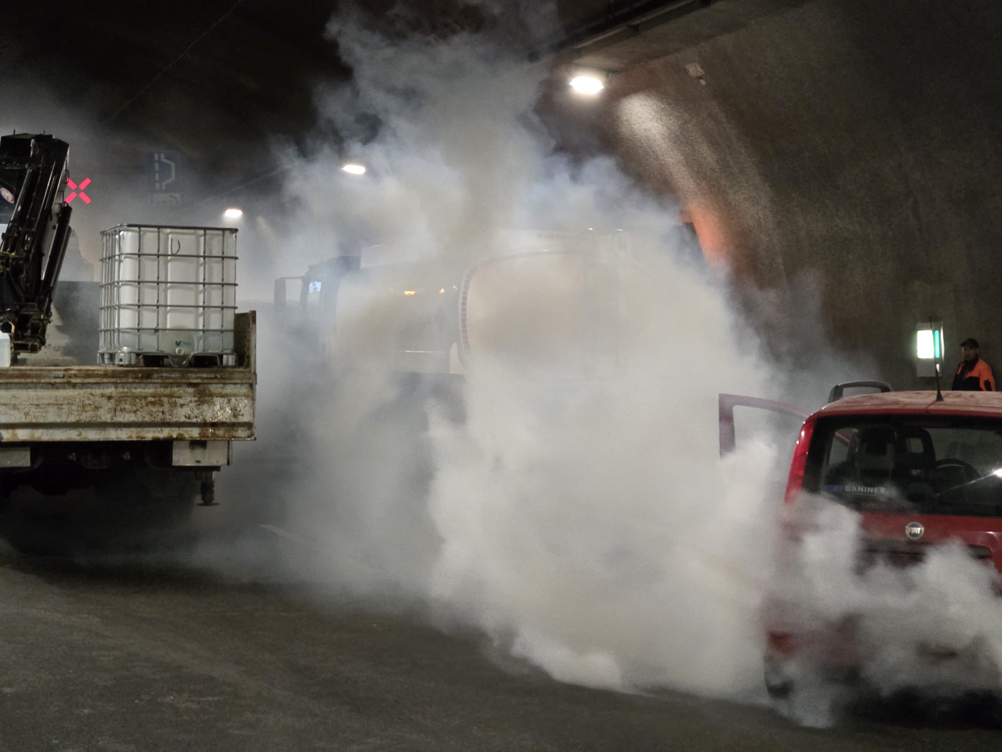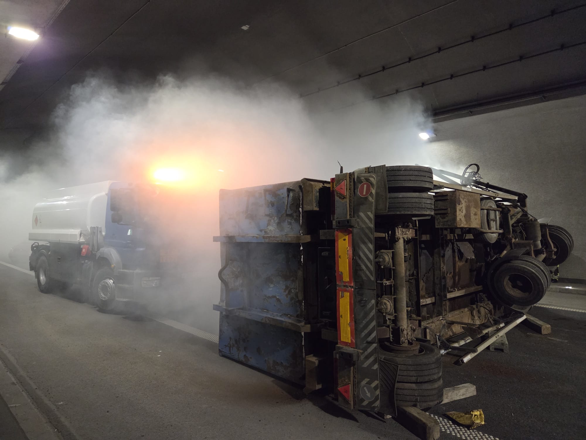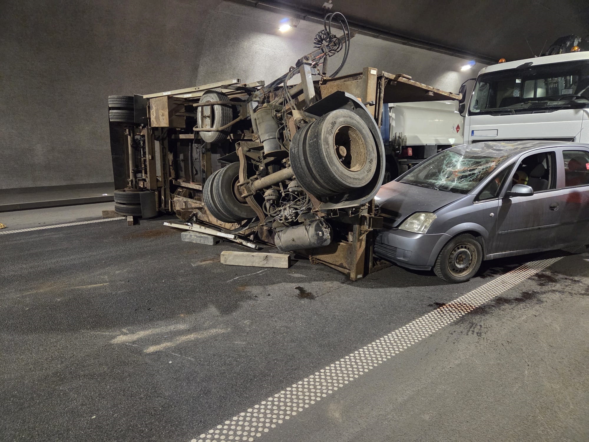 Około godziny 9:00 kierowca cysterny jadący w kierunku Krakowa wjechał do tunelu i stracił panowanie nad pojazdem, uderzając w tył jadącej przed nim ciężarówki. W wyniku zderzenia naczepa przewróciła się na lewy pas, blokując przejazd. Chwilę później kierowca samochodu osobowego najechał na przewróconą naczepę – auto stanęło w płomieniach, a dwie osoby zostały uwięzione we wraku, doznając poważnych obrażeń.