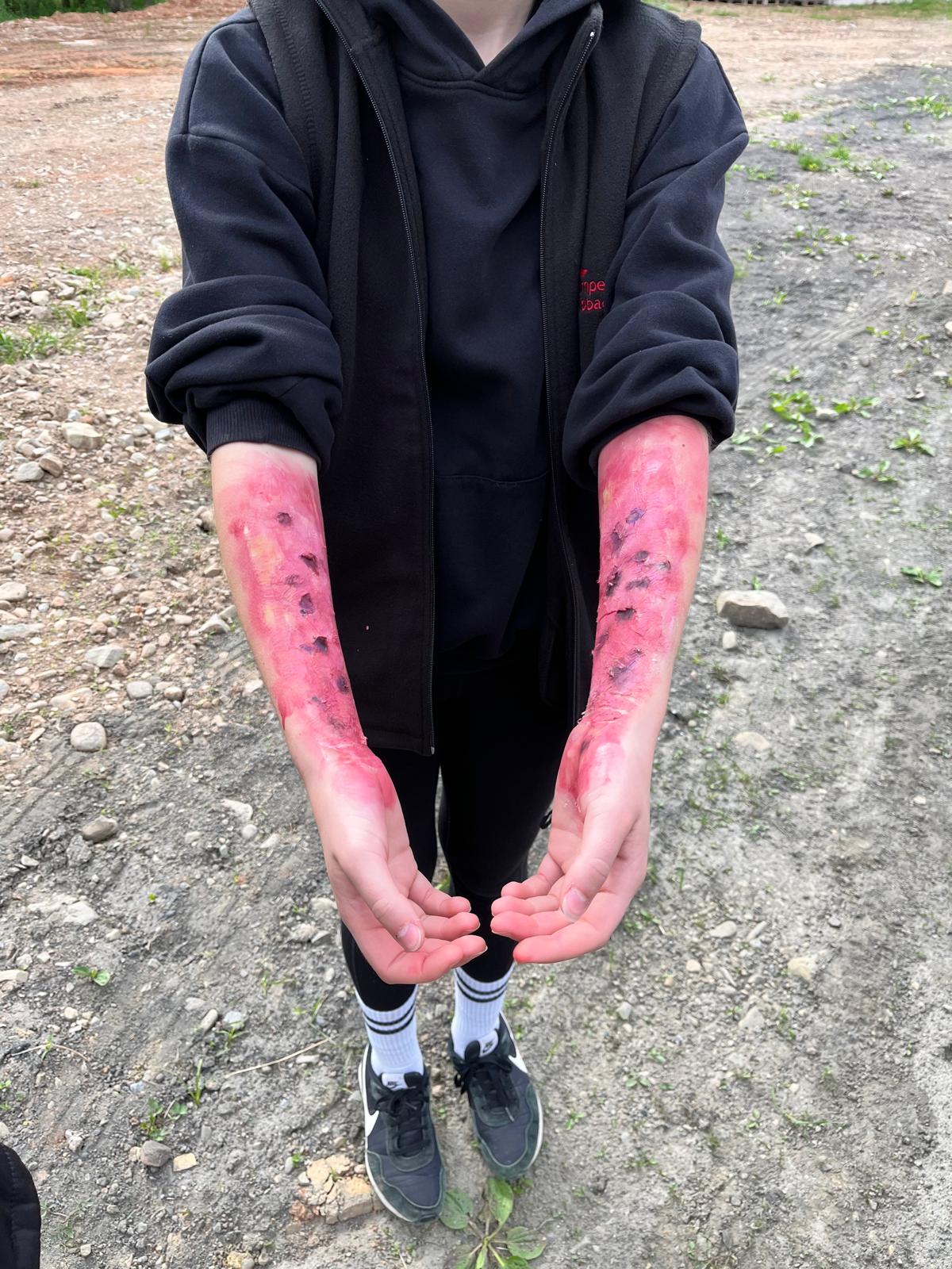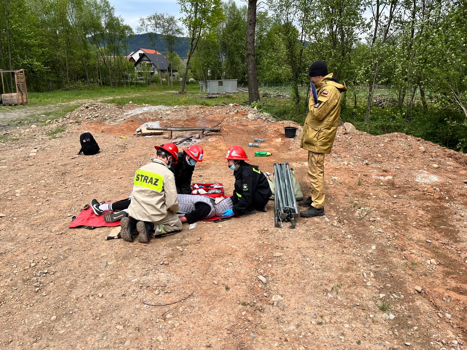 Podczas ogniska w lesie jedna z osób przewróciła się w pobliżu ognia, doznając oparzeń II stopnia prawego przedramienia i lewego podudzia. Poszkodowany był przytomny, ale w silnym bólu. Uczestnicy musieli odpowiednio zabezpieczyć miejsce oparzenia i zapewnić komfort psychiczny poszkodowanemu.