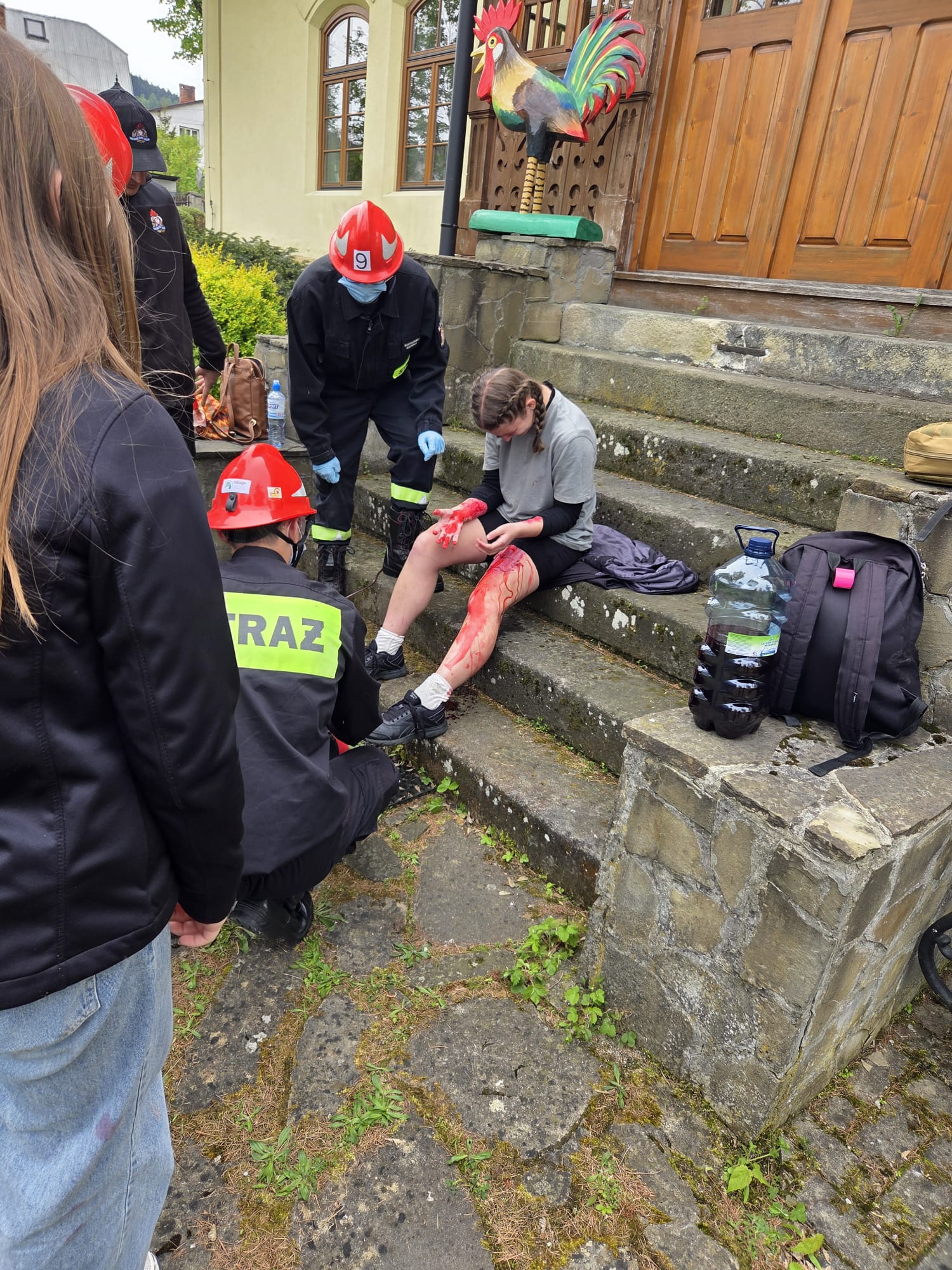 Nastolatka (pozorant) wybiegła z pomieszczenia i z dużą siłą uderzyła w drzwi z szybą, które roztrzaskały się. W wyniku zdarzenia doznała licznych ran ciętych na kończynach górnych, a jeden z odłamków szkła wbił się w udo. Rana intensywnie krwawiła. Zadaniem uczestników było udzielenie odpowiedniej pomocy przedmedycznej.