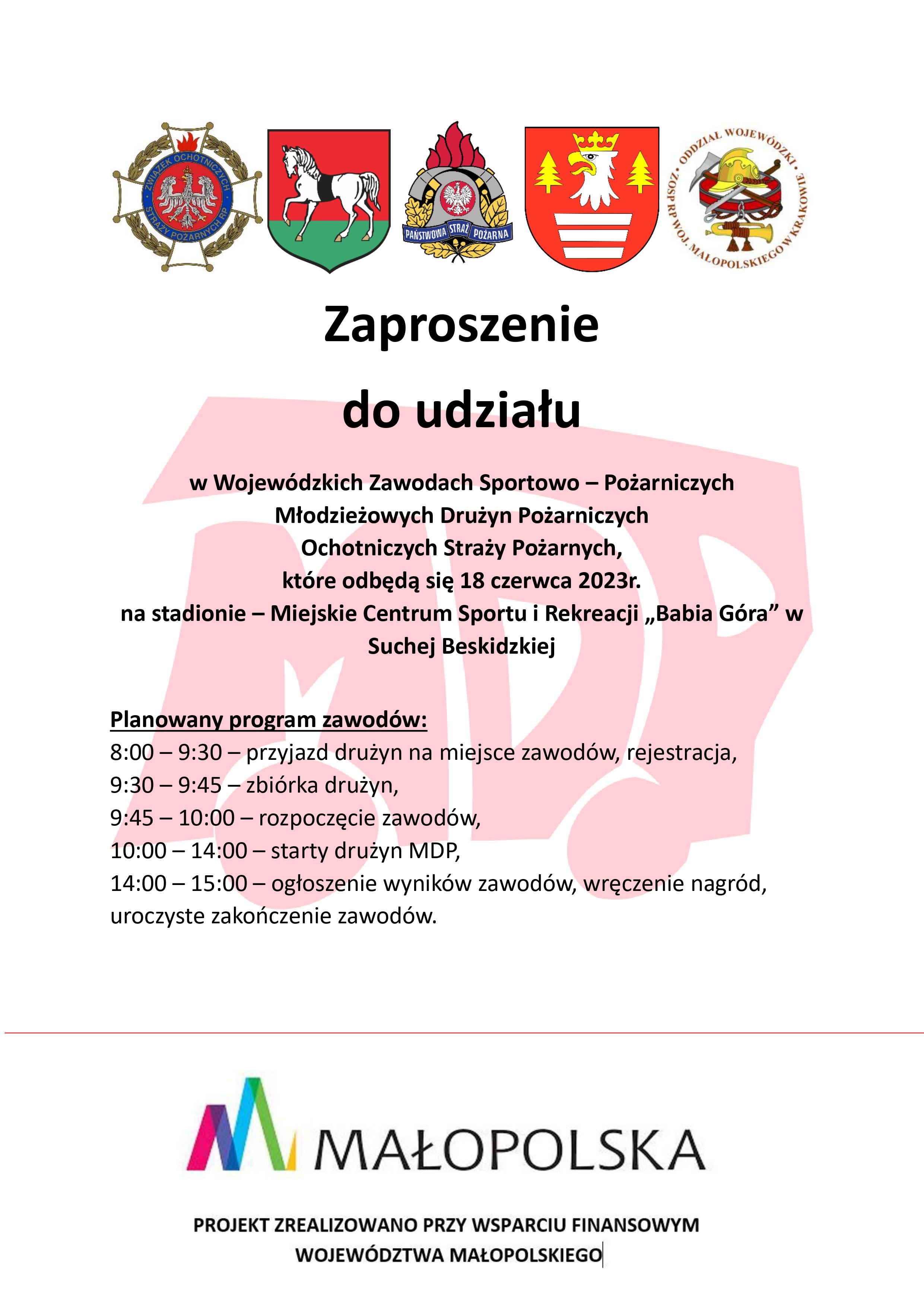 Serdecznie zapraszamy wszystkich mieszkańców oraz rodziców najmłodszych strażaków do aktywnego kibicowania drużynom biorącym udział w Młodzieżowych Wojewódzkich Zawodach Sportowo-Pożarniczych, które w tym roku odbędą się w Suchej Beskidzkiej 18 czerwca 2023 roku na stadionie Miejskiego Centrum Sportu i Rekreacji w Suchej Beskidzkiej o godzinie 10:00.