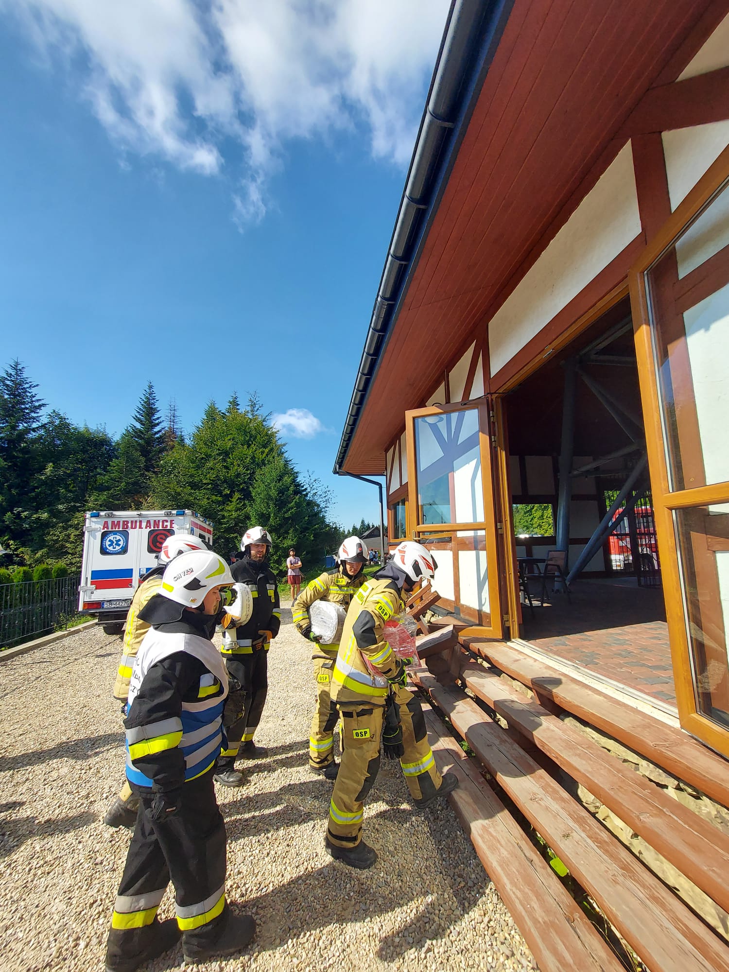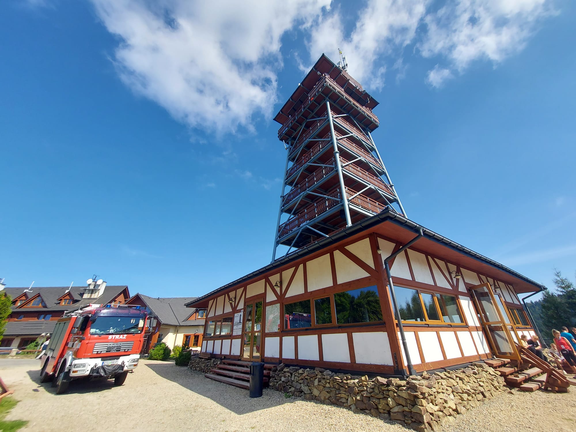 Wejście na czas na wieżę widokową hotelu Beskidzki Raj z ciężkim ekwipunkiem strażackim. Był to test wytrzymałości i kondycji fizycznej dla każdego uczestnika.