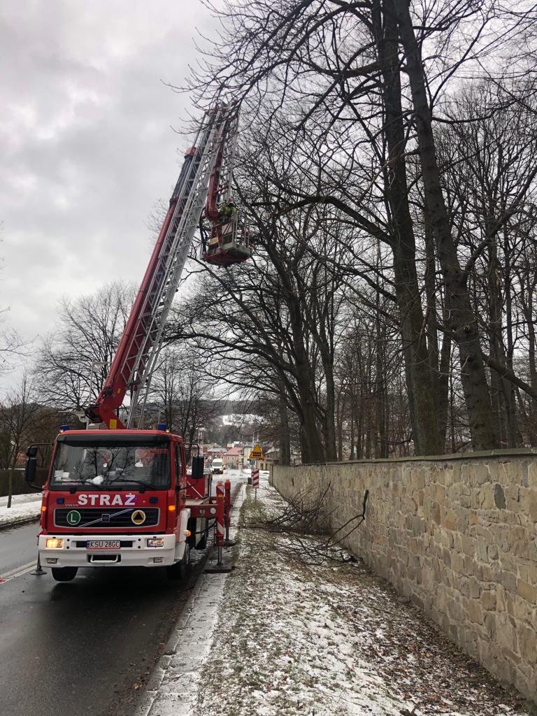 Zdarzenia dotyczyły 12 przypadków przewróconych drzew na drogi publiczne. Zdarzenia związane z usuwanie drzew z dróg wystąpiły: 29.01.2022r. o godzinie 21:37 w miejscowości Bystra Podhalańska, 30.01.2022r. o godzinie 06:23 w miejscowości Sucha Beskidzka na ulicy Leśnej, 30.01.2022r. o godzinie 10:24 w miejscowości Grzechynia, 30.01.2022r. o godzinie 12:25 w miejscowości Zembrzyce os. Zarębki, 30.01.2022r. o godzinie 12:35 w miejscowości Śleszowice, 30.01.2022r. o godzinie 14:32 w miejscowości Maków Podhalański os. Makowska Góra, 30.01.2022r. o godzinie 16:56 w miejscowości Śleszowice, 30.01.2022r. o godzinie 20:34 w miejscowości Toporzysko, 30.01.2022r. o godzinie 22:39 w miejscowości Jordanów ulica 3 maja, 30.01.2022r. o godzinie 22:56 w miejscowości Maków Podhalański os. Na stoku, 31.01.2022r. o godzinie 08:52 w miejscowości Sucha Beskidzka na ul. Zamkowej. W każdym przypadku strażacy usunęli drzewa i konary z dróg przywracając ruch drogowy.