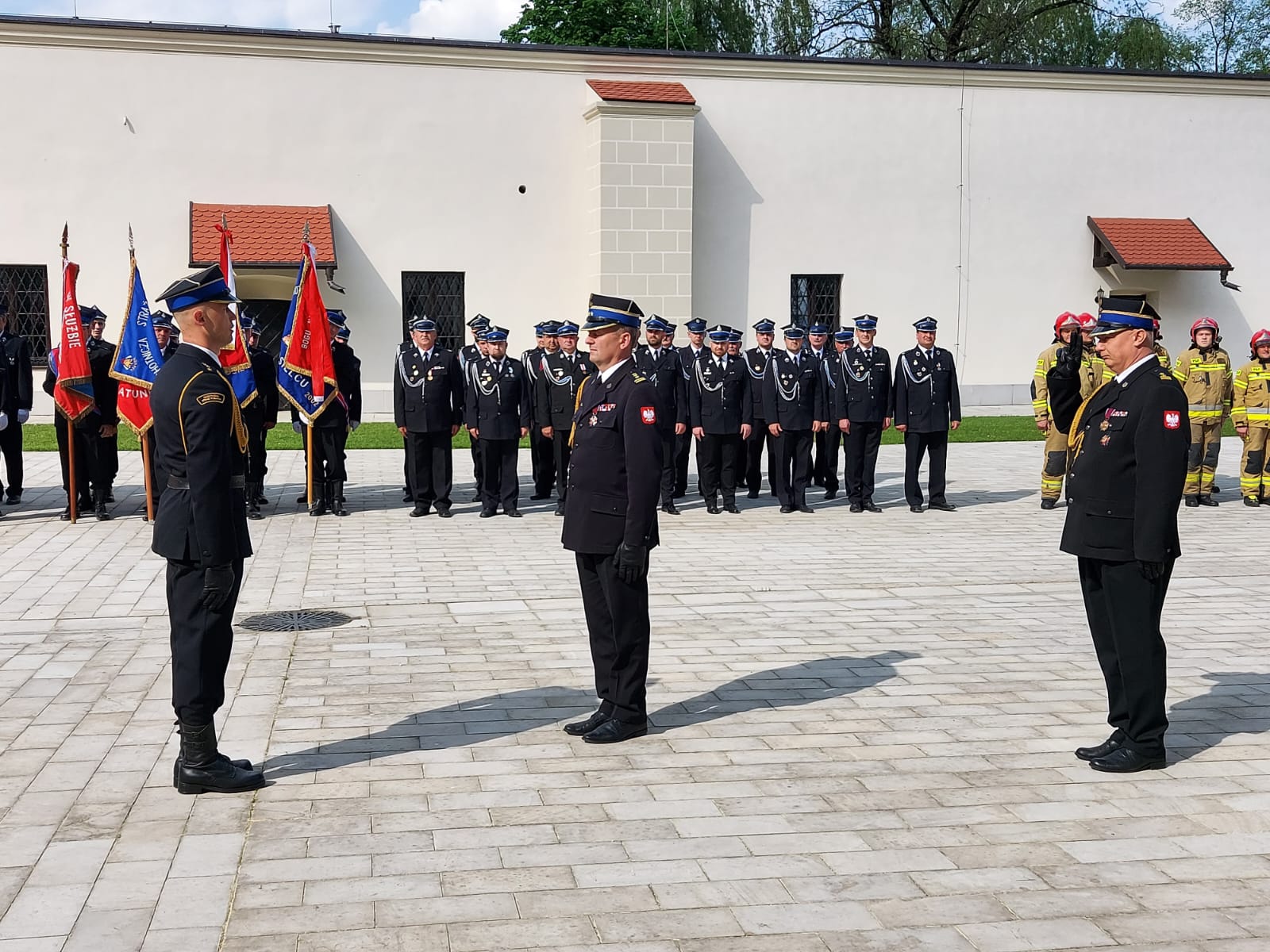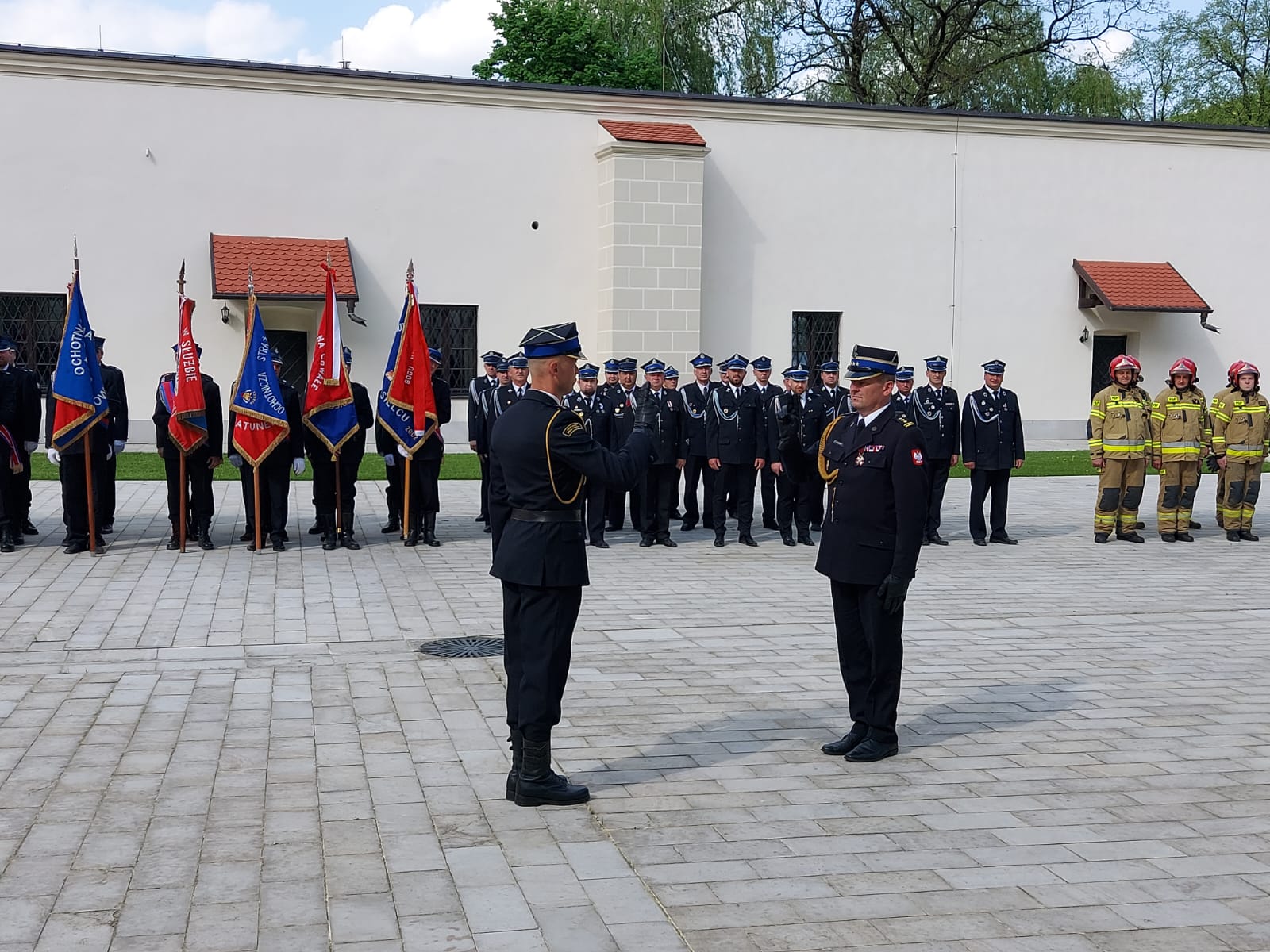 Meldunek o rozpoczęciu uroczystości złożył st. kpt. Wojciech Kania, a meldunek przyjął st. bryg. Mariusz Łaciak zastępca małopolskiego komendanta wojewódzkiego PSP. Następnie odbyło się podniesienie flagi państwowej oraz odegranie Hymnu.