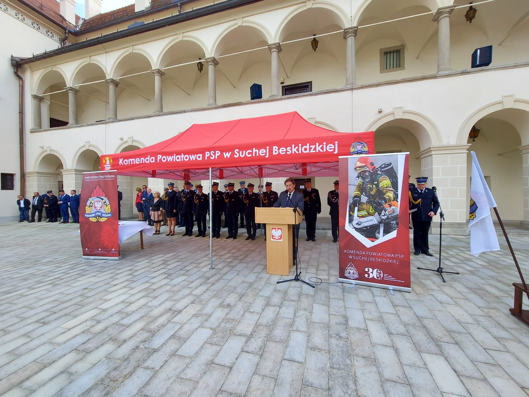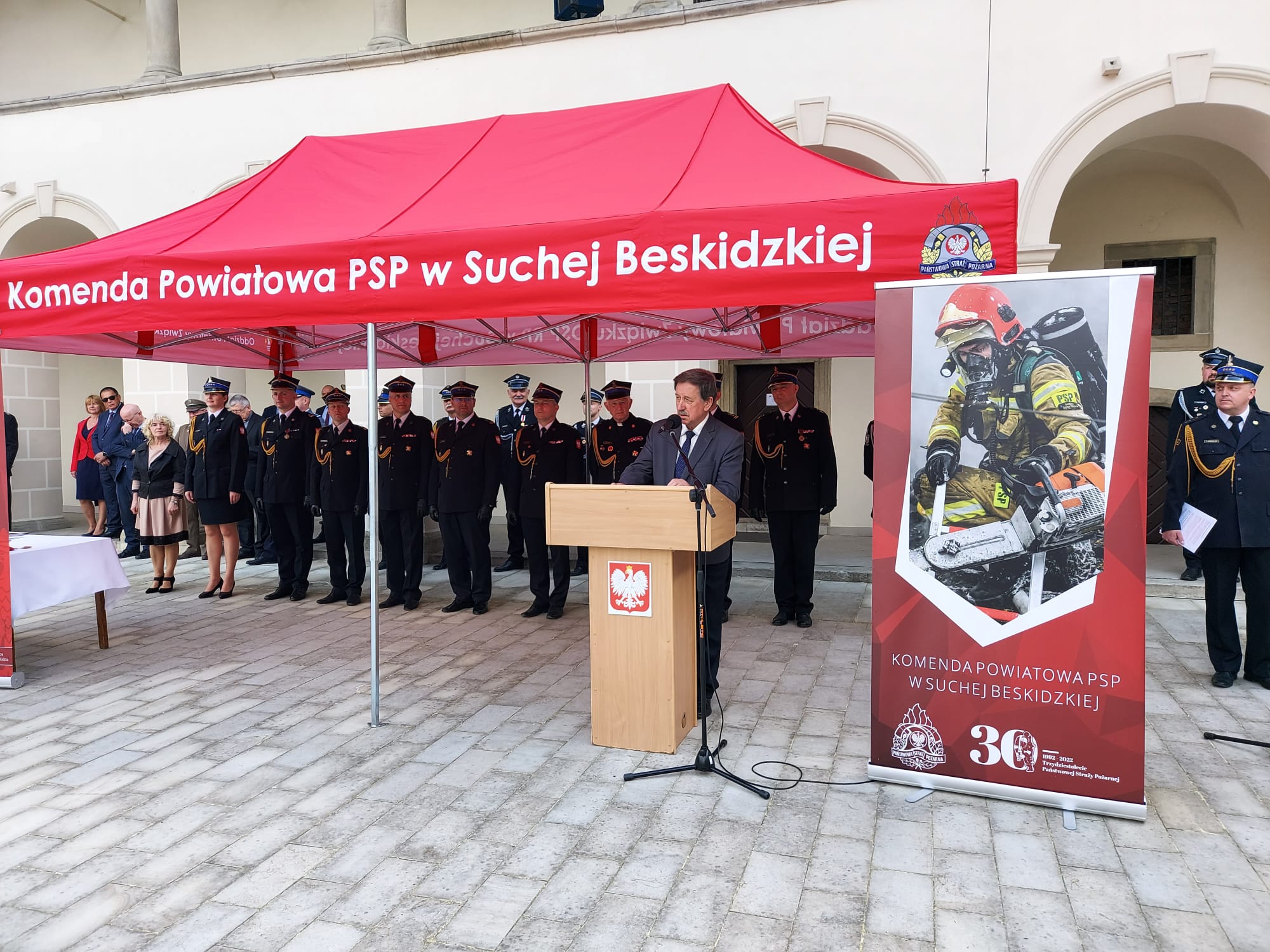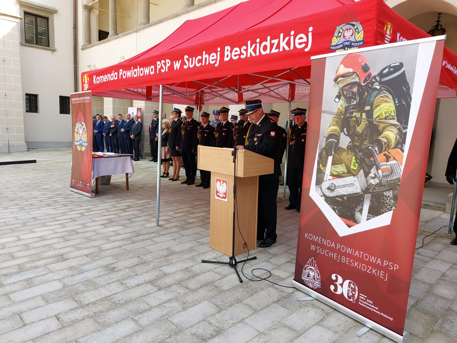 Komendant Powiatowy PSP w Suchej Beskidzkiej powitał gości przybyłych na uroczystość oraz podsumował 30 lat Państwowej Straży Pożarnej oraz pożarnictwa ziemi suskiej.