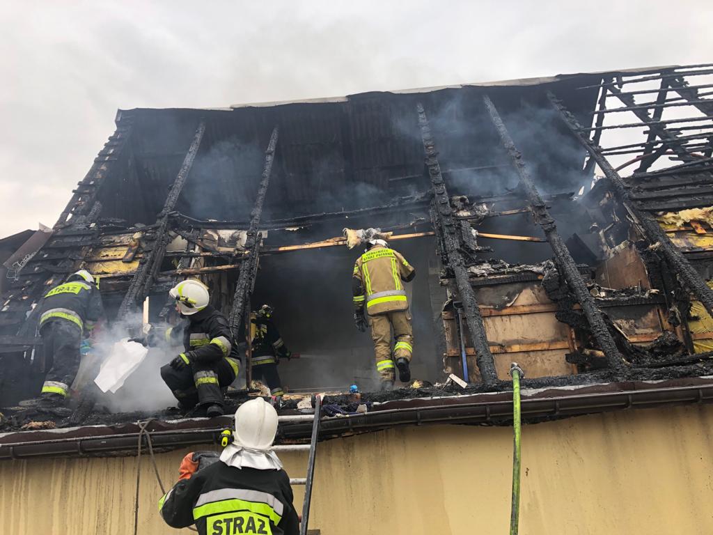 W pierwszej fazie działań strażacy zabezpieczeni w sprzęt ochrony dróg oddechowych weszli do wewnątrz budynku. W budynku panowało duże zadymienie. Wykonano otwory w dachu celem oddymienia. O godzinie 15:59 pożar przestał się rozprzestrzeniać. Następnie przystąpiono do dogaszania pożaru oraz usuwania nadpalonych elementów poszycia dachowego.