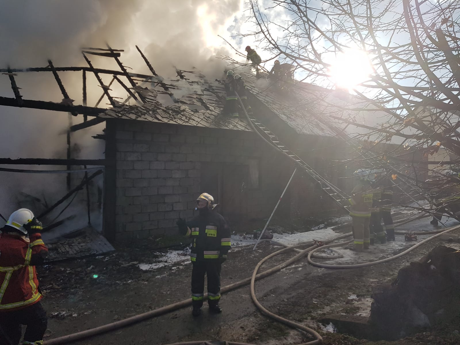 W pierwszej fazie działań udzielono kwalifikowanej pierwszej pomocy osobie poszkodowanej oraz przystąpiono do obrony budynku mieszkalnego. Po dojechaniu kolejnych zastępów przystąpiono do gaszenia palącej się części gospodarczej. Między czasie wprowadzono dwóch ratowników w sprzęcie ODO z kamerą termowizyjną celem przeszukania budynku na obecność osób. Następnie przystąpiono do rozbiórki nadpalonej konstrukcji dachu nad częścią gospodarczą oraz mieszkalną.