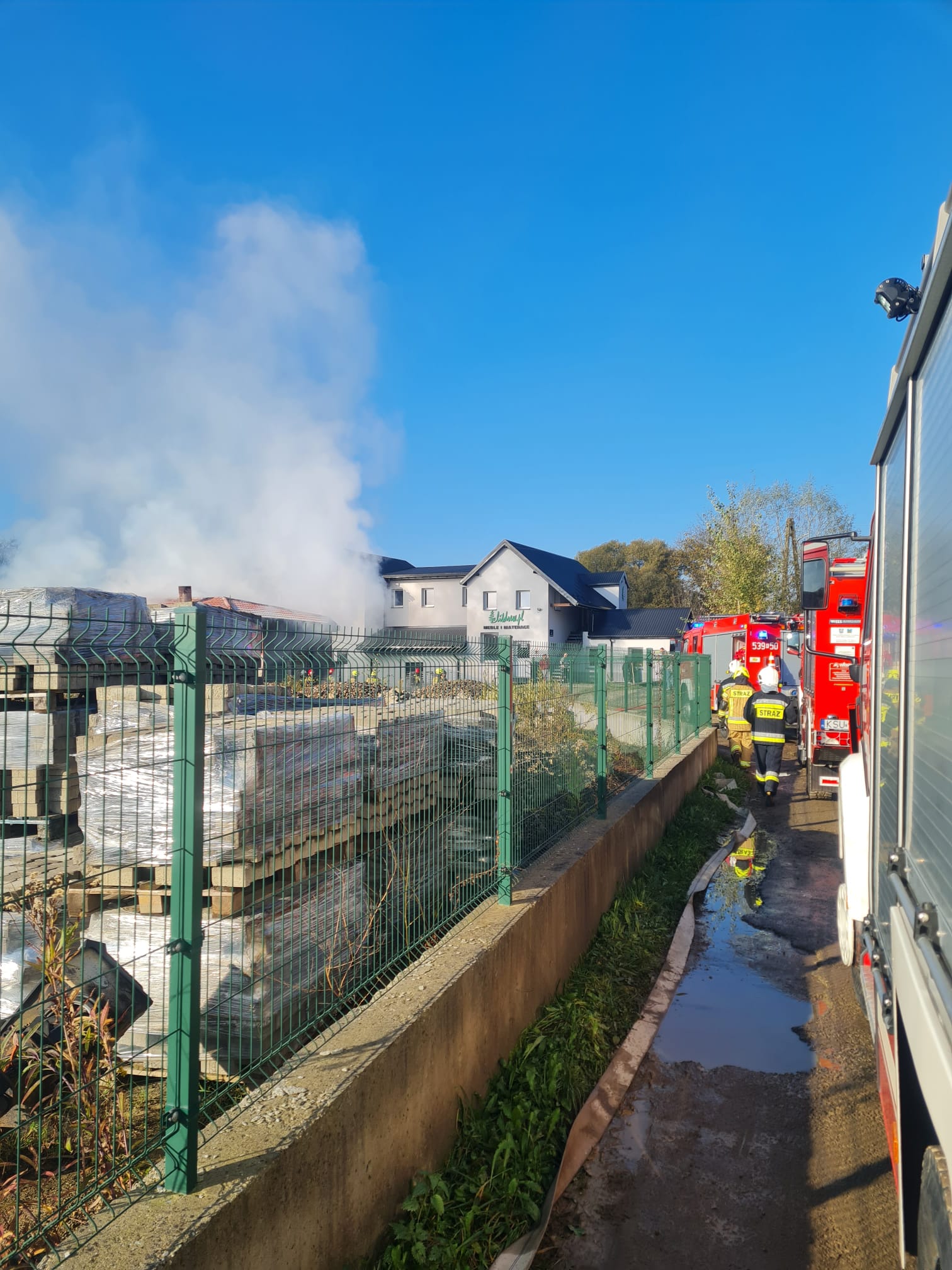 Po dotarciu na miejsce, pierwsze jednostki straży pożarnej zastały pożar rozwinięty budynku warsztatu stolarskiego. Zagrożony budynek administracyjno-biurowy wraz z przylegającym do niego namiotem w którym jest magazyn drewnianych wyrobów gotowych. Pracownicy opuścili budynek przed przybyciem straży pożarnej. Brak osób poszkodowanych. Akcja strażaków skupiła się na opanowaniu ognia oraz obronie zagrożonych obiektów. Do tego celu wykorzystano roztwór środka pianotwórczego, który skuteczniej niż zwykła woda pozwala na szybkie opanowanie pożaru.