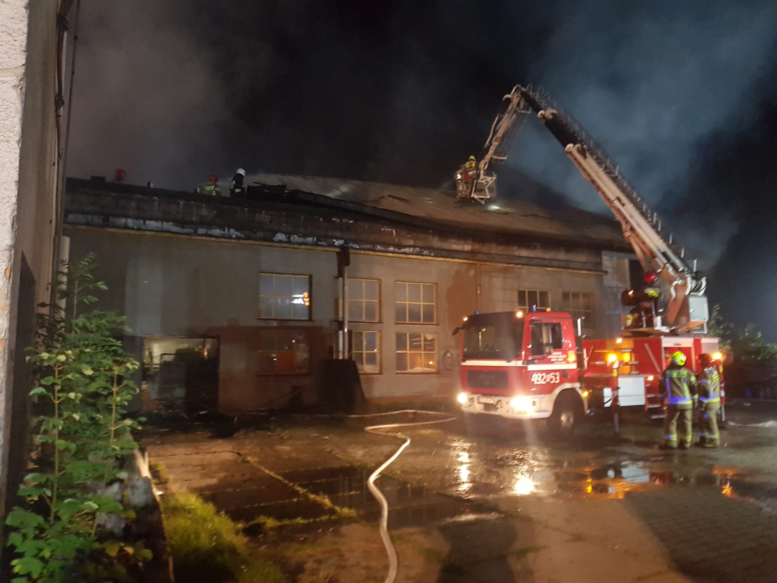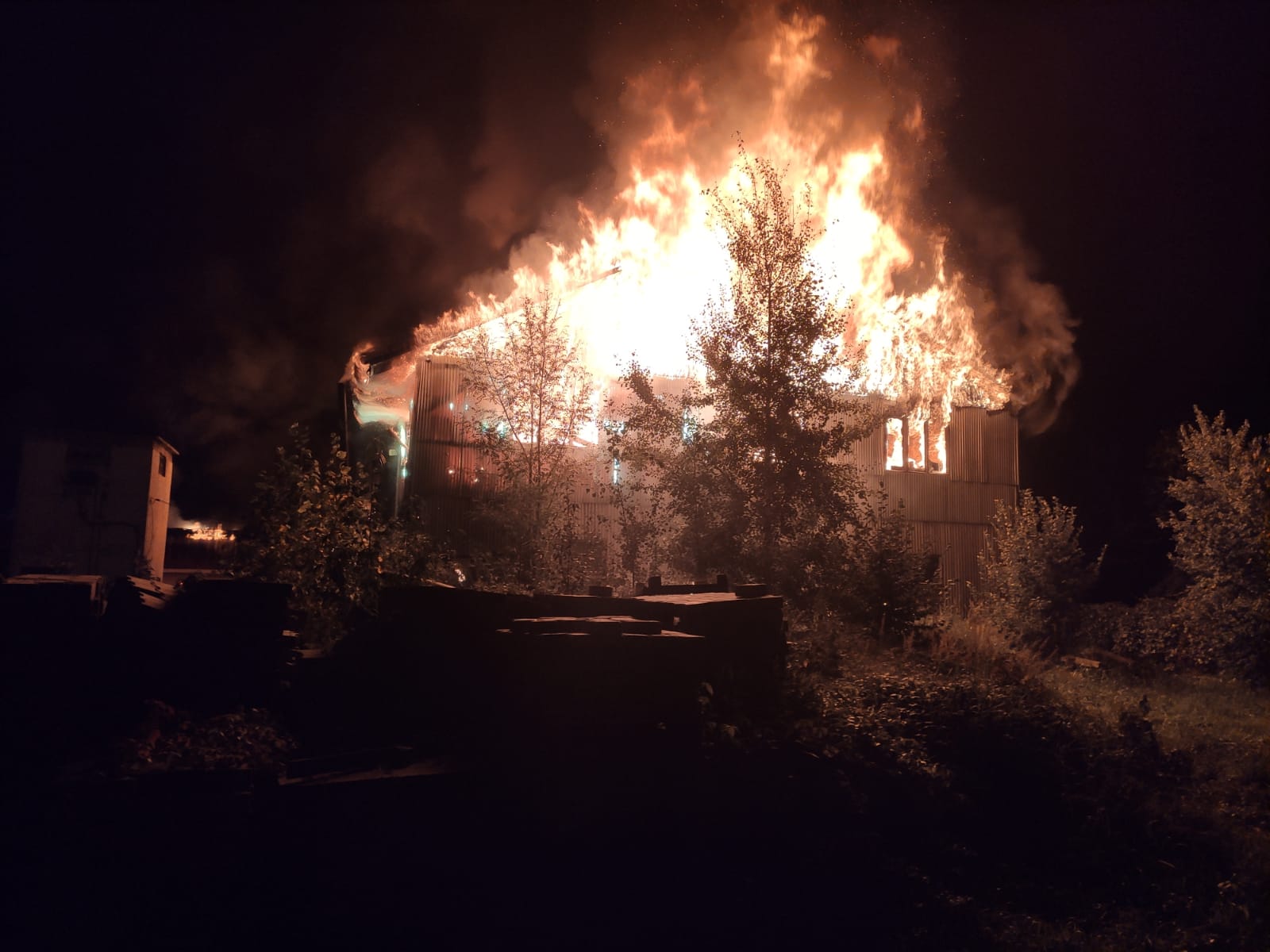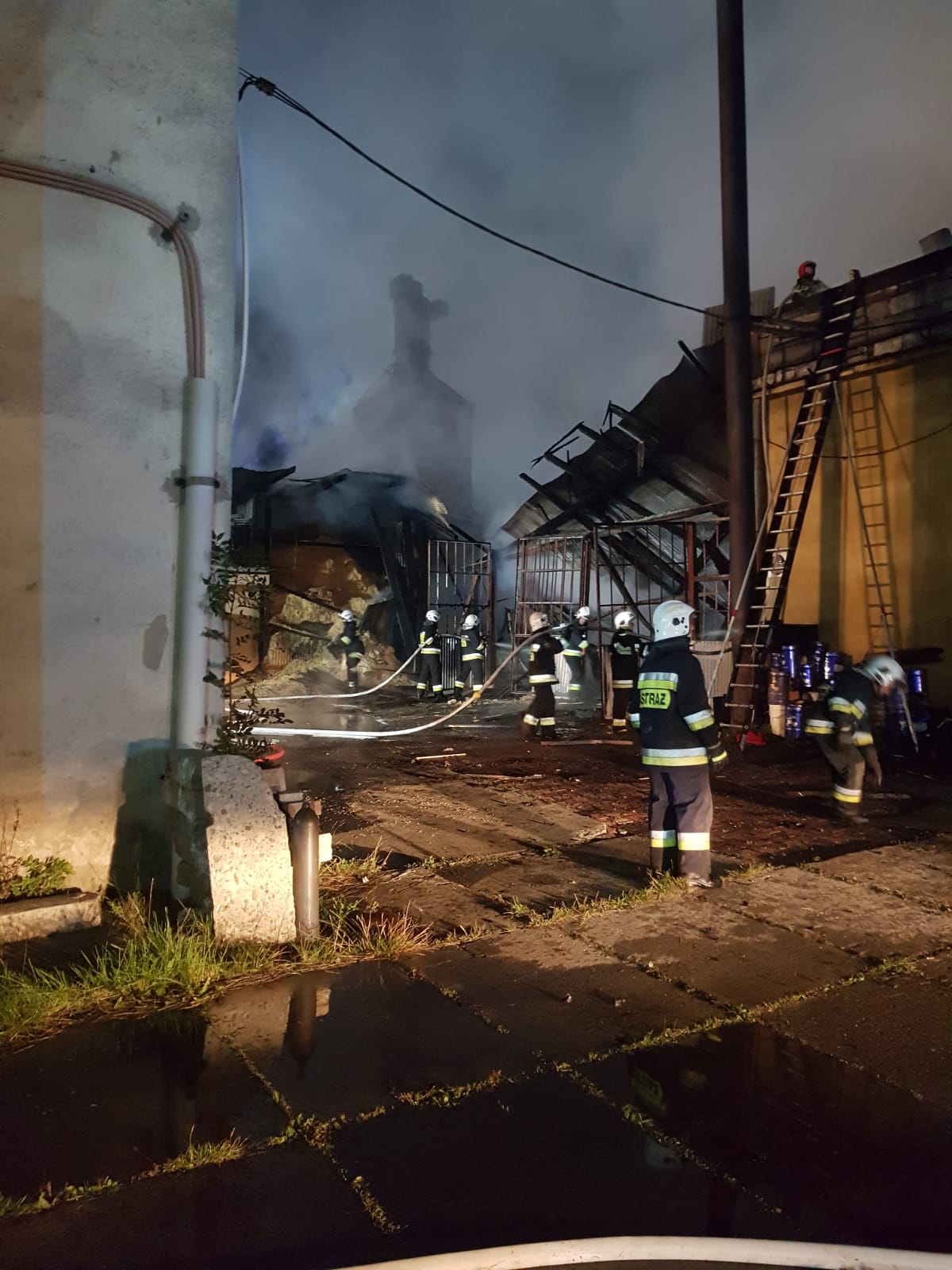 Po dojechaniu na miejsce strażacy zastali pożar budynku zakładu stolarskiego wraz z dwoma wiatami. Ogień wyszedł na zewnątrz i zagrażał dwóm samochodom zaparkowanym pod jedną z wiat oraz budynkowi mieszkalnemu. Na miejscu brak osób poszkodowanych, droga dojazdowa zamknięta bramą.