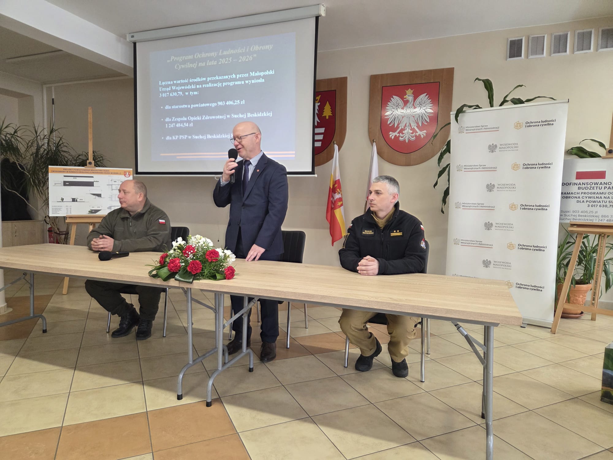 W dniu 17 lutego 2026 roku na terenie Starostwa Powiatowego w Suchej Beskidzkiej odbyło się uroczyste przekazanie pojazdów, specjalistycznego sprzętu oraz wyposażenia zakupionego w ramach realizacji zadań z zakresu Ochrony Ludności i Obrony Cywilnej.