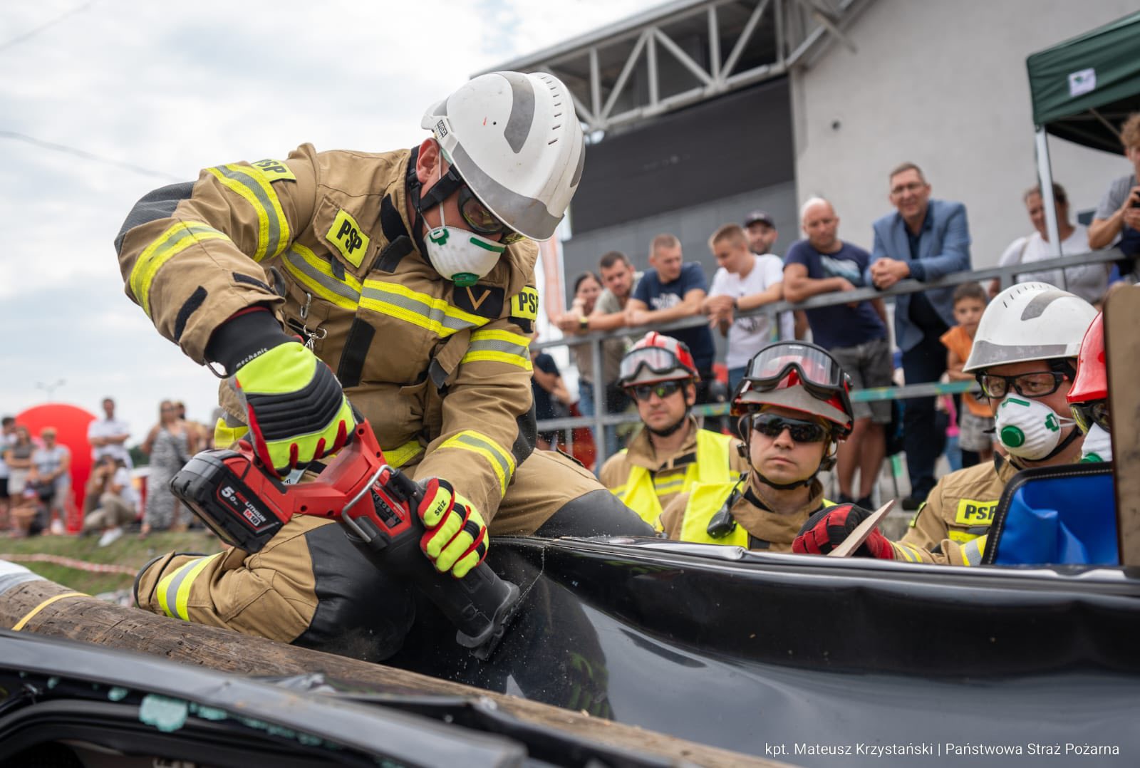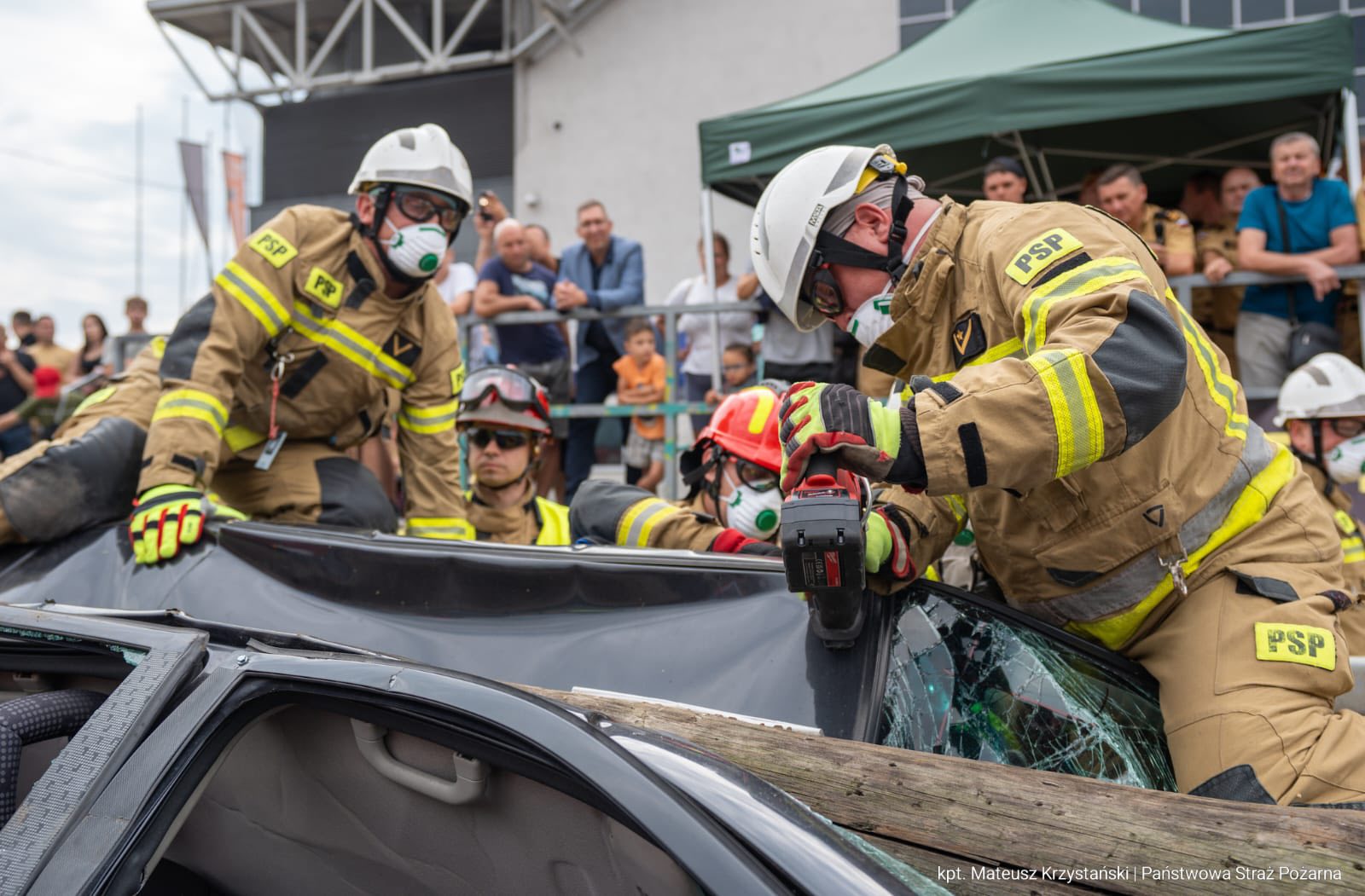 Strażacy podczas założenia musieli zmierzyć się z symulacją poważnego wypadku – na samochód osobowy spadł słup energetyczny oraz drzewo, a samochód został zaklinowany pomiędzy barierami energochłonnymi. Drzewo oraz słup całkowicie zgniotły dach pojazdu i uwięziły kierowcę w środku.