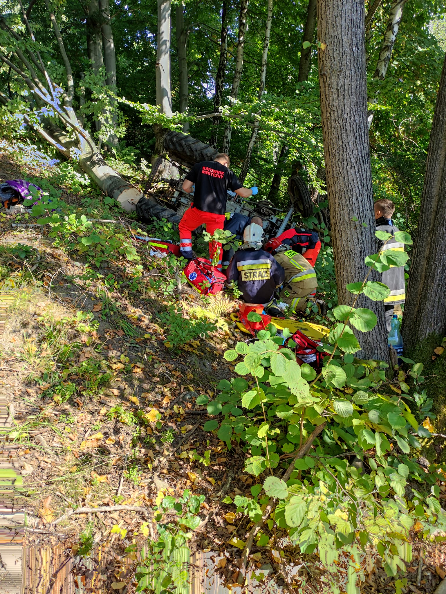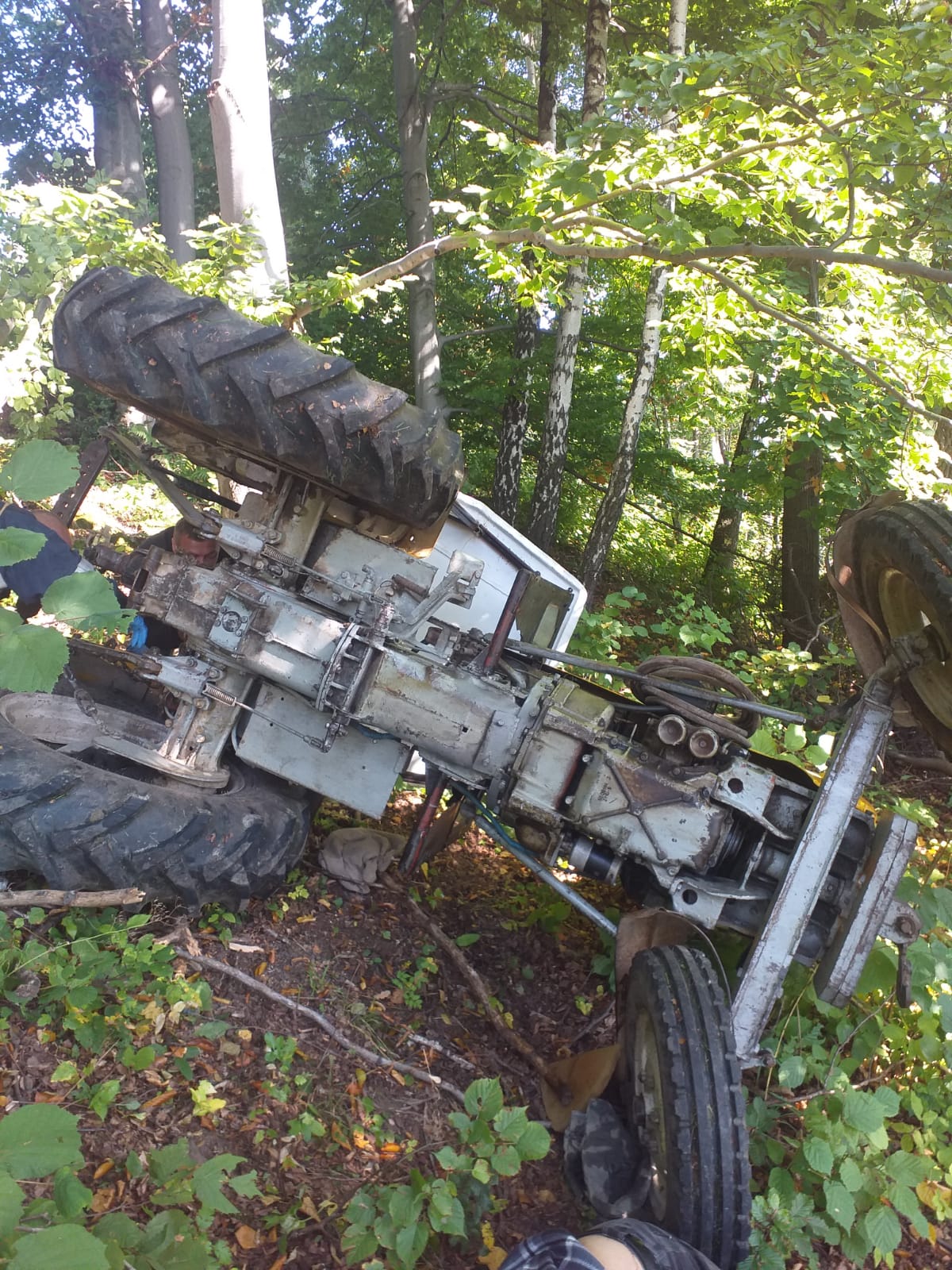 Po dojechaniu na miejsce strażacy zastali przewrócony ciągnik rolniczy w lesie, kierowca ciągnika leżał obok niego, sam wydostał się spod przewróconego ciągnika przed przybyciem straży pożarnej na miejsce zdarzania.