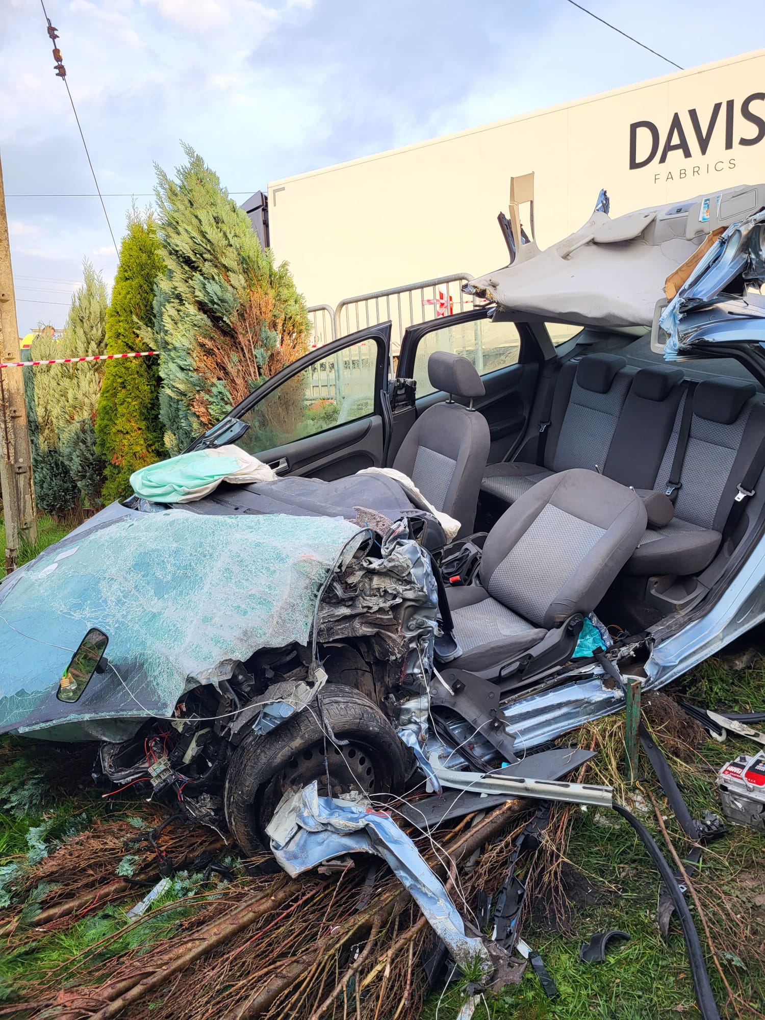Strażacy zabezpieczyli miejsce zdarzenia. Następnie przystąpiono do ewakuacji poszkodowanego z pojazdu. Za pomocą narzędzi hydraulicznych (nożyce, rozpieracz ramieniowy i rozpieracz kolumnowy) usunięto: dach pojazdu, drzwi lewe, i odciągnięto kokpit wraz z kolumną kierowniczą. W dalszej kolejności przekazano poszkodowanego przybyłemu na miejsce zespołowi ratownictwa medycznego. Poszkodowany został przetransportowany do szpitala Lotniczego Pogotowia Ratunkowego.