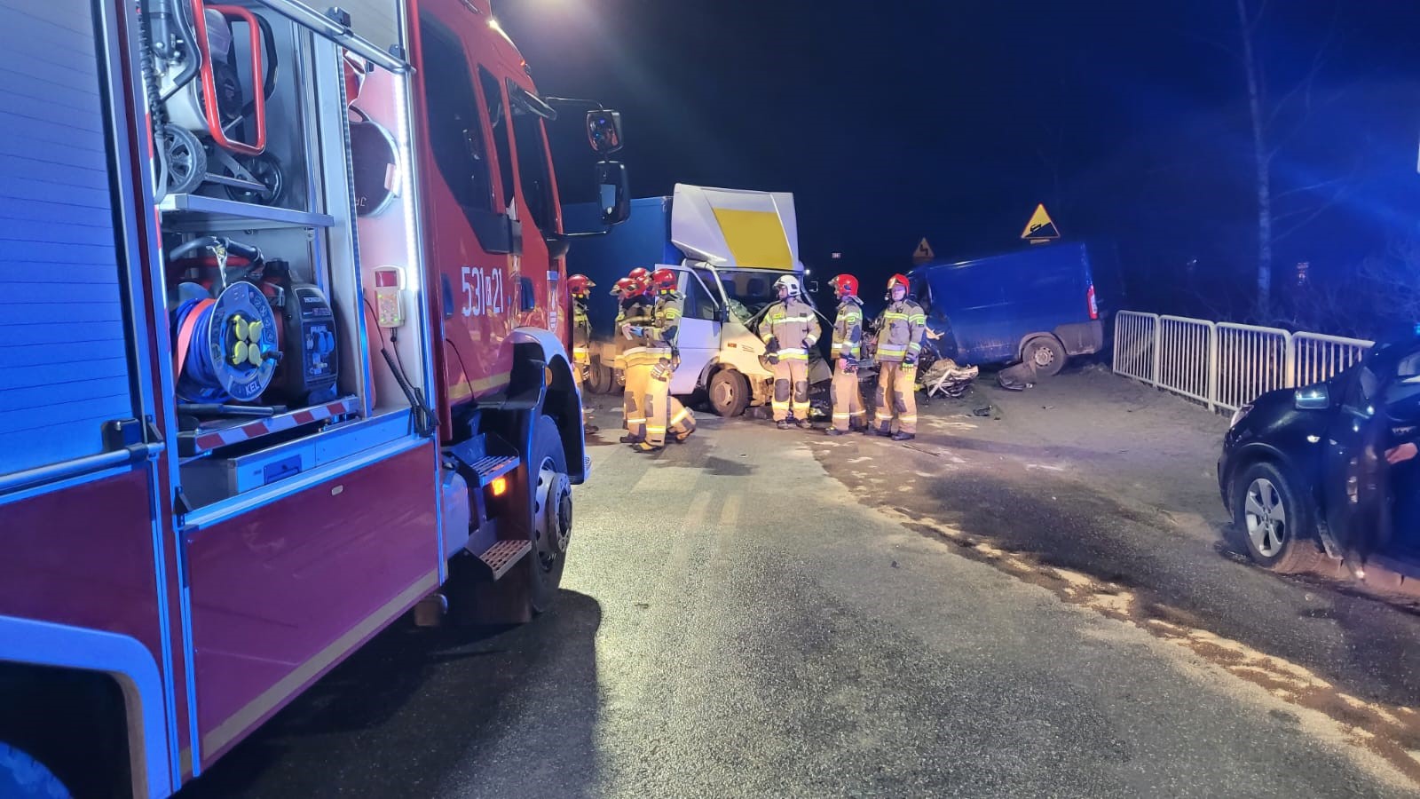 Po dojeździe na miejsce zdarzenia strażacy zastali zderzenie czołowe dwóch samochodów dostawczych. Na miejscu zdarzenia 5 osób poszkodowanych - w tym jedno dziecko. W jednym z samochodów znajdowała się osoba uwięziona.