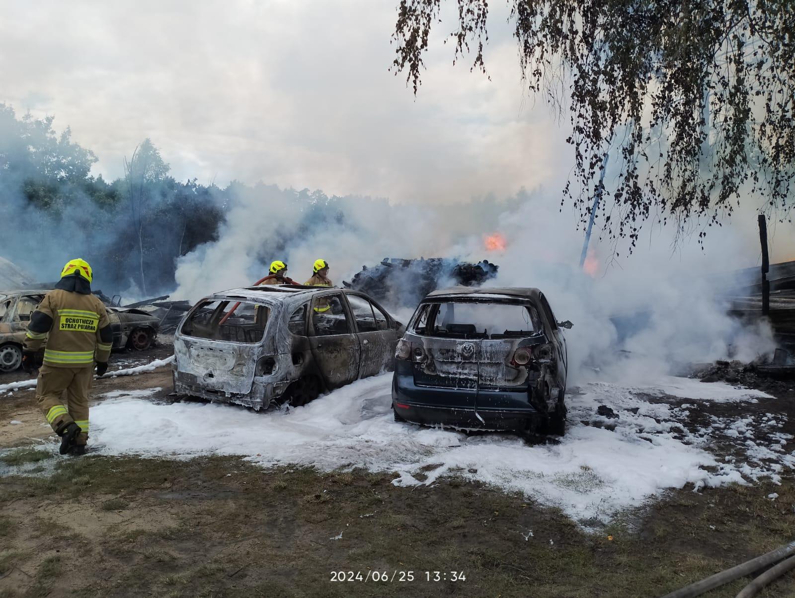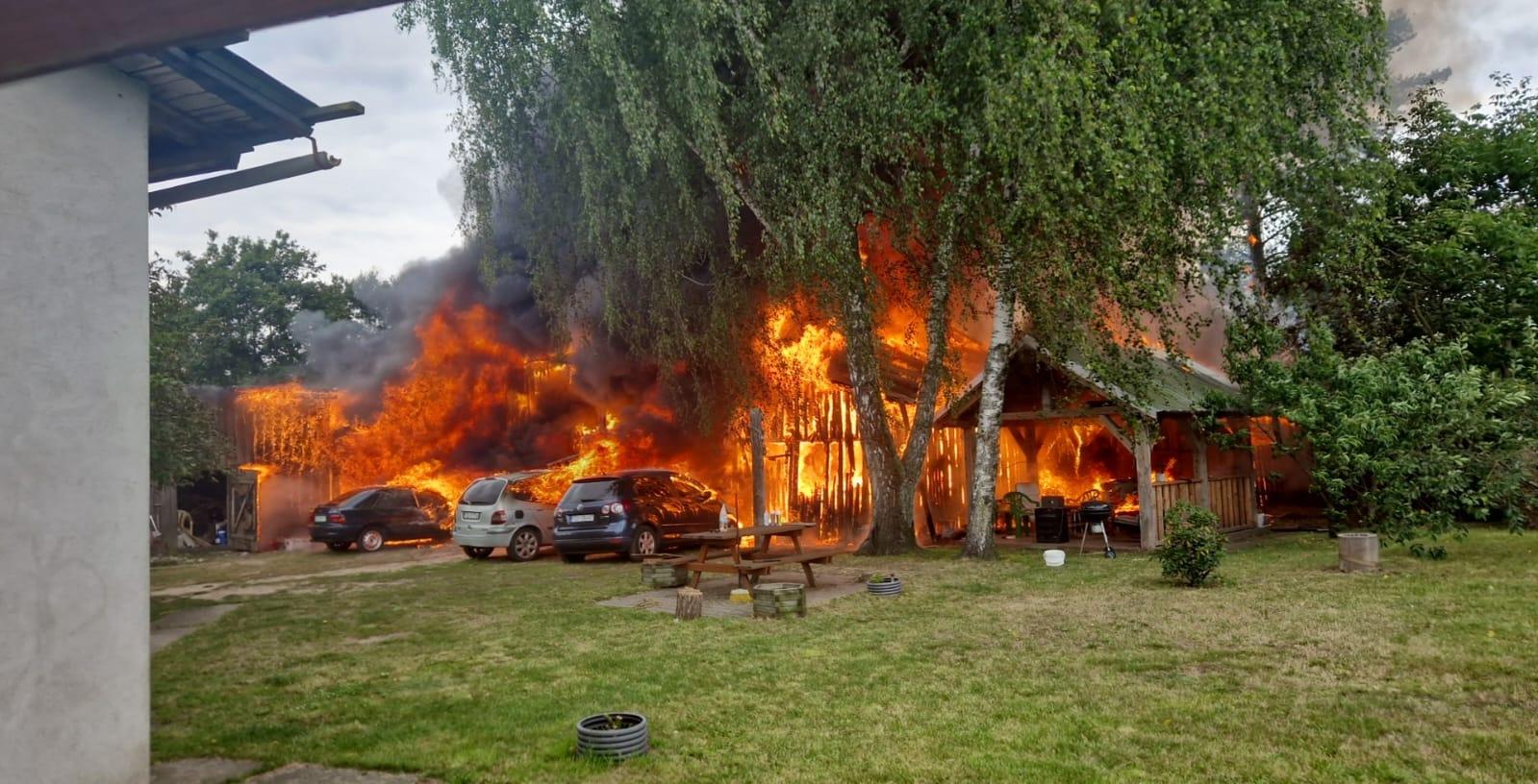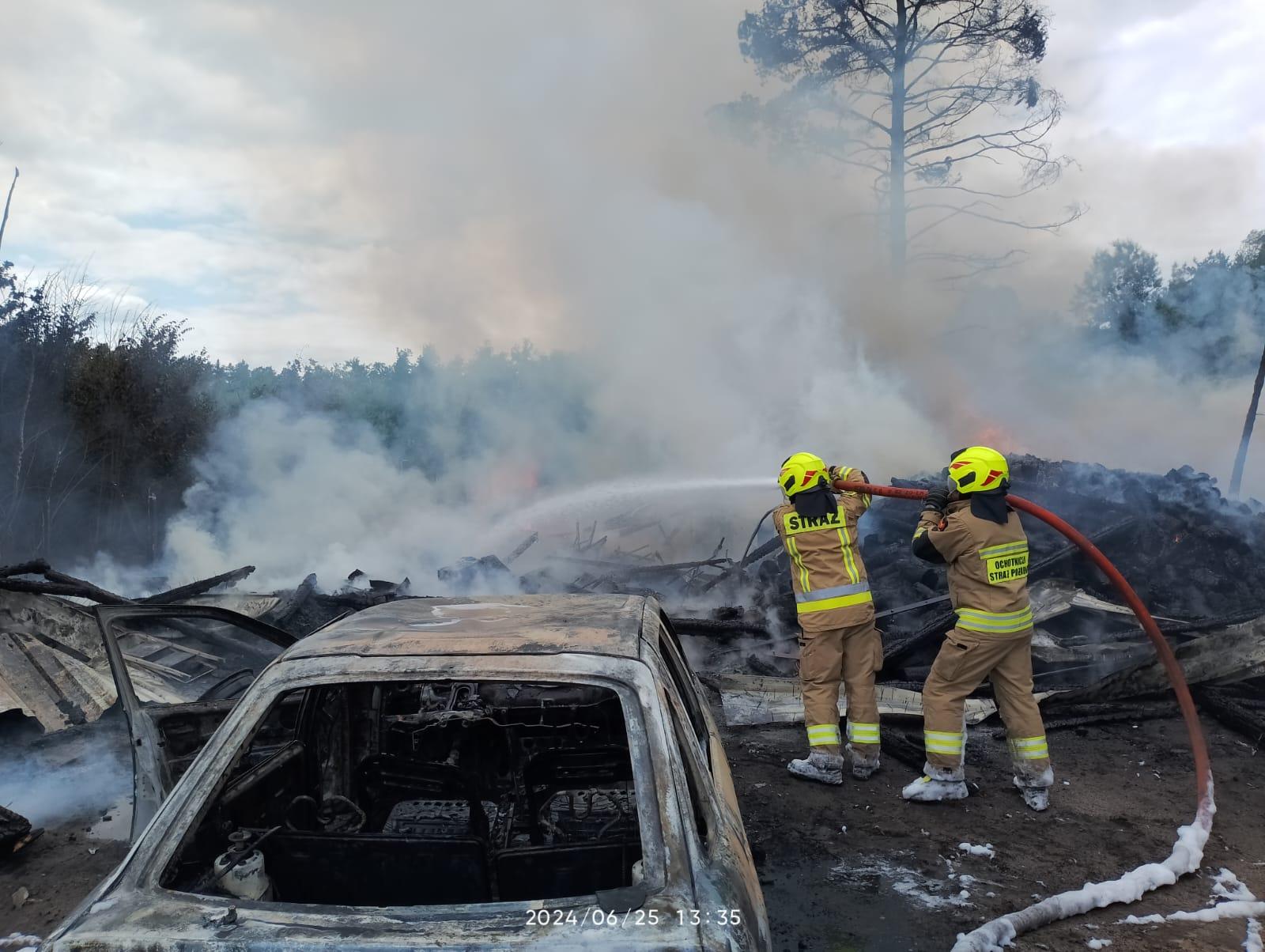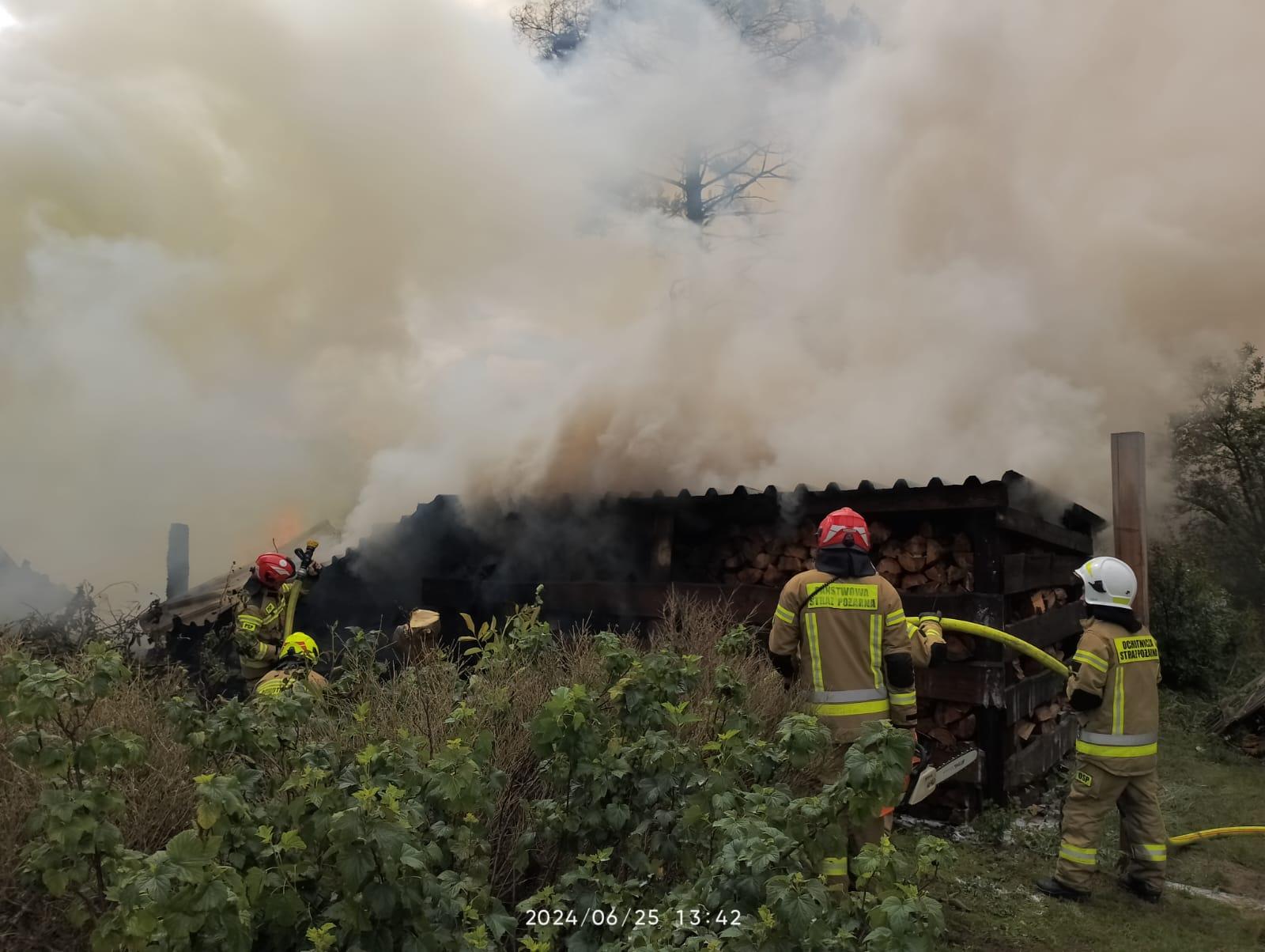 W dniu wczorajszym zastępy JOP zostały zadysponowane do pożaru w miejscowości Gądków Wlk., gdzie według zgłoszenia palił się budynek gospodarczy. Po przybyciu pierwszych jednostek na miejsce zdarzenia zastano, w pełni rozwinięty pożar budynku gospodarczego, zlokalizowanych w jego pobliżu wiat ze składowanym w nich drewnem opałowym, hałd składowanego drewna w metrach oraz trzech samochodów osobowych. Dodatkowo pożar rozprzestrzeniał po powierzchni w kierunku pobliskiego kompleksu leśnego, a oddziaływanie termiczne pożaru zagrażało pobliskiemu budynkowi mieszkalnemu. Działania zastępów polegały na zabezpieczeniu miejsca zdarzenia, podaniu prądów gaśniczych wody i piany na palące się obiekty, oraz w obronie budynku mieszkalnego i kompleksu leśnego. Po ugaszeniu pożaru pogorzelisko zostało dogaszone i sprawdzone kamerą termowizyjną. Przy dogaszaniu wykorzystywany był ciężki sprzęt w postaci ładowarki teleskopowej i dźwigu. W działaniach udział brały zastępy z OSP Gądków Wlk., OSP Torzym, OSP Glisno, OSP Trzebów, OSP Krzeszyce, oraz 4 zastępy z JRG Sulęcin.