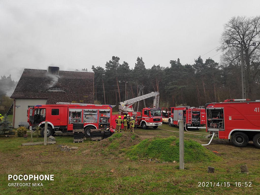 11 zastępów PSP i OSP prowadziło działania przy pożarze poddasza budynku jednorodzinnego. Mimo szybkiej ewakuacji osoby nieprzytomnej z budynku, a następnie resuscytacji przez strażaków i zespół PRM nie udało jej się uratować. Po ugaszeniu pożaru konieczne było wykonywanie dodatkowych prac, w tym wycinanie otworów w stropie, celem lokalizacji ukrytych ognisk pożaru.