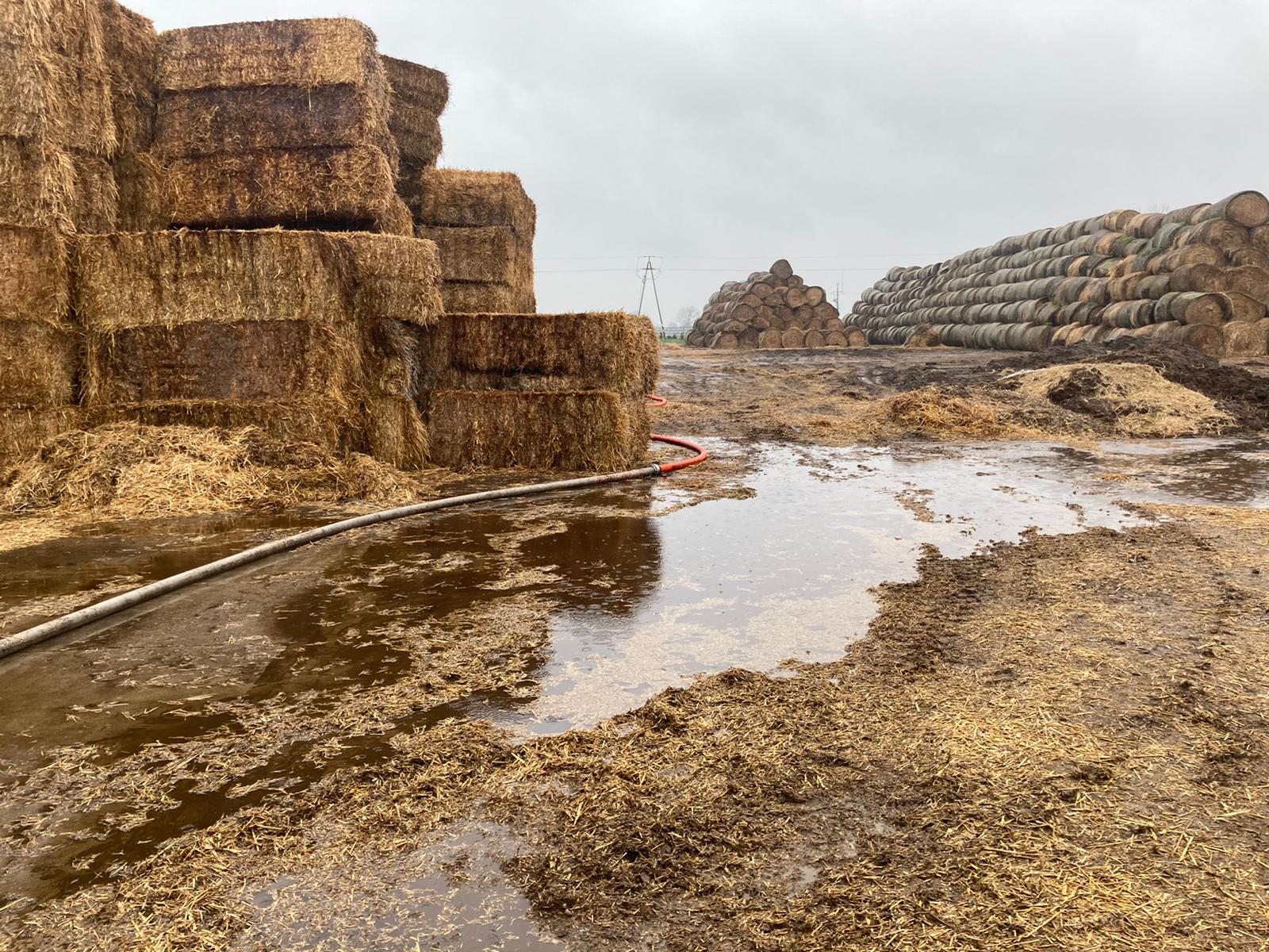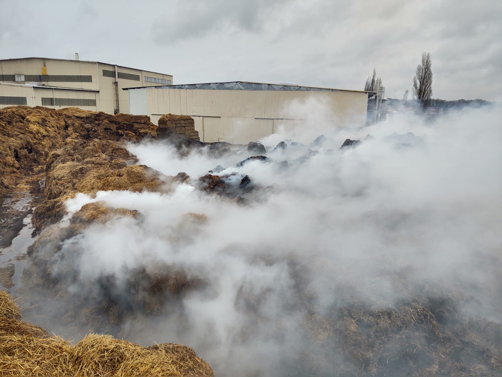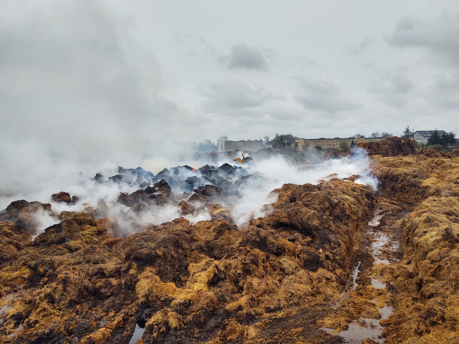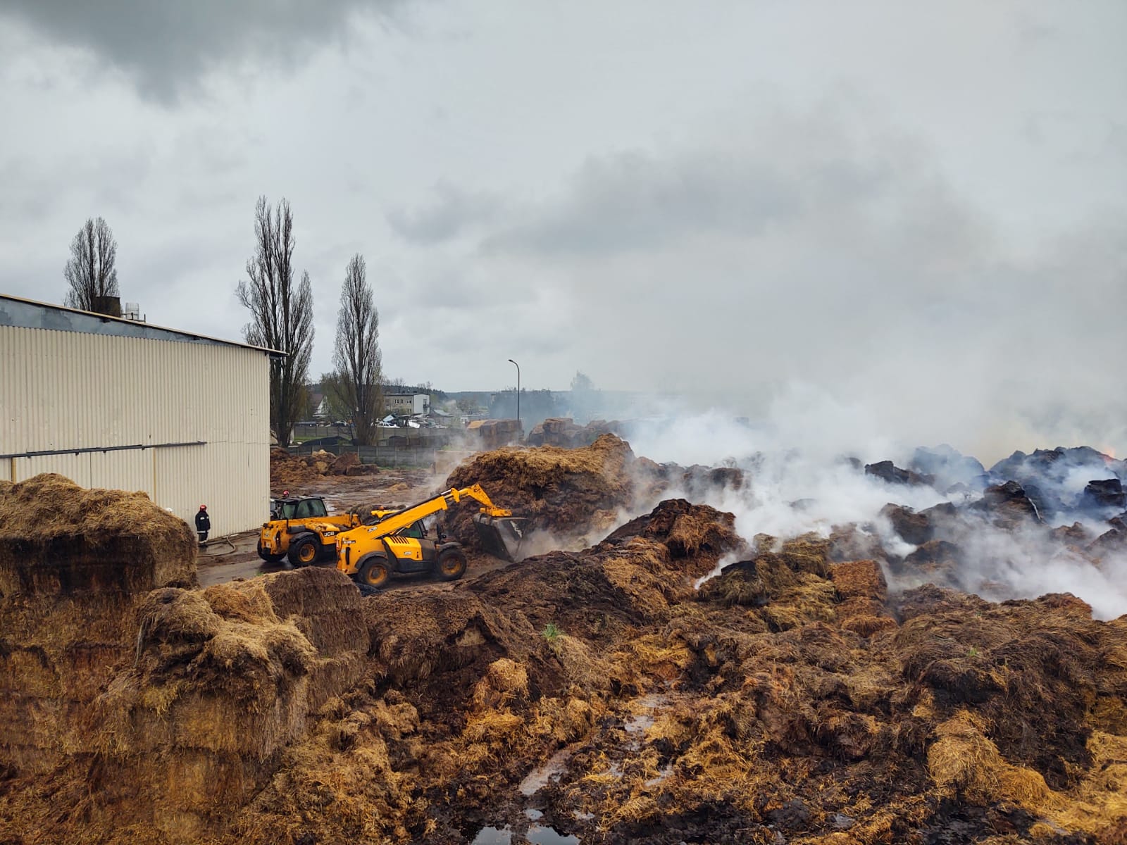i zaangażowaniu znacznych sił, również ze strony właściciela obiektu, większą część stogu udało się uratować. Ogniem zagrożone były również pobliskie stogi oraz budynek produkcyjny. W pierwszej fazie działań, przy niewystarczającej ilości sił i środków działania ratowników skupiły się na obronie budynku oraz stogów sąsiednich. Po dojeździe kolejnych zastępów zintensyfikowano działania gaśnicze. Przy pomocy ładowaczy, udostępnionych przez właściciela, odizolowano palący się obszar od niezajętego ogniem, co pozwoliło na lokalizację pożaru. Dalsze działania polegały na rozgarnianiu palącej się hałdy