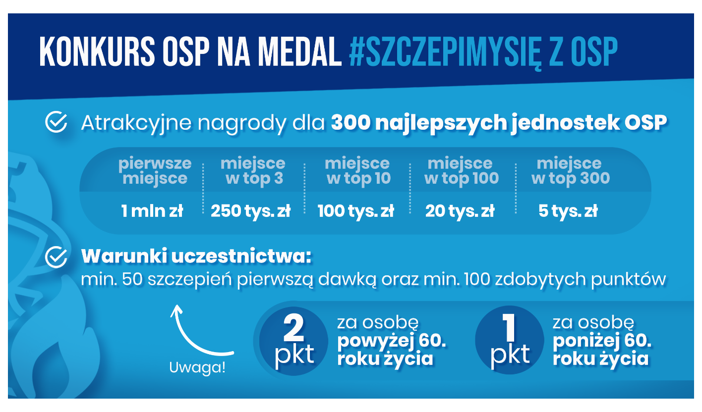 Uwaga! Warunkiem wzięcia udziału w konkursie jest zaszczepienie minimum 50 osób pierwszą dawką oraz uzyskanie minimum 100 punktów przez jednostkę OSP.