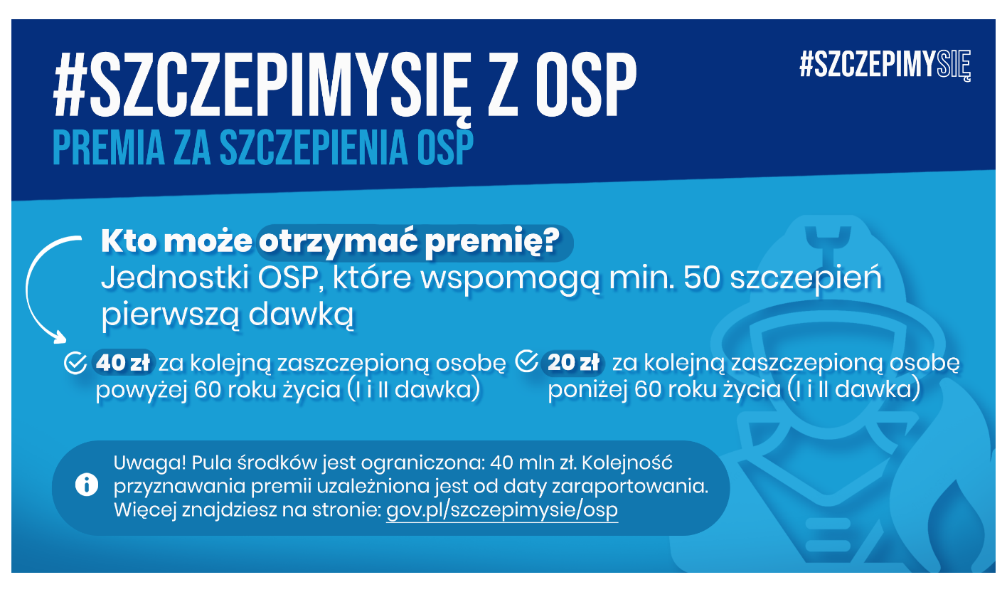 - Premia za Szczepienia OSP: 20 lub 40 zł (w zależności od wieku zaszczepionej osoby) dla OSP za pomoc w zaszczepieniu każdej kolejnej osoby.