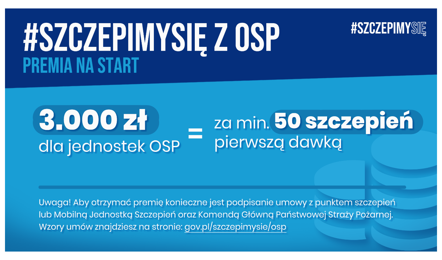 - Premia na Start: 3 tys. zł dla jednostki OSP za pomoc w wykonaniu 50 szczepień pierwszą dawką.