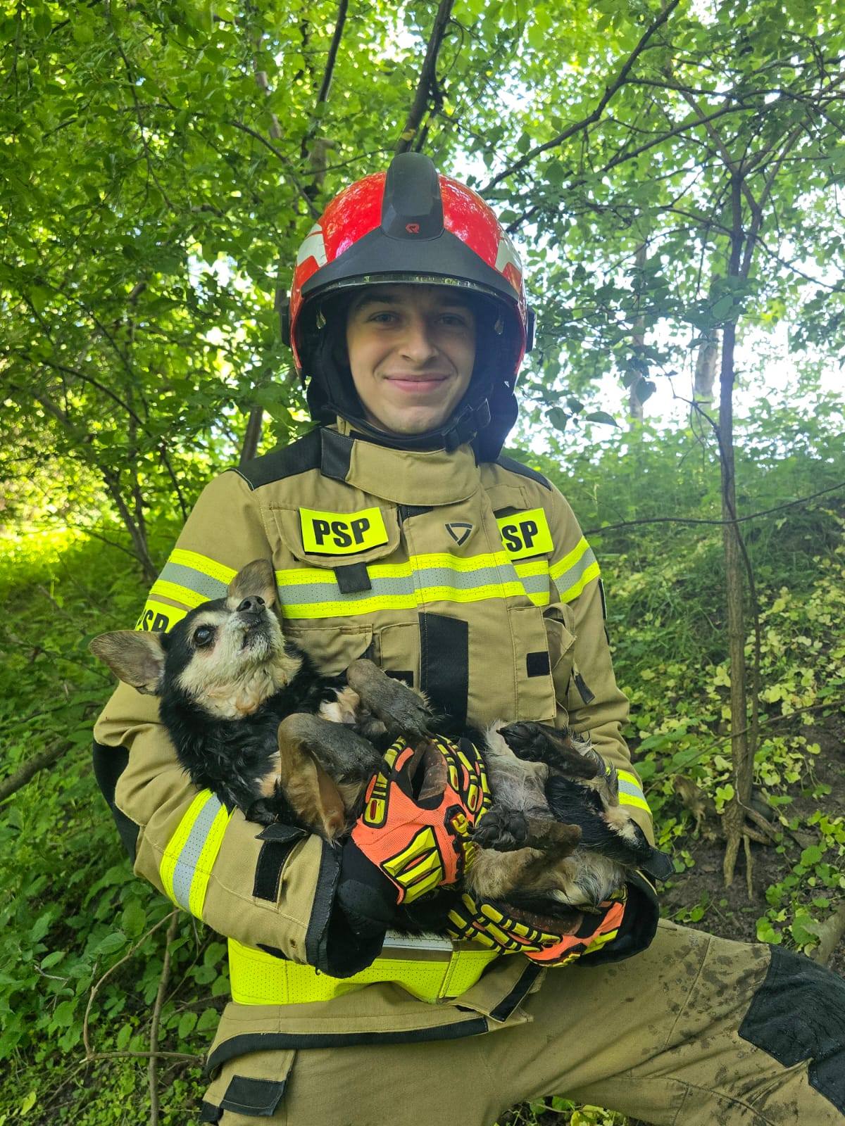 Dzisiaj pomocy potrzebował piesek, który znajdował się w rzece Postomii i nie mógł wydostać się na brzeg. Krótka fotorelacja z nietypowego zdarzenia.