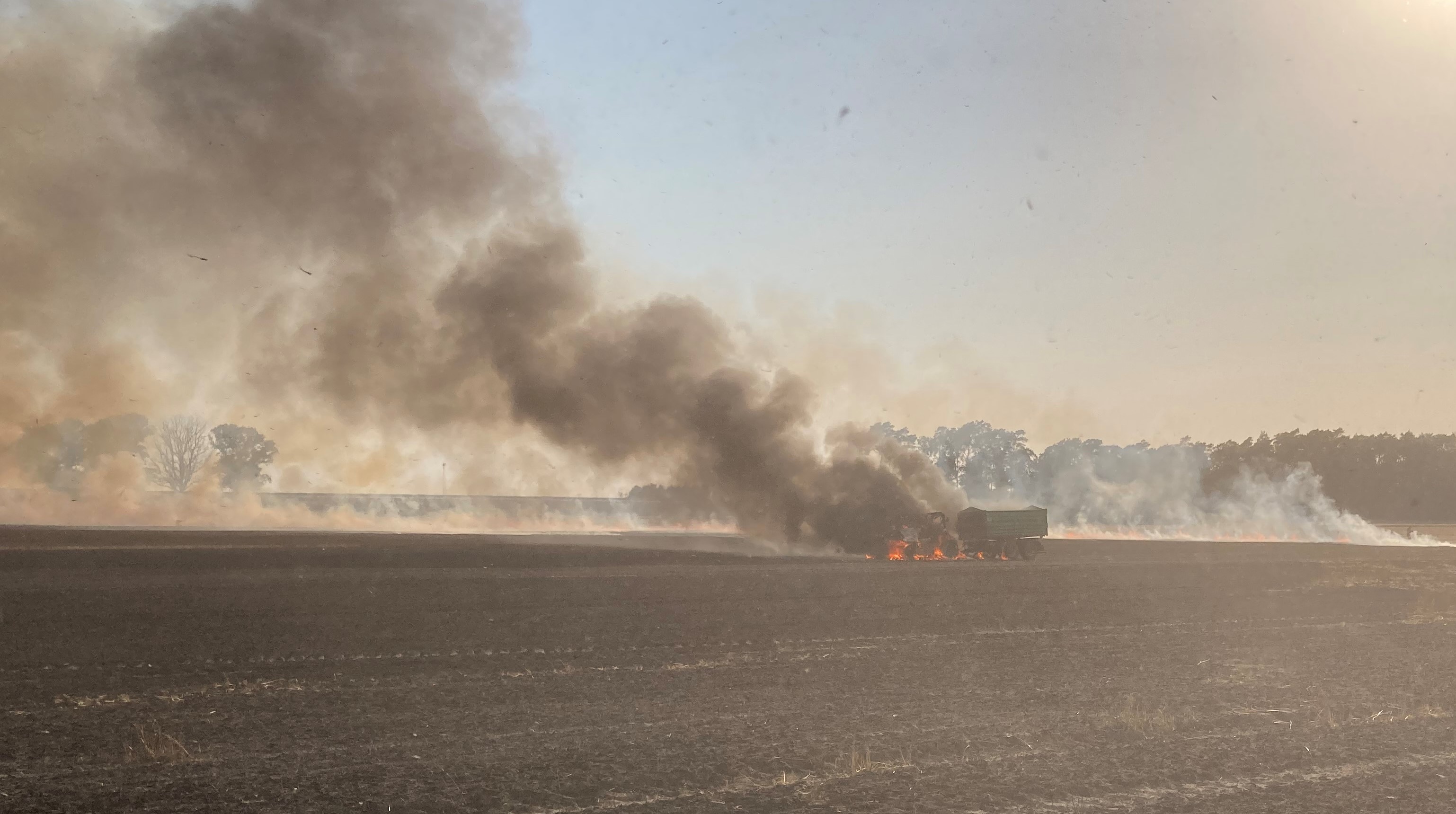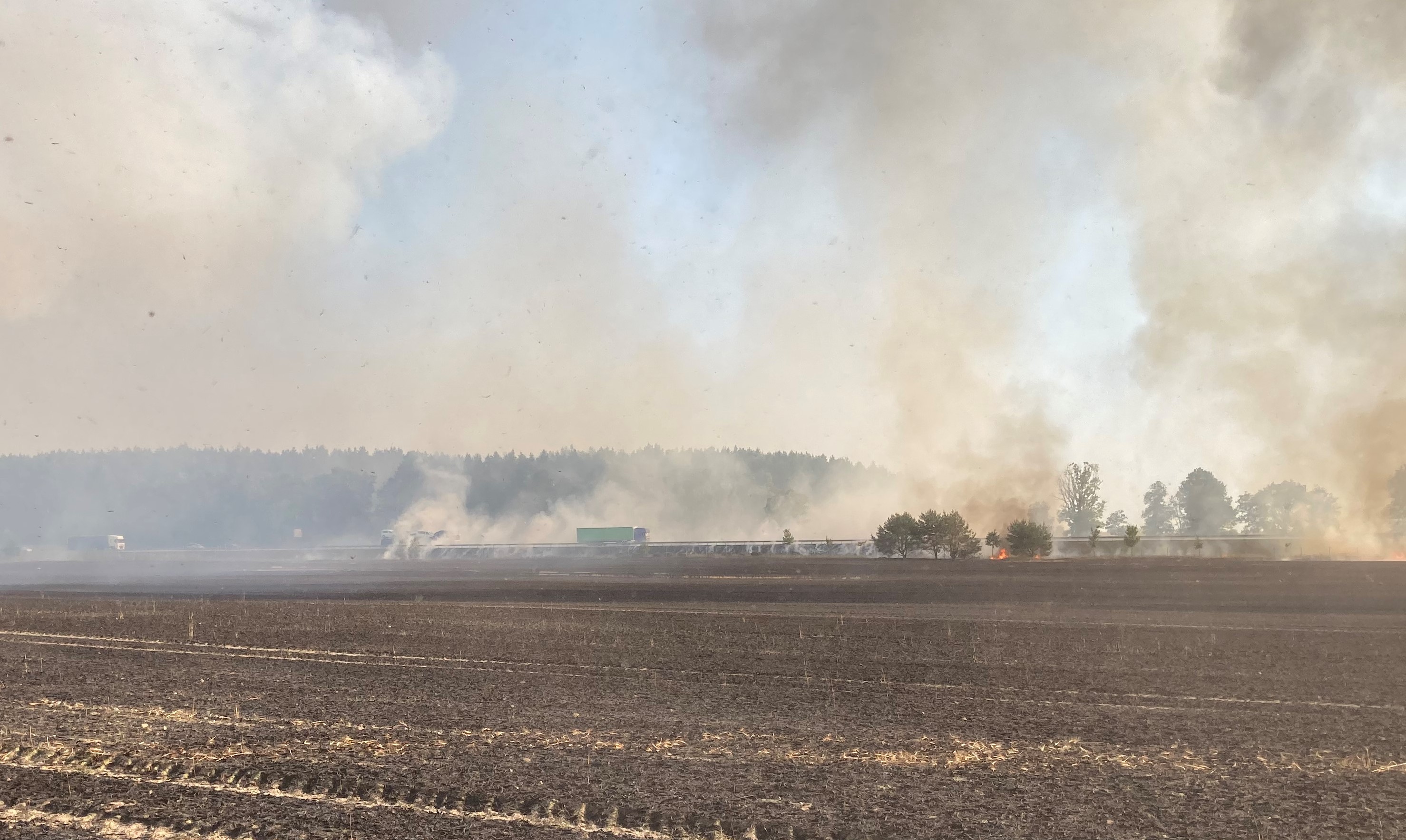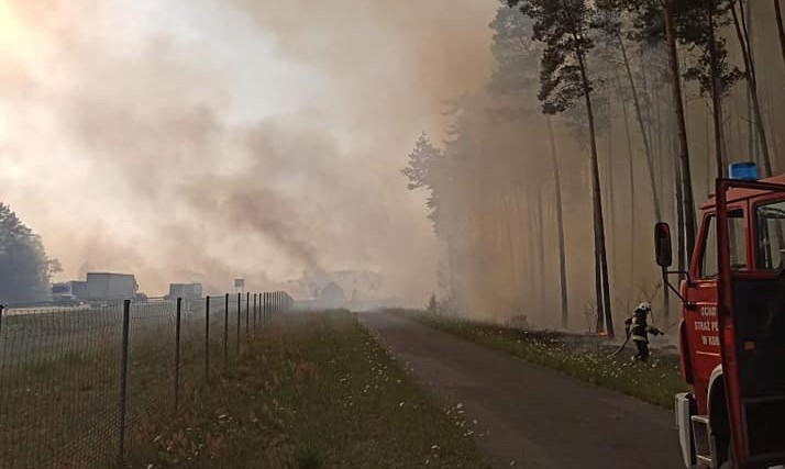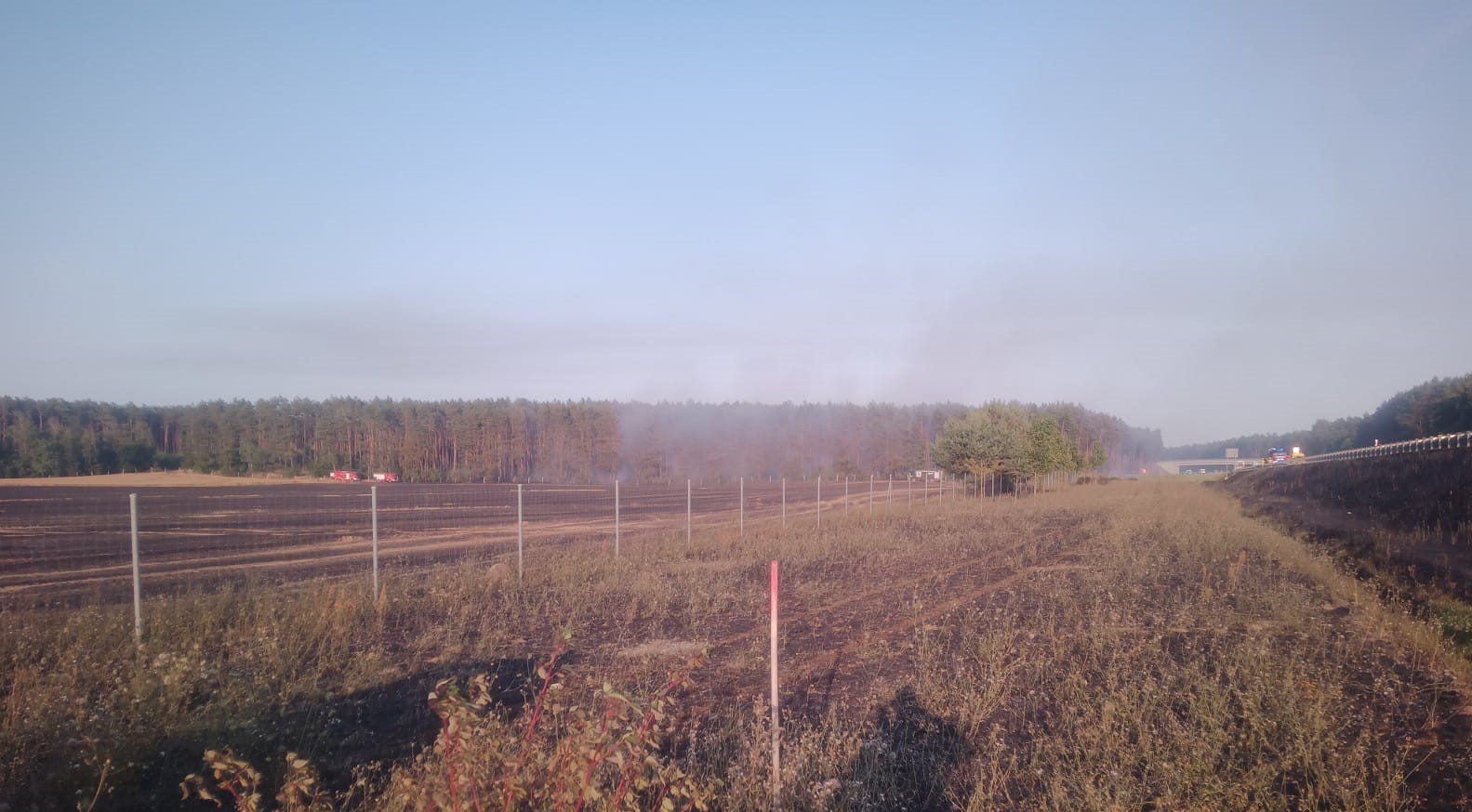 Po dojeździe zastępów na miejsce zdarzenia zastano pożar na polu o powierzchni 86 ha, spaleniu uległo 9 ha zboża na pniu (pszenżyto), ściernisko na powierzchni 6 ha oraz ciągnik rolniczy z przyczepą. Pożar rozprzestrzenił się również na 2 ha ścioły w lesie sosnowym (wiek 48 i 61 lat) oraz trawę w pasie drogowym autostrady A2 na długości ok. 300 m.