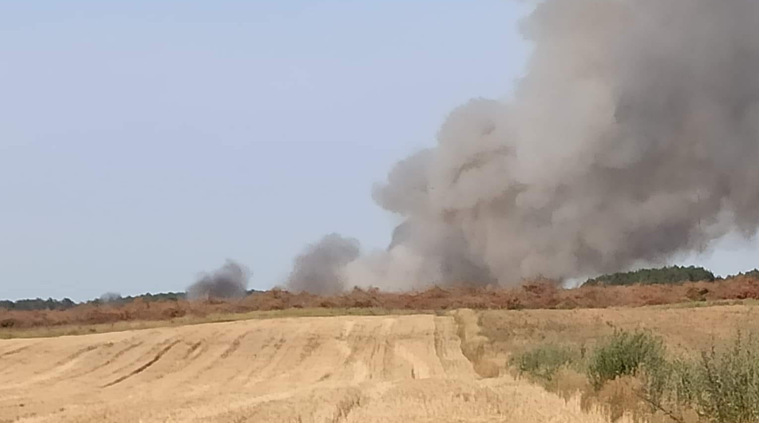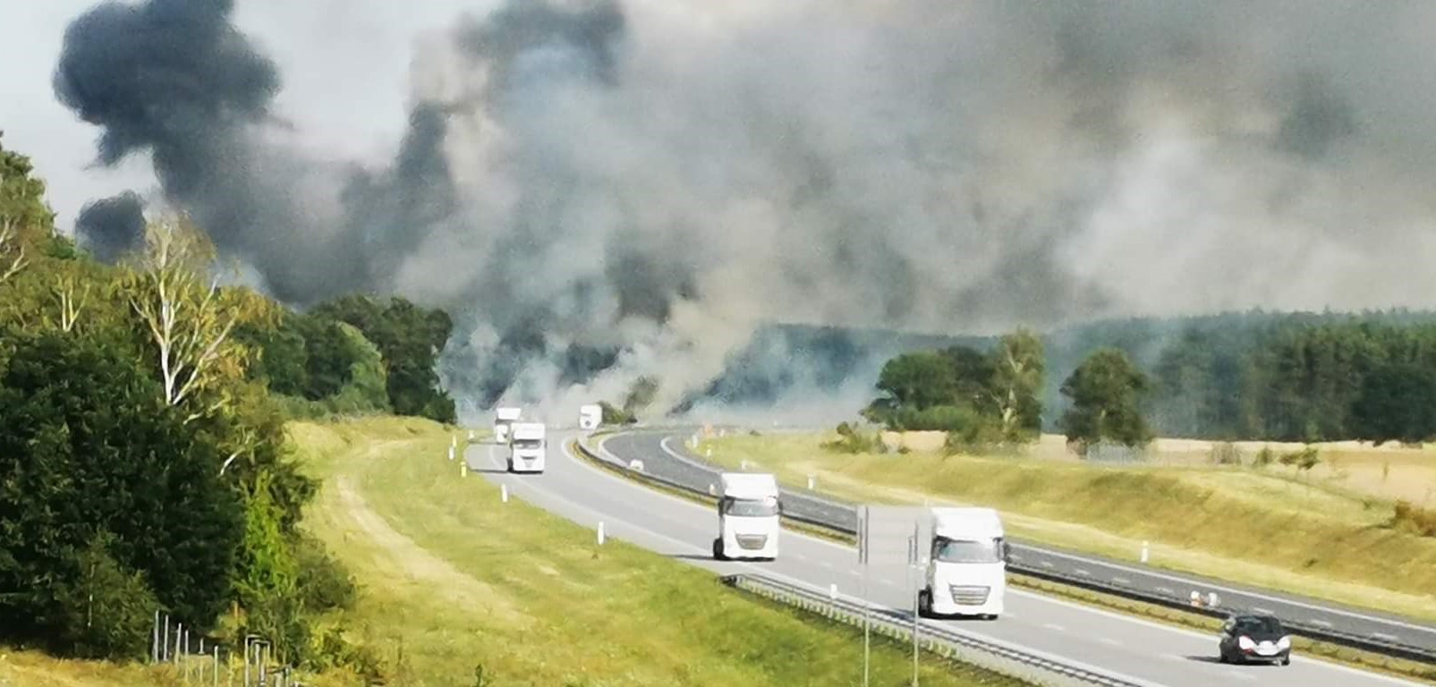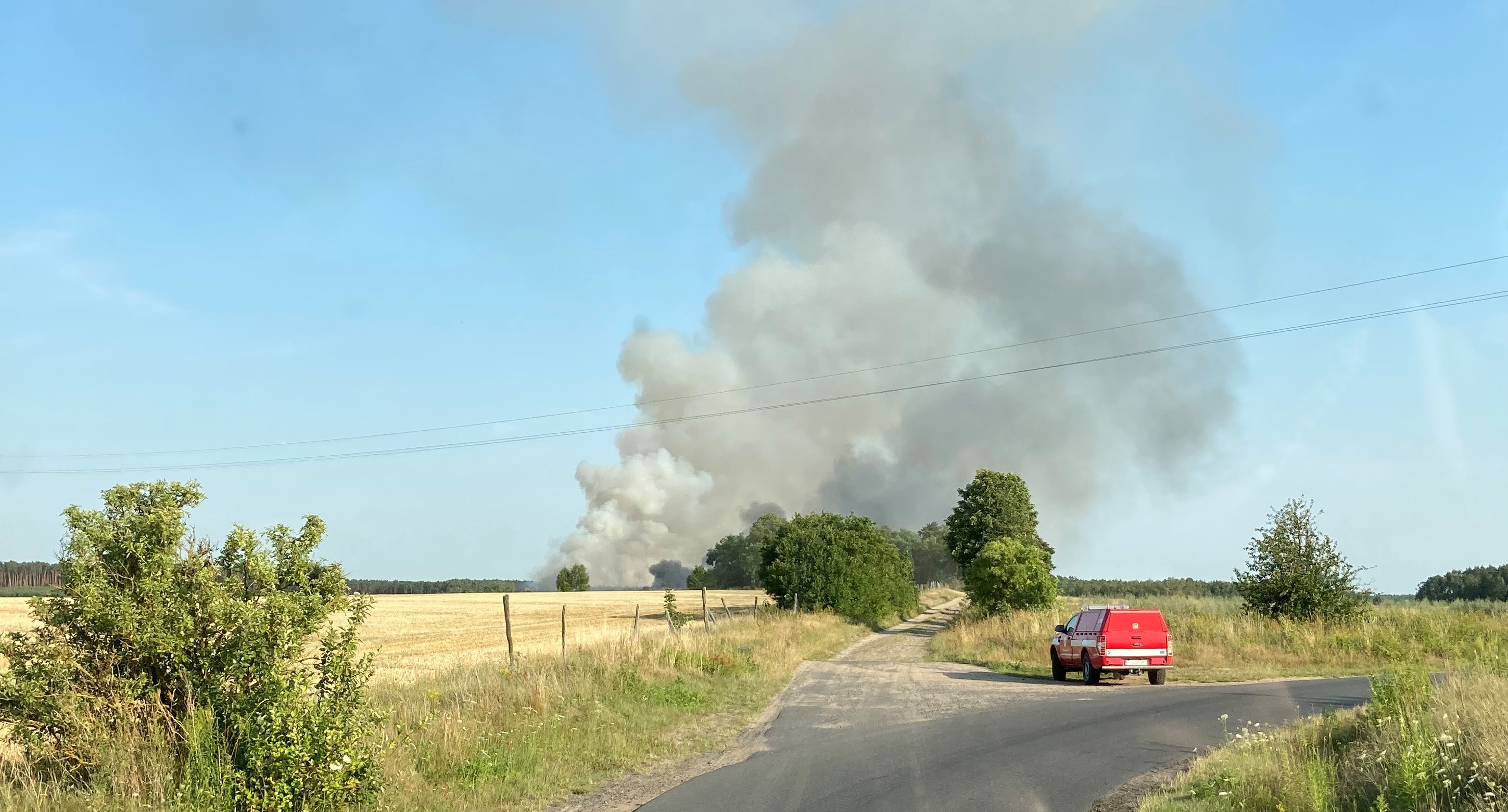 Po dojeździe zastępów na miejsce zdarzenia zastano pożar na polu o powierzchni 86 ha, spaleniu uległo 9 ha zboża na pniu (pszenżyto), ściernisko na powierzchni 6 ha oraz ciągnik rolniczy z przyczepą. Pożar rozprzestrzenił się również na 2 ha ścioły w lesie sosnowym (wiek 48 i 61 lat) oraz trawę w pasie drogowym autostrady A2 na długości ok. 300 m.